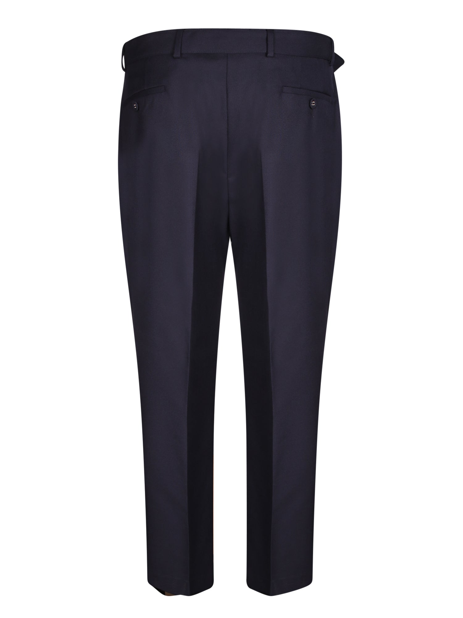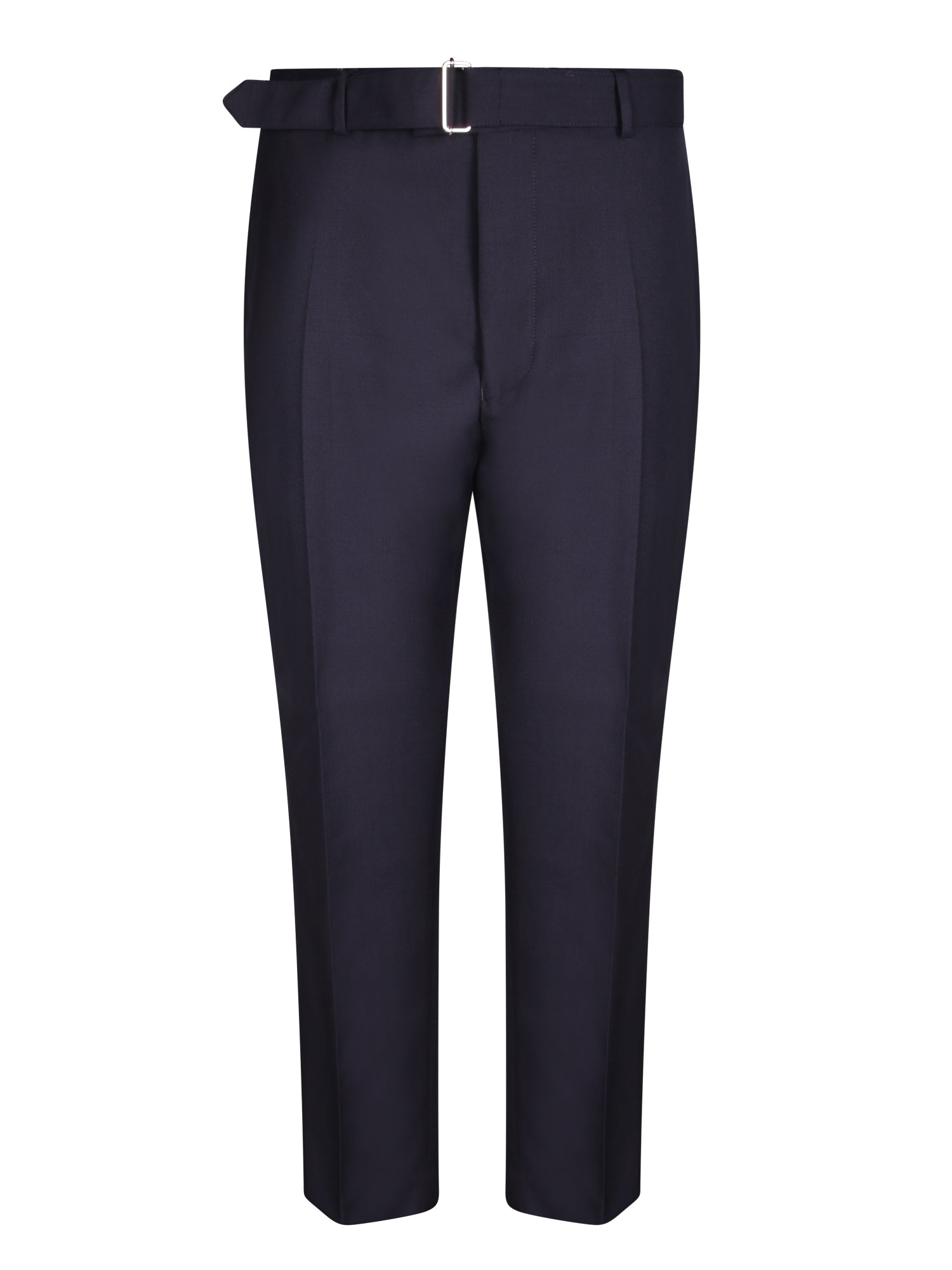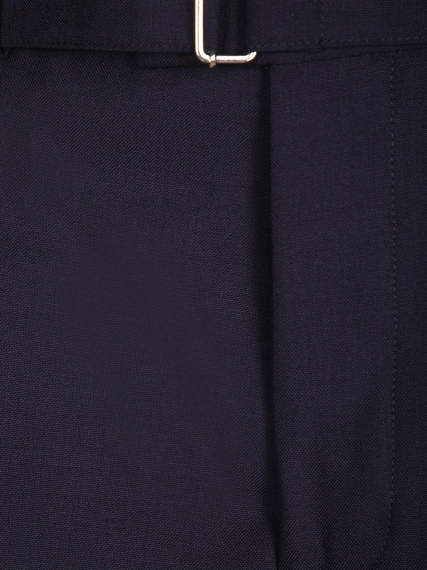 Triple-layer wool trousers, high-quality and durable fabric. Front zip and button closure, belt loops with buckle detail.