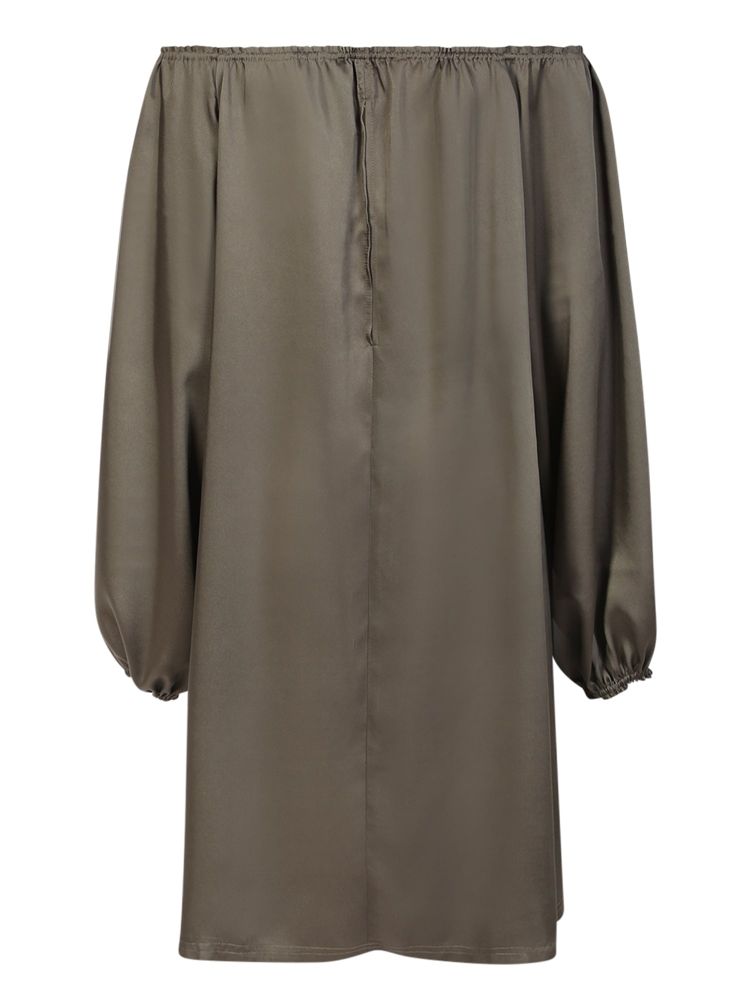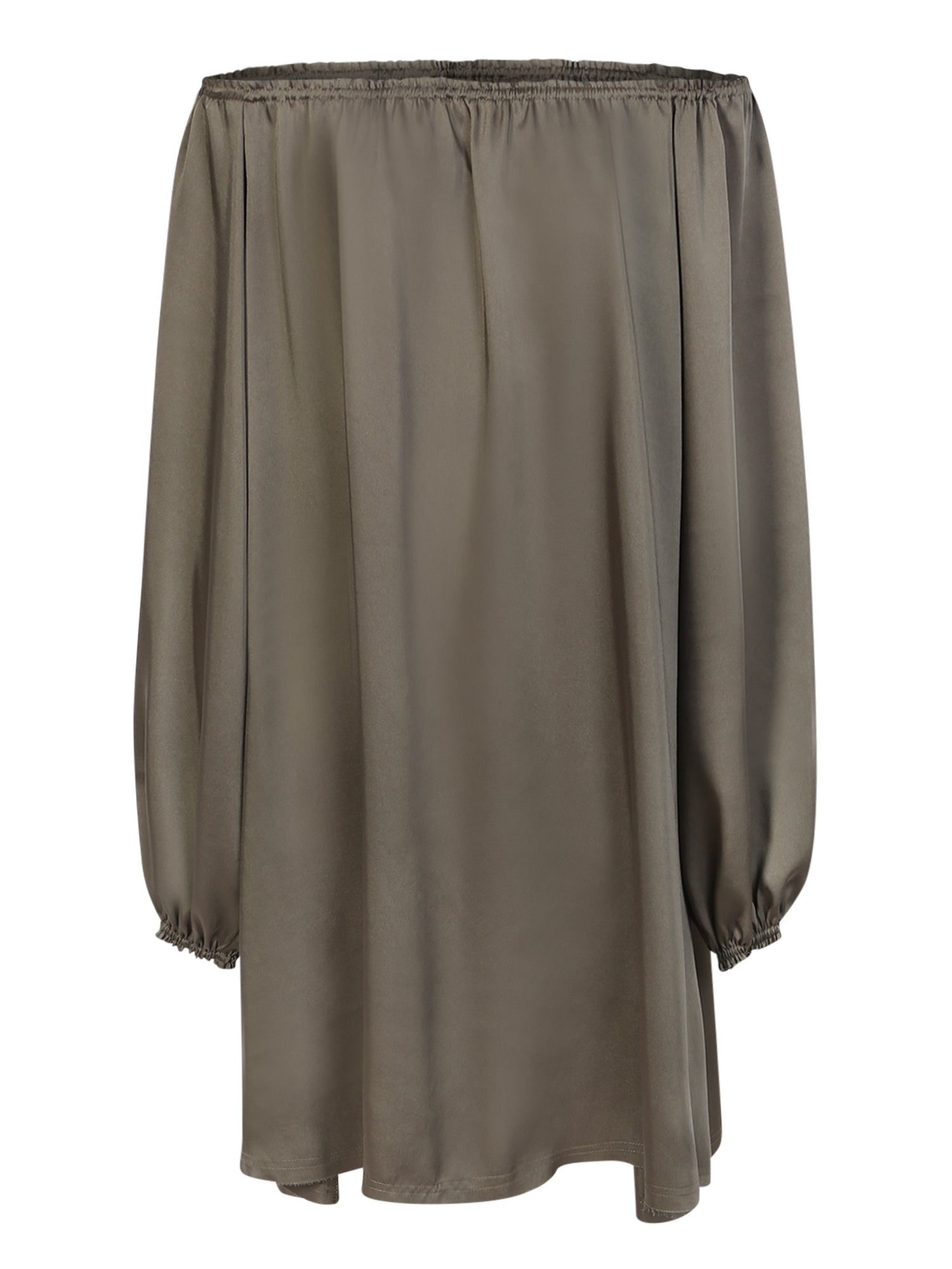 Boat neckline. Stretch neckline. Long sleeves. Elasticated cuffs. Loose fit. Thigh-high. Straight hem. Color: military green