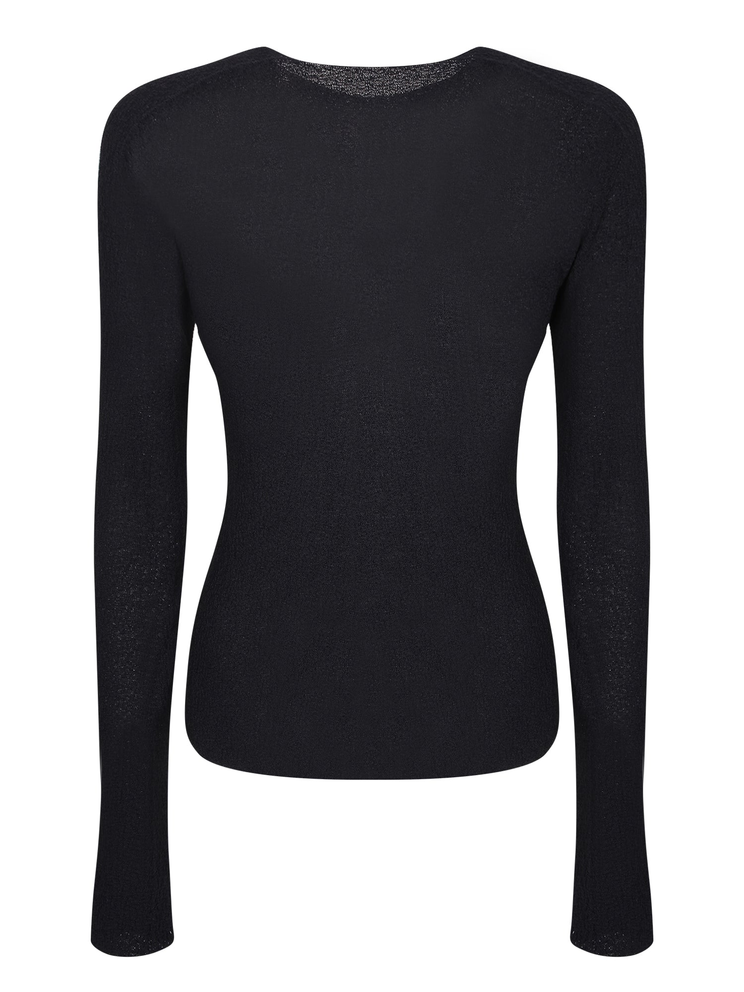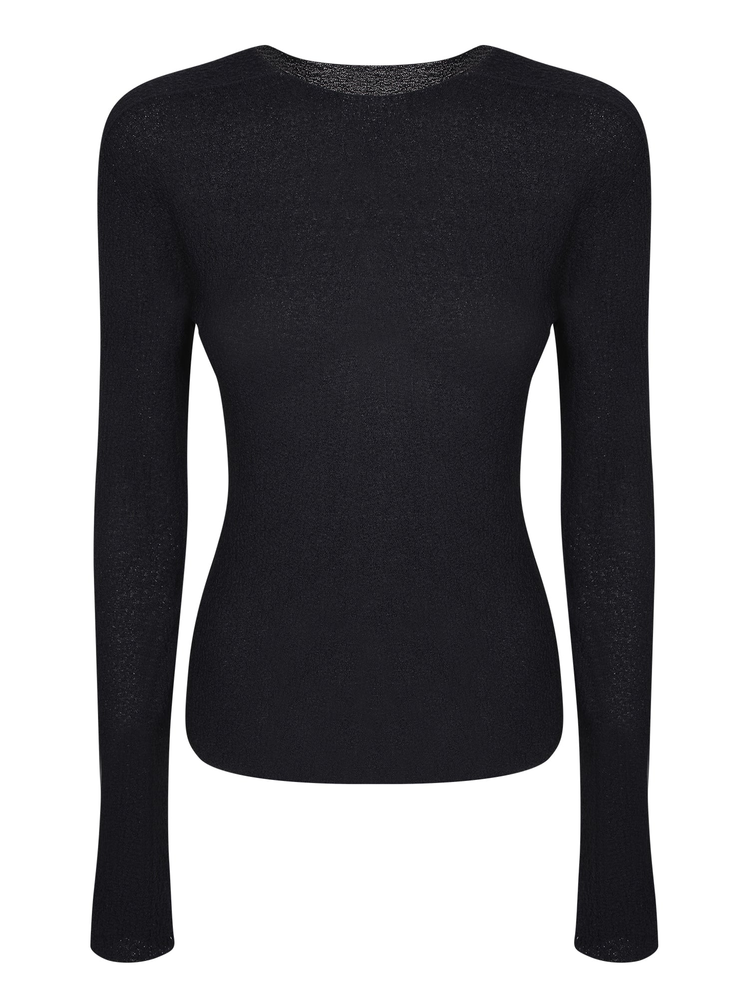 Long sleeve sweater. Fine knit fabric. Uniform black color.