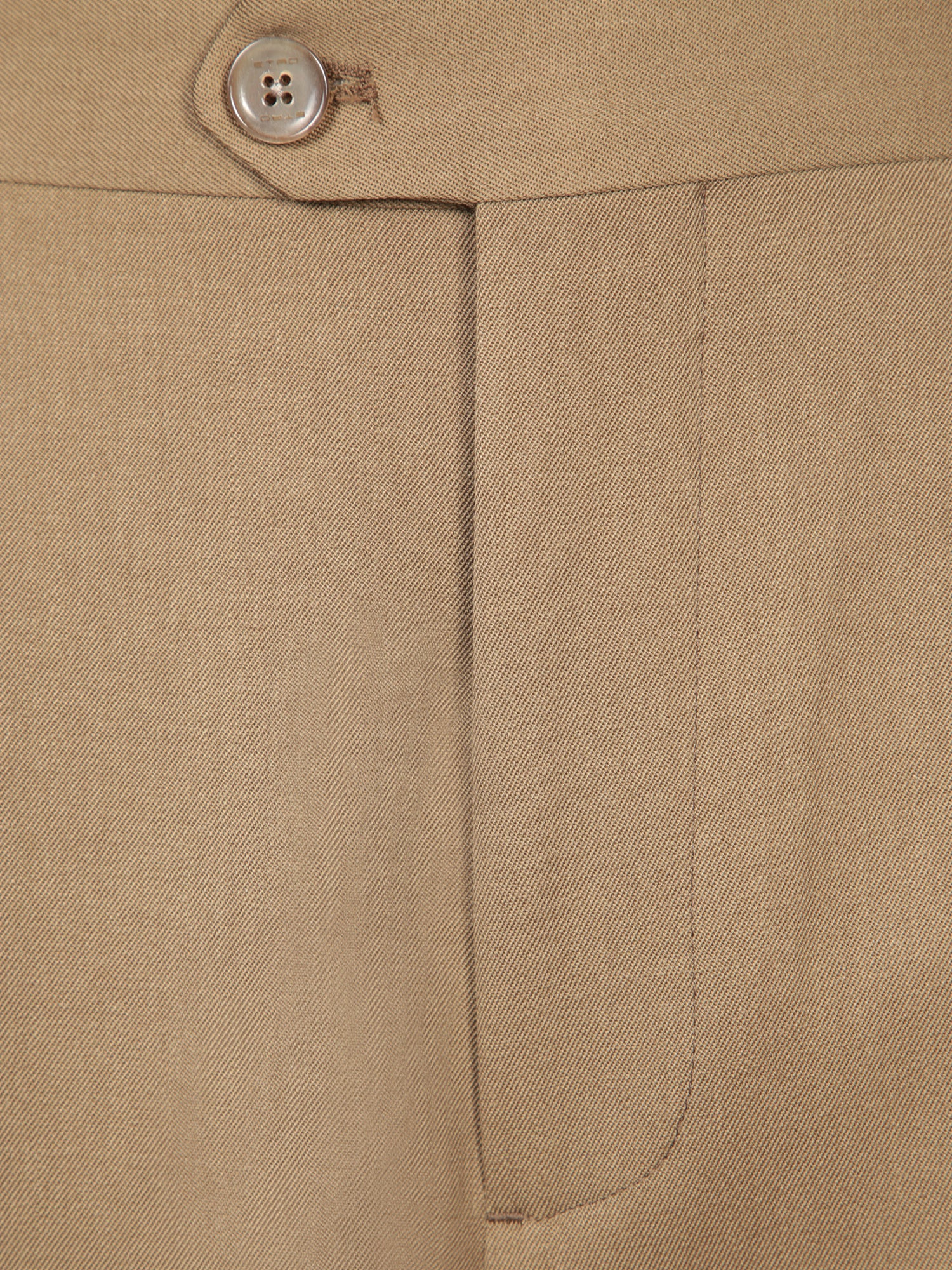 Zip and button closure. Back welt pockets. Belt loops.