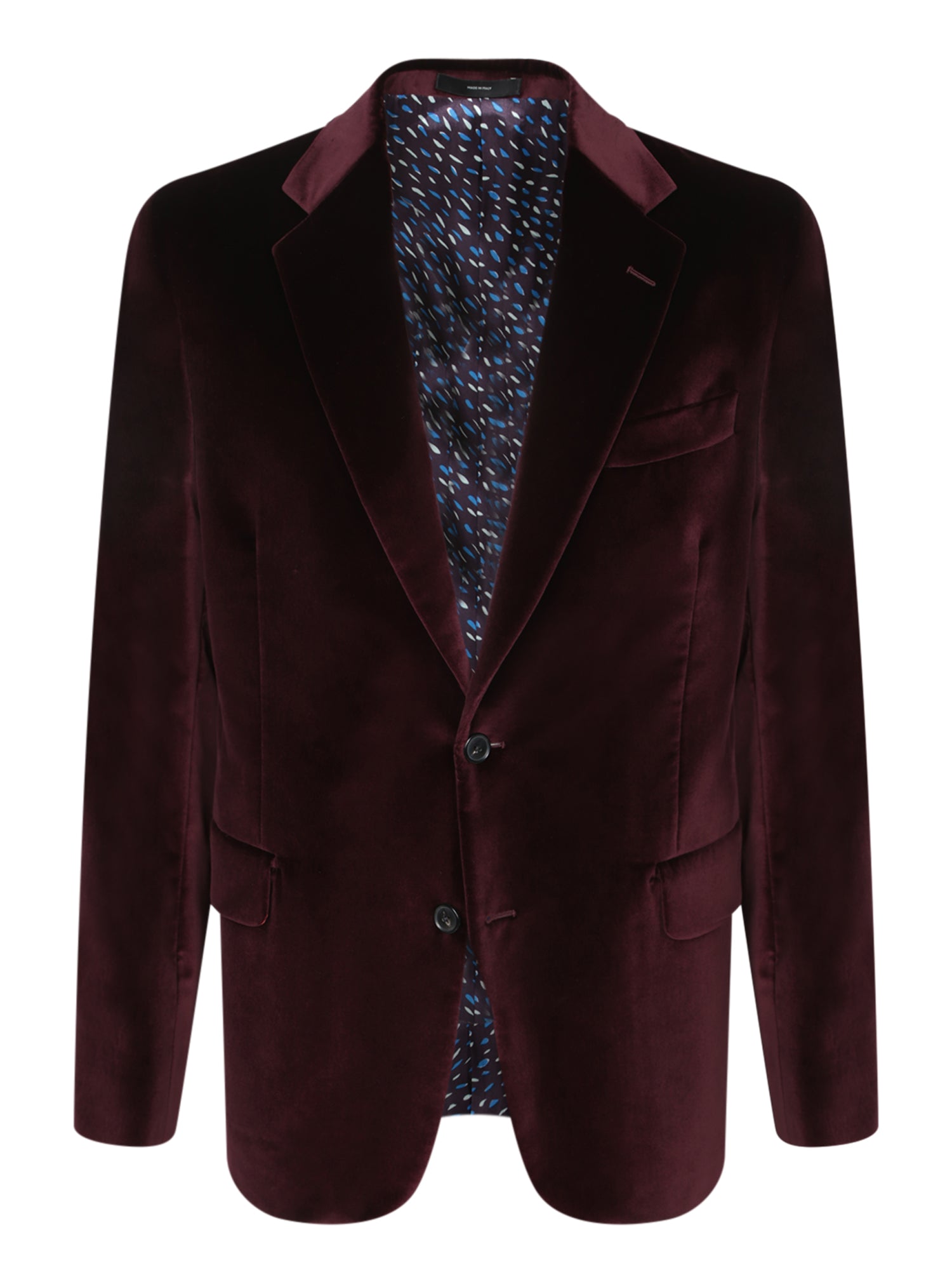This Paul Smith jacket features elegant burgundy velvet with dark lapels, blending classic design with modern details like the patterned lining. Perfect for formal occasions or as a standout piece in a casual chic outfit.
