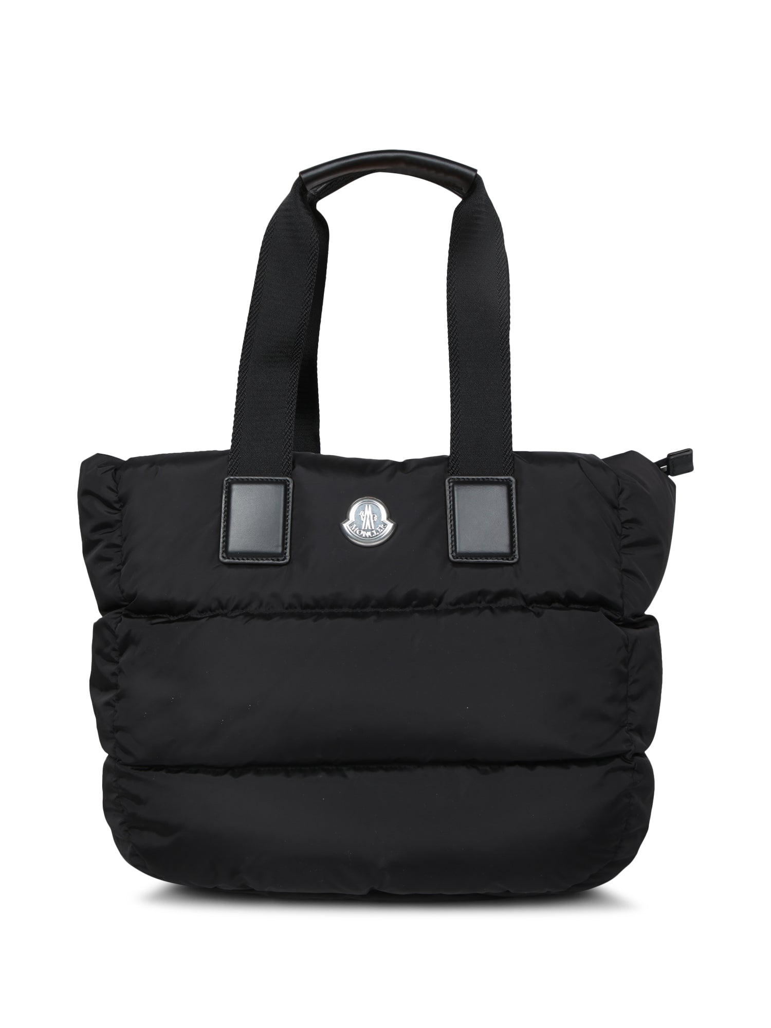 The Moncler Caradoc tote bag blends elegance and functionality with a padded design in shiny black technical fabric, providing exceptional durability and a sleek aesthetic.