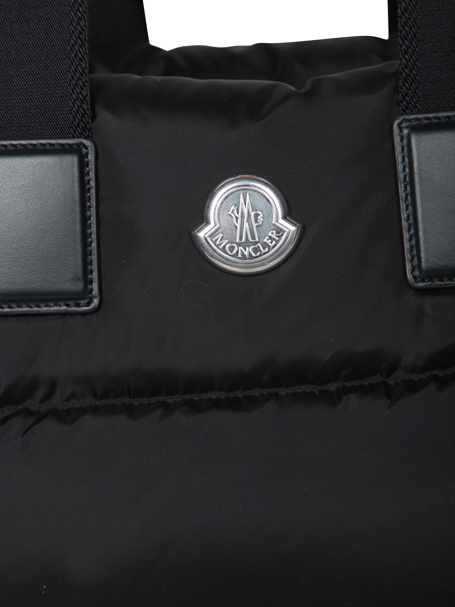 Shiny black technical fabric. Sturdy fabric handles. Silver Moncler logo.
