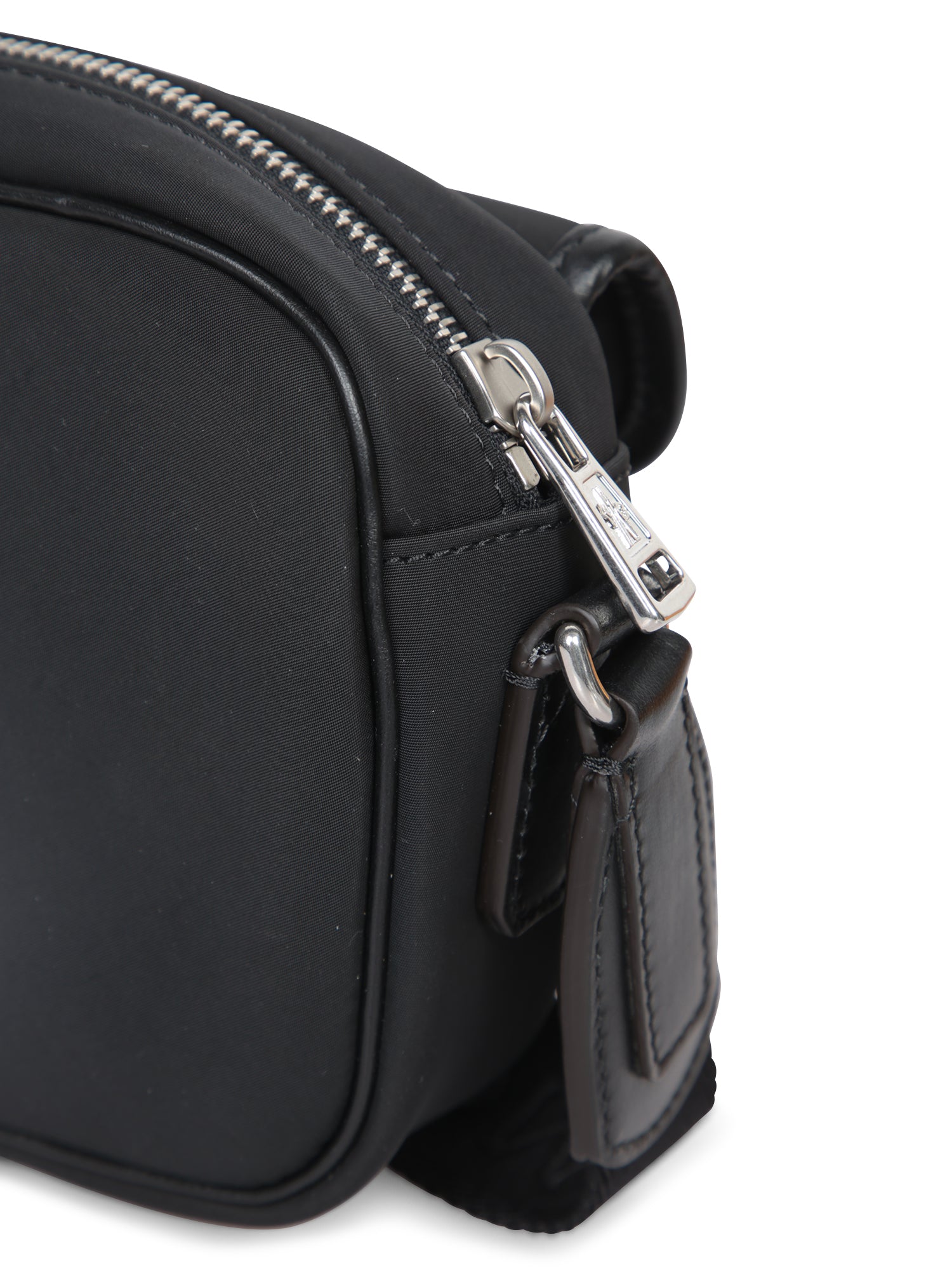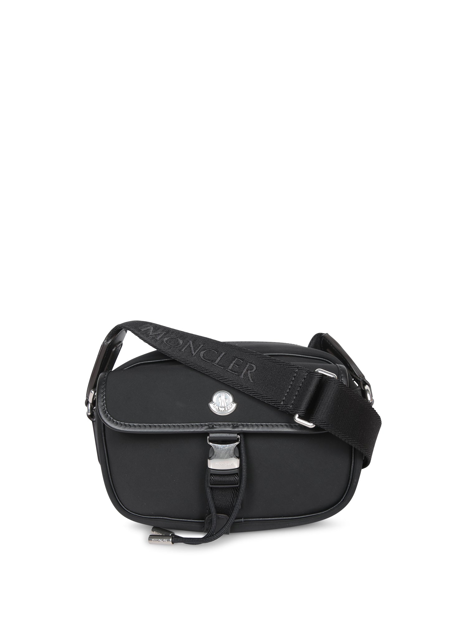 Black technical fabric shoulder bag. Embossed Moncler logo. Zip closure.
