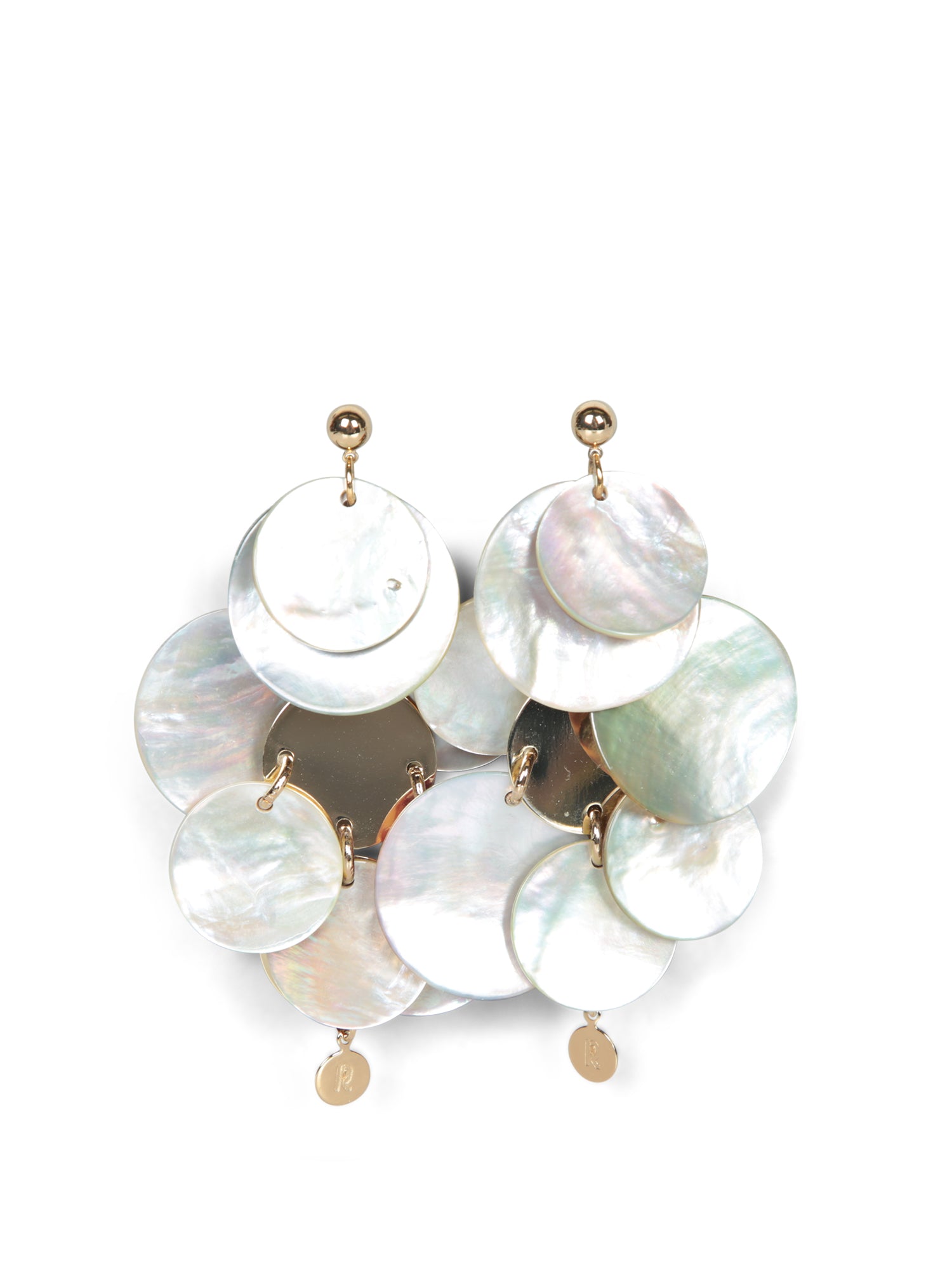 Explore sophisticated elegance with Paco Rabanne's Coquillage Cascade Earrings. This charming design blends the iridescence of mother-of-pearl with golden accents, making it an ideal accessory to add a touch of luxury to any ensemble.