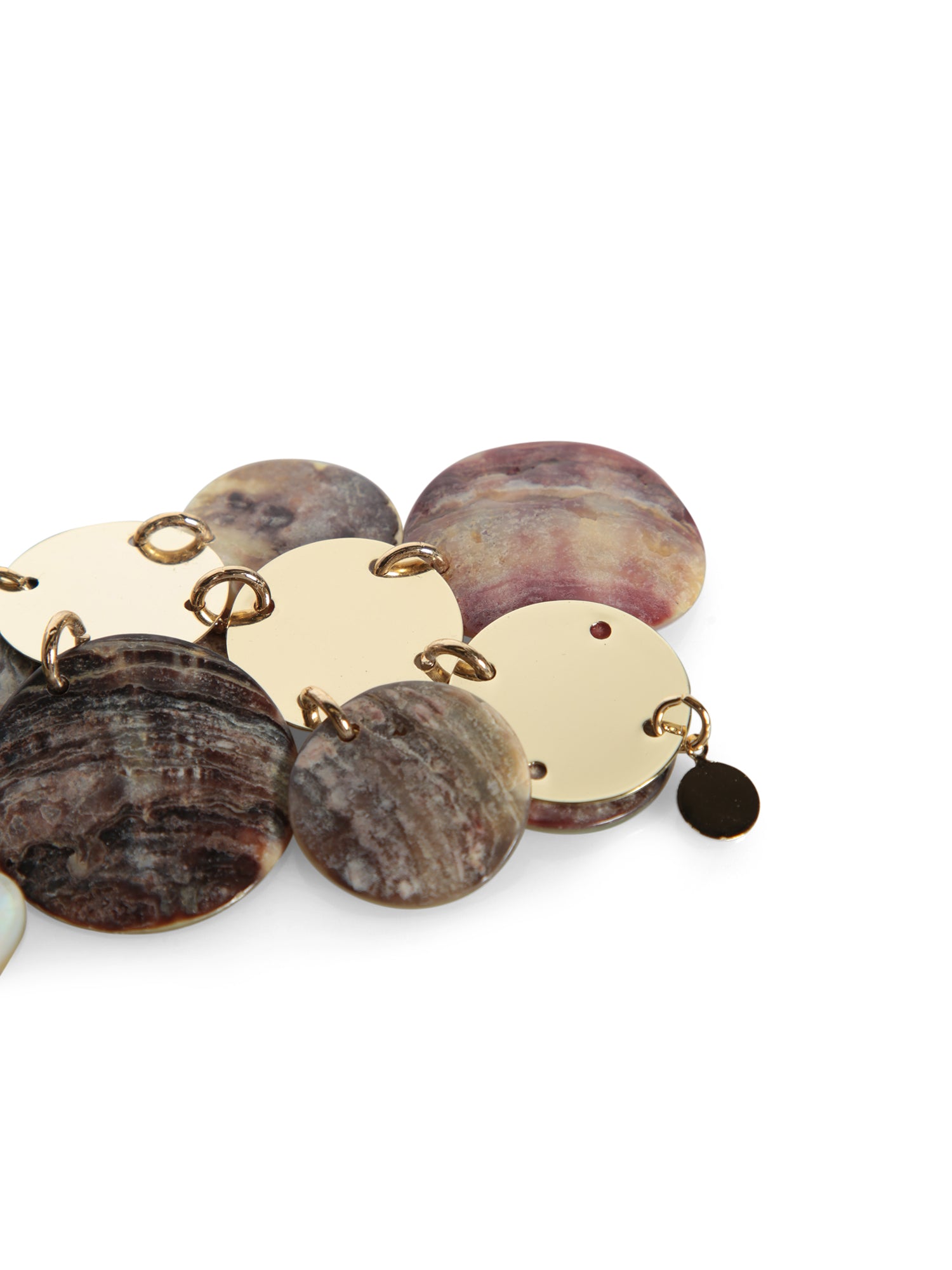 Drop earrings with mother-of-pearl discs. Golden stud closure. Engraved logo detail.