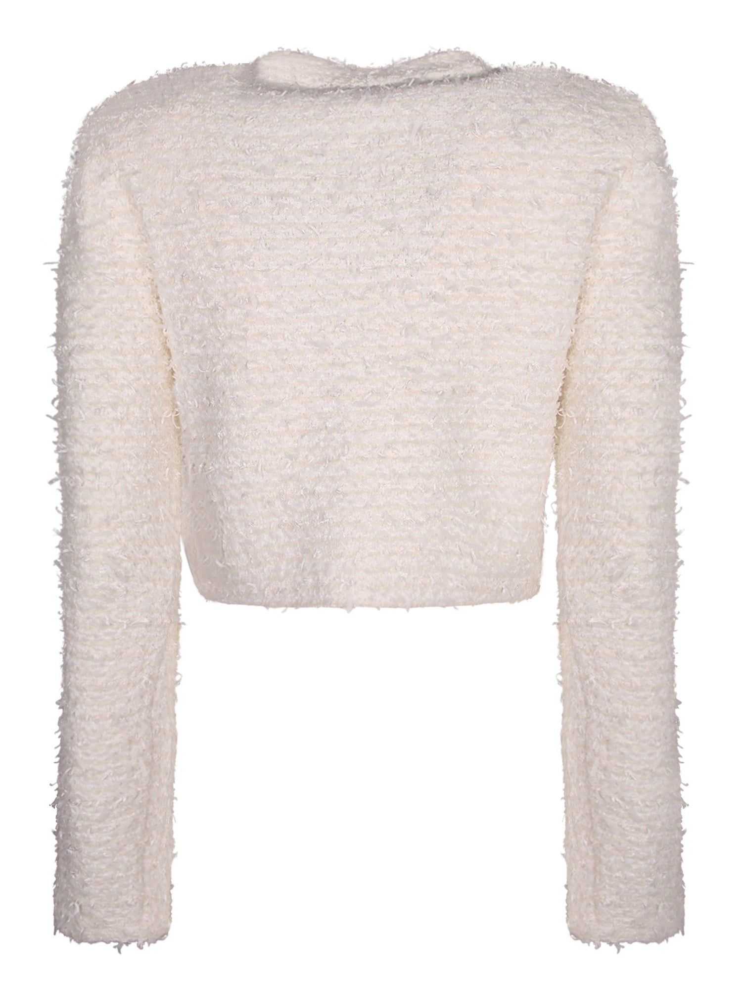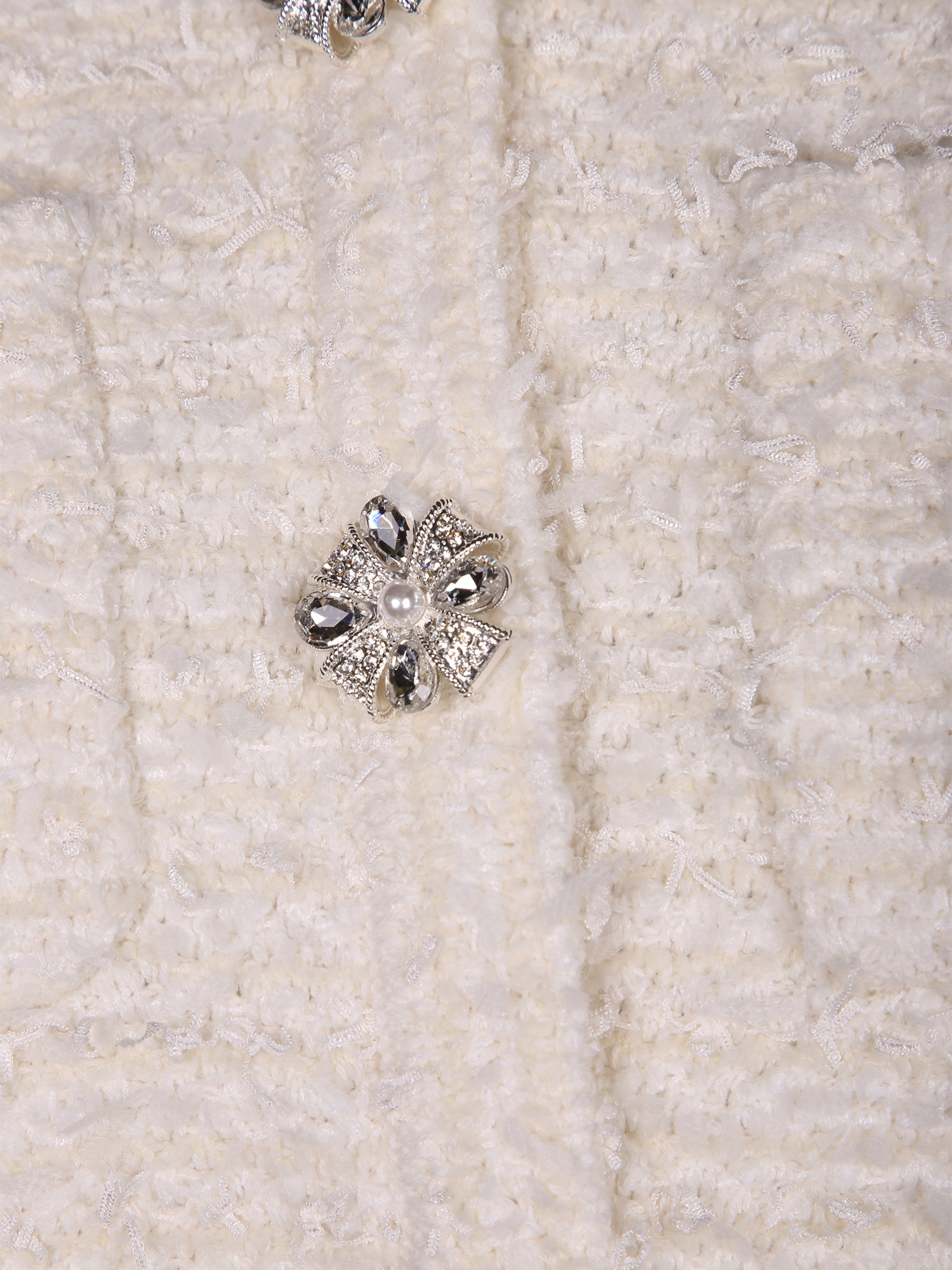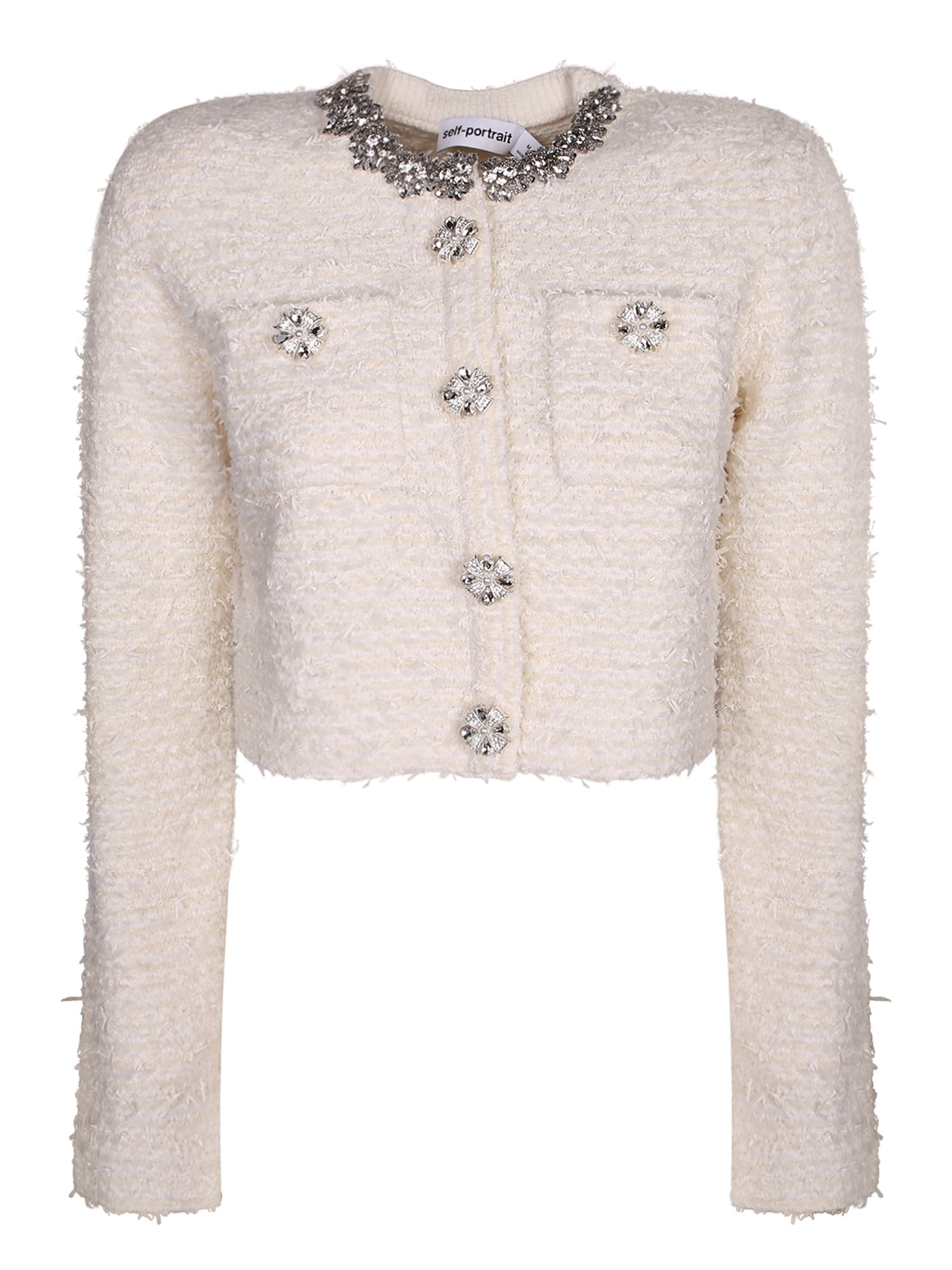 Cardigan in soft bouclé fabric. Jewel-embellished collar and decorative button front closure.