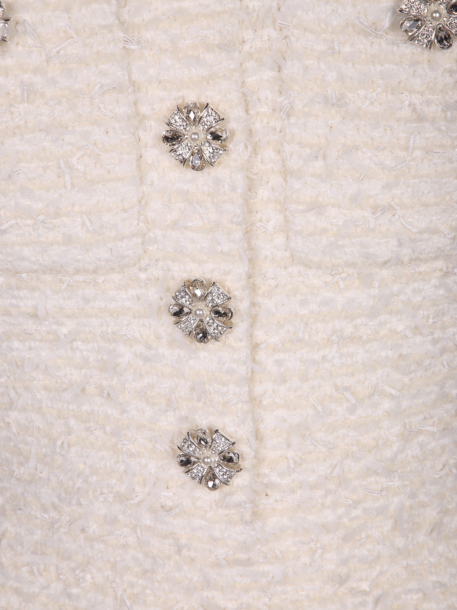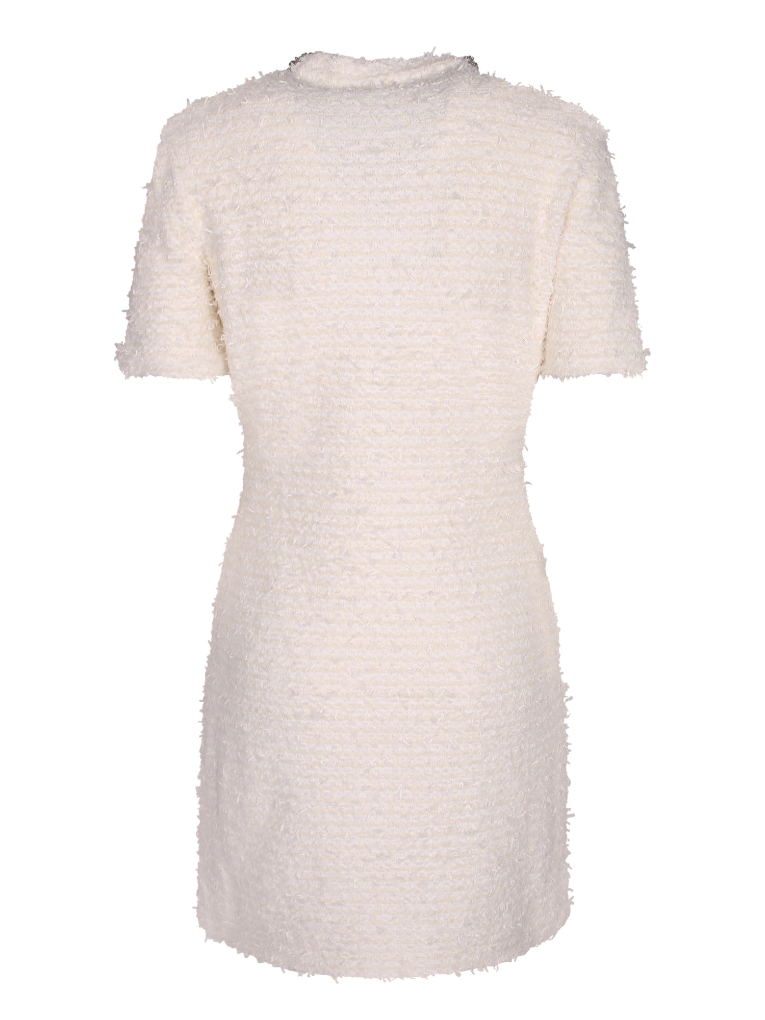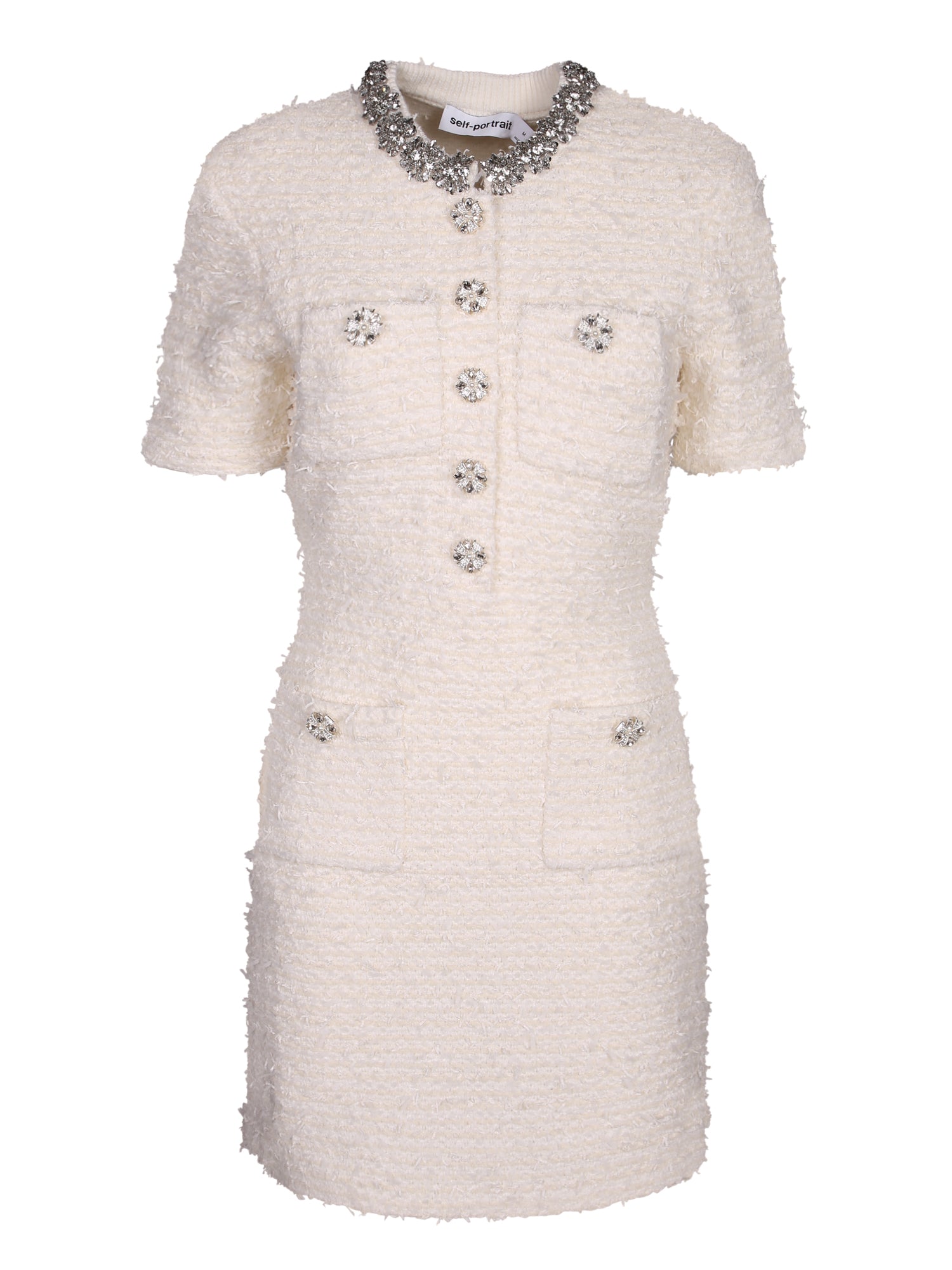 Short-sleeved knit dress. Bead and crystal details on the collar and along the front.