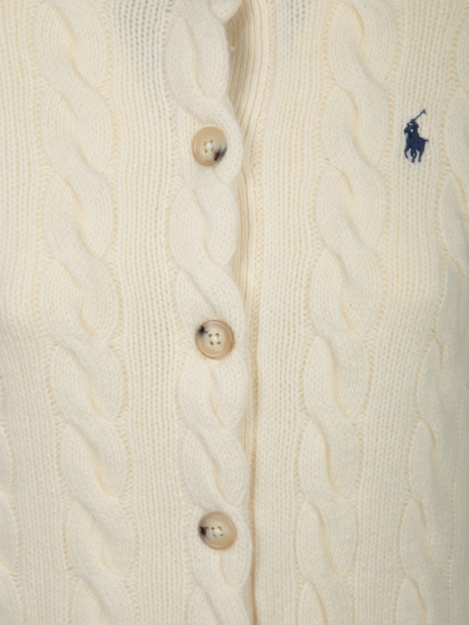 Wool and cashmere knit cardigan. Features button closure and an embroidered logo on the chest.