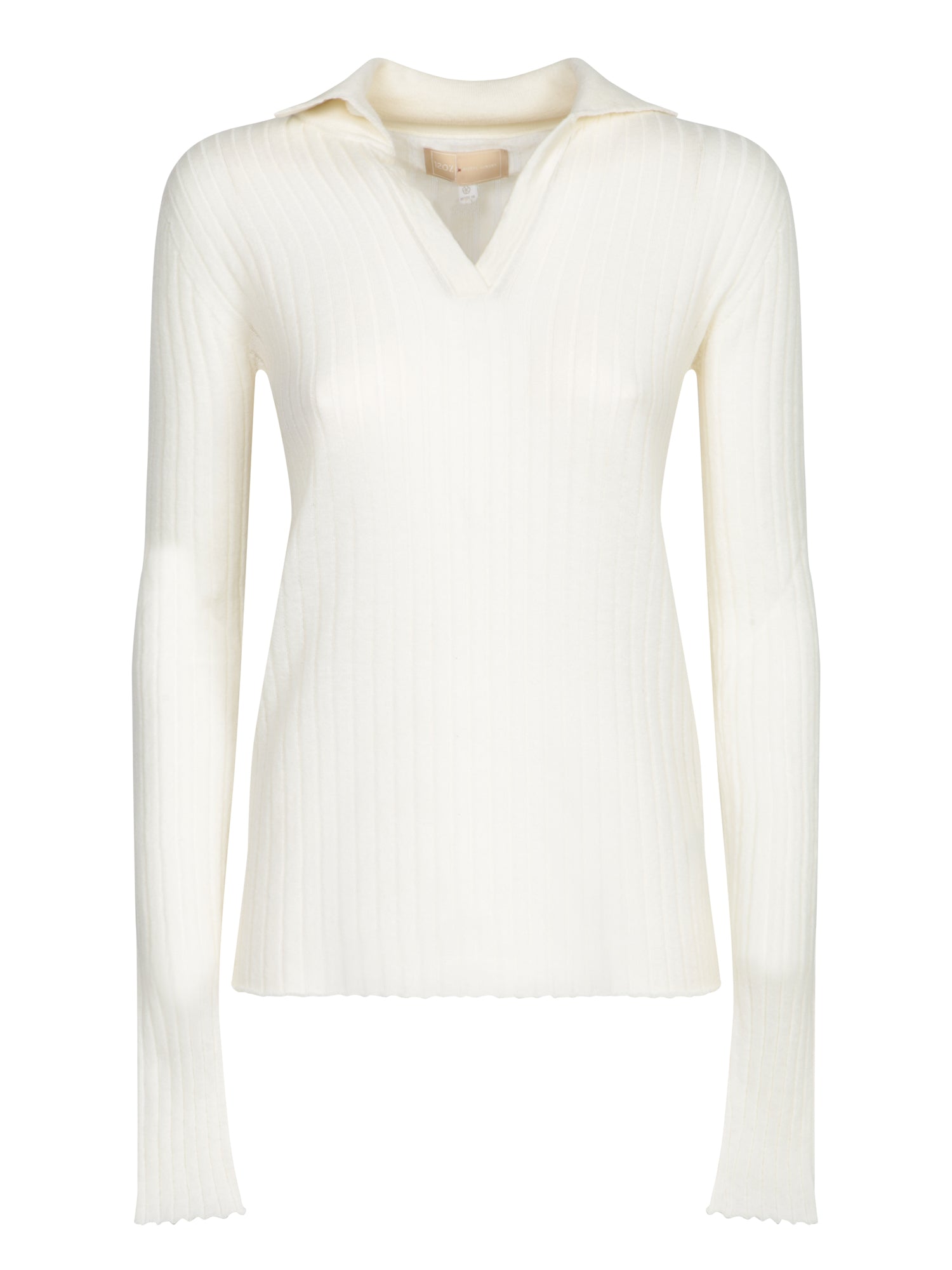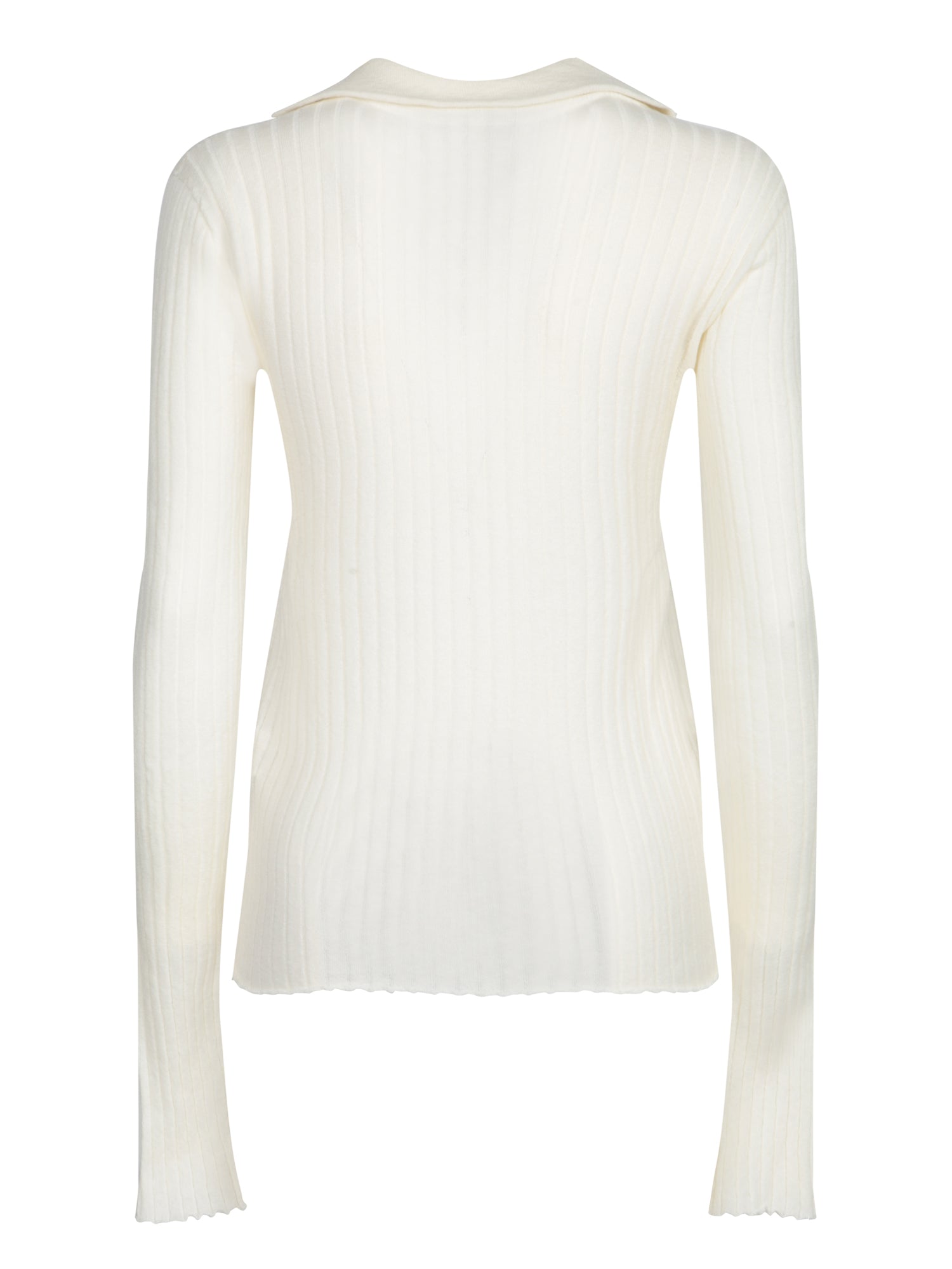 Long-sleeve wool polo. V-neck with ribbed detailing. Shaped sleeve edges.