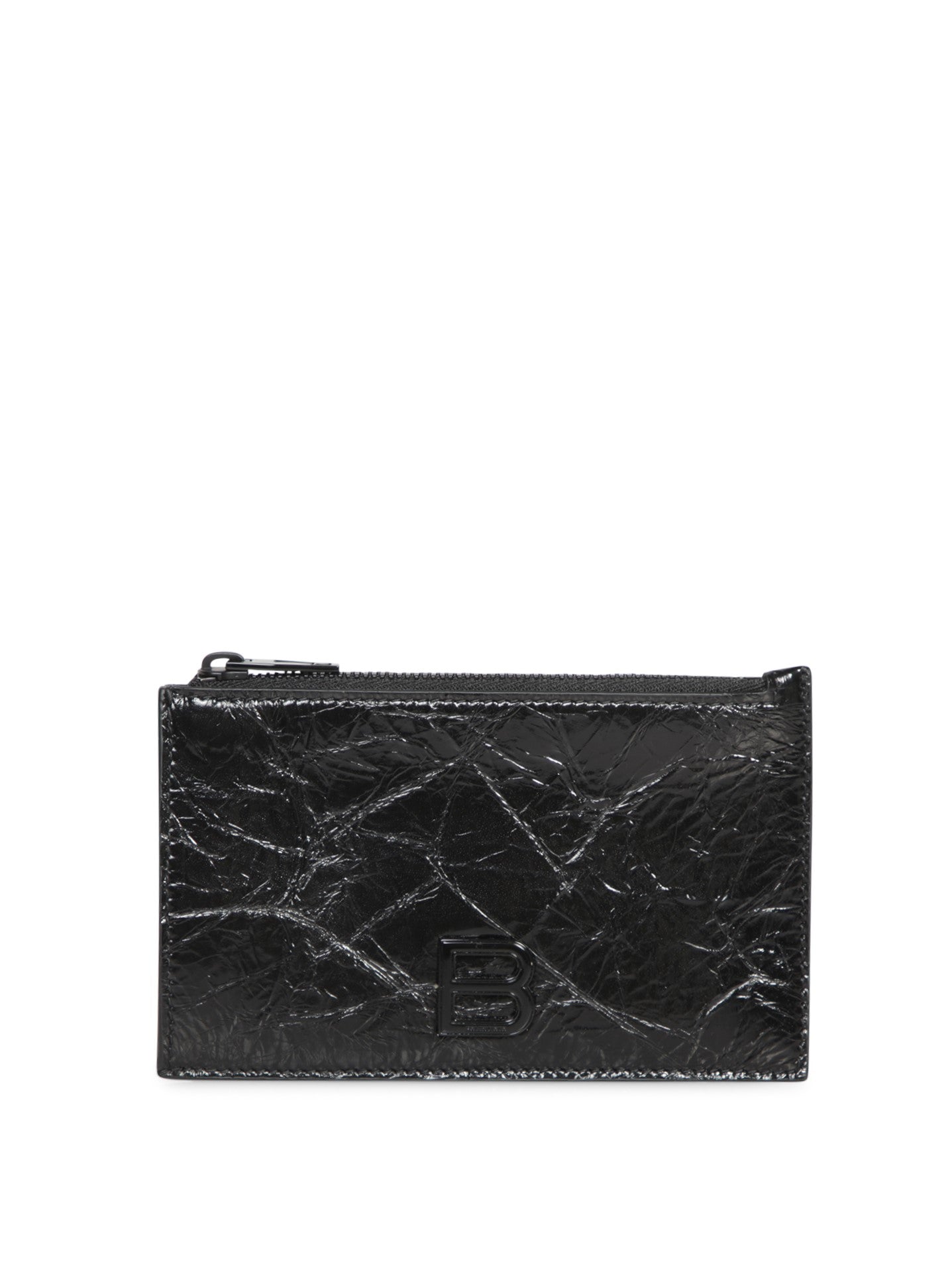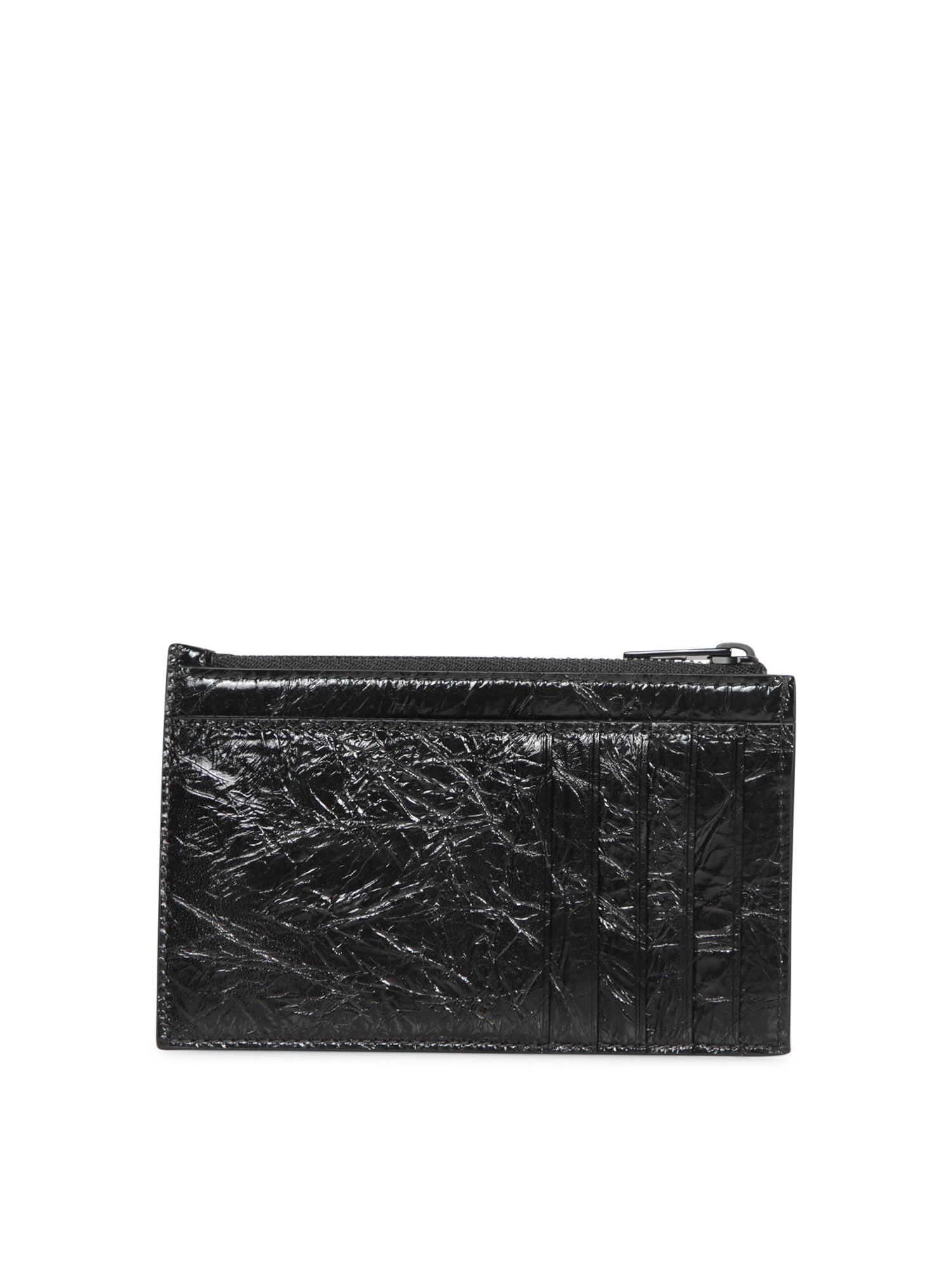 Leather card holder with textured surface, top zip closure, embossed Balenciaga logo.