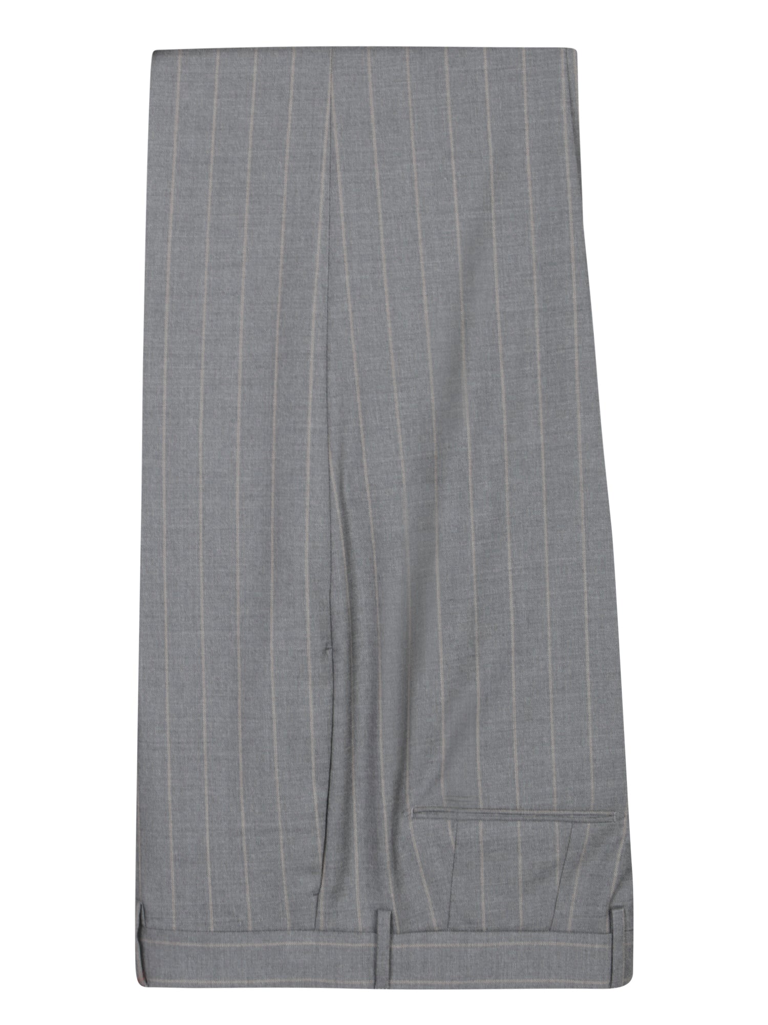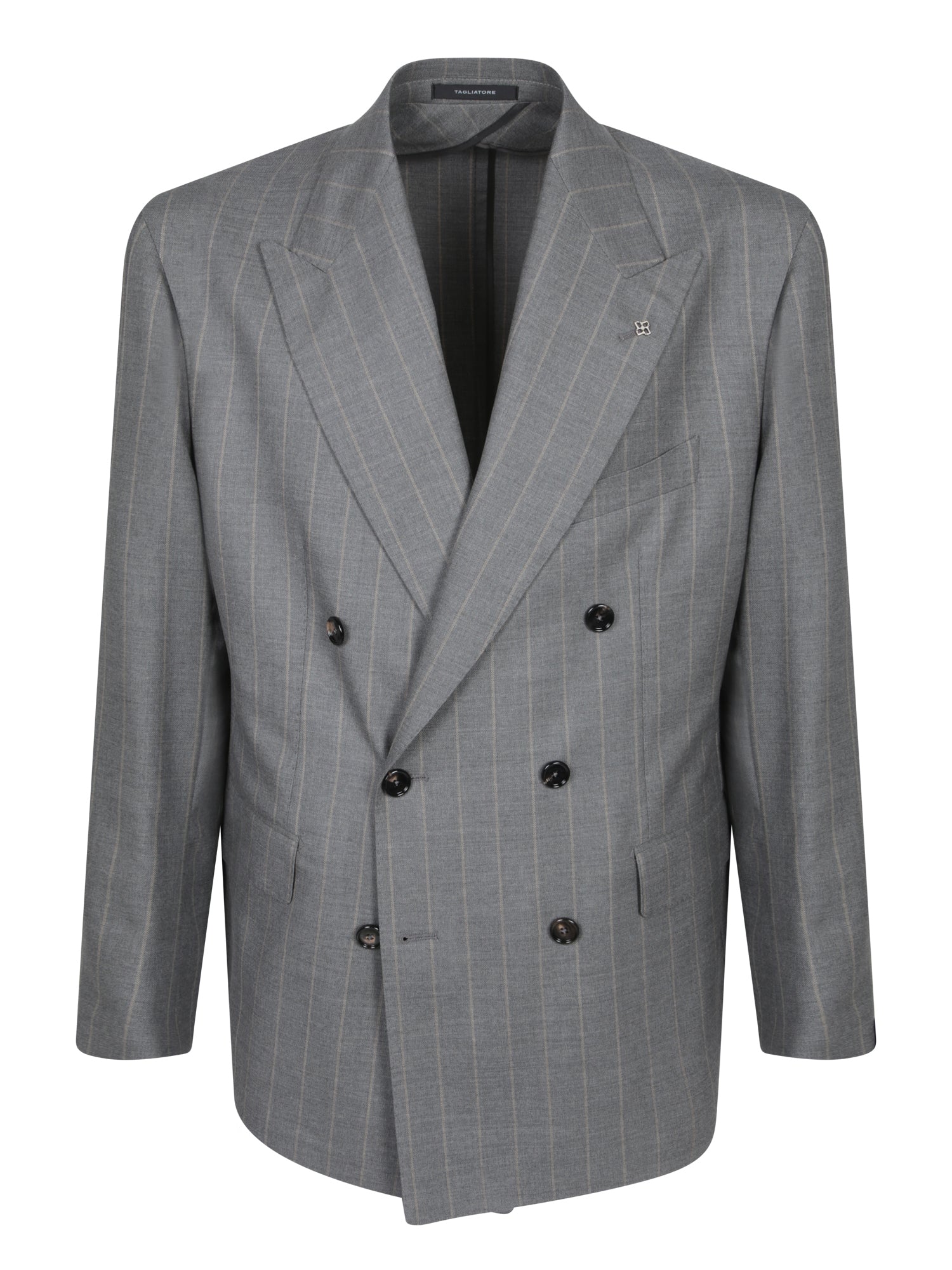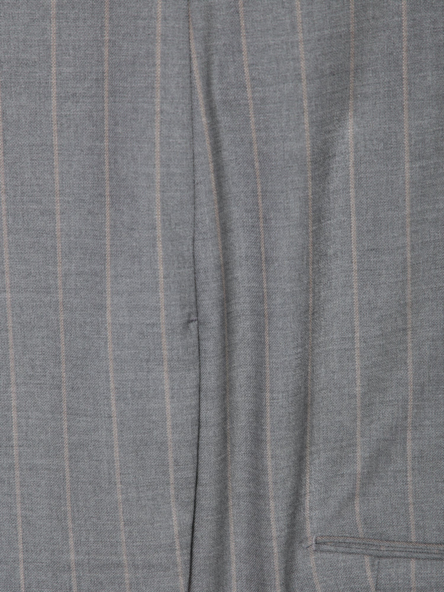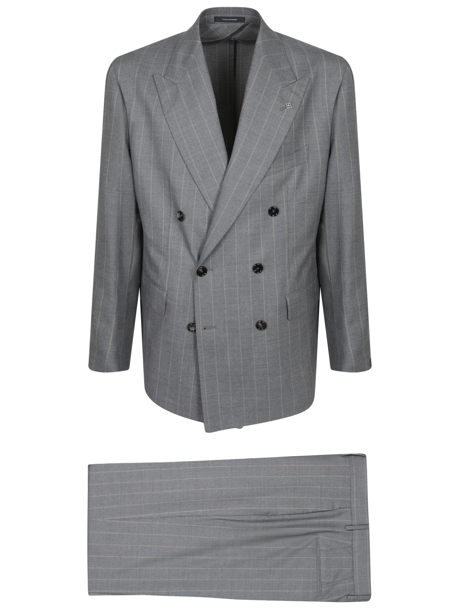 Tailored double-breasted light grey/beige pinstripe wool suit. Features engraved button closure and patch pockets.