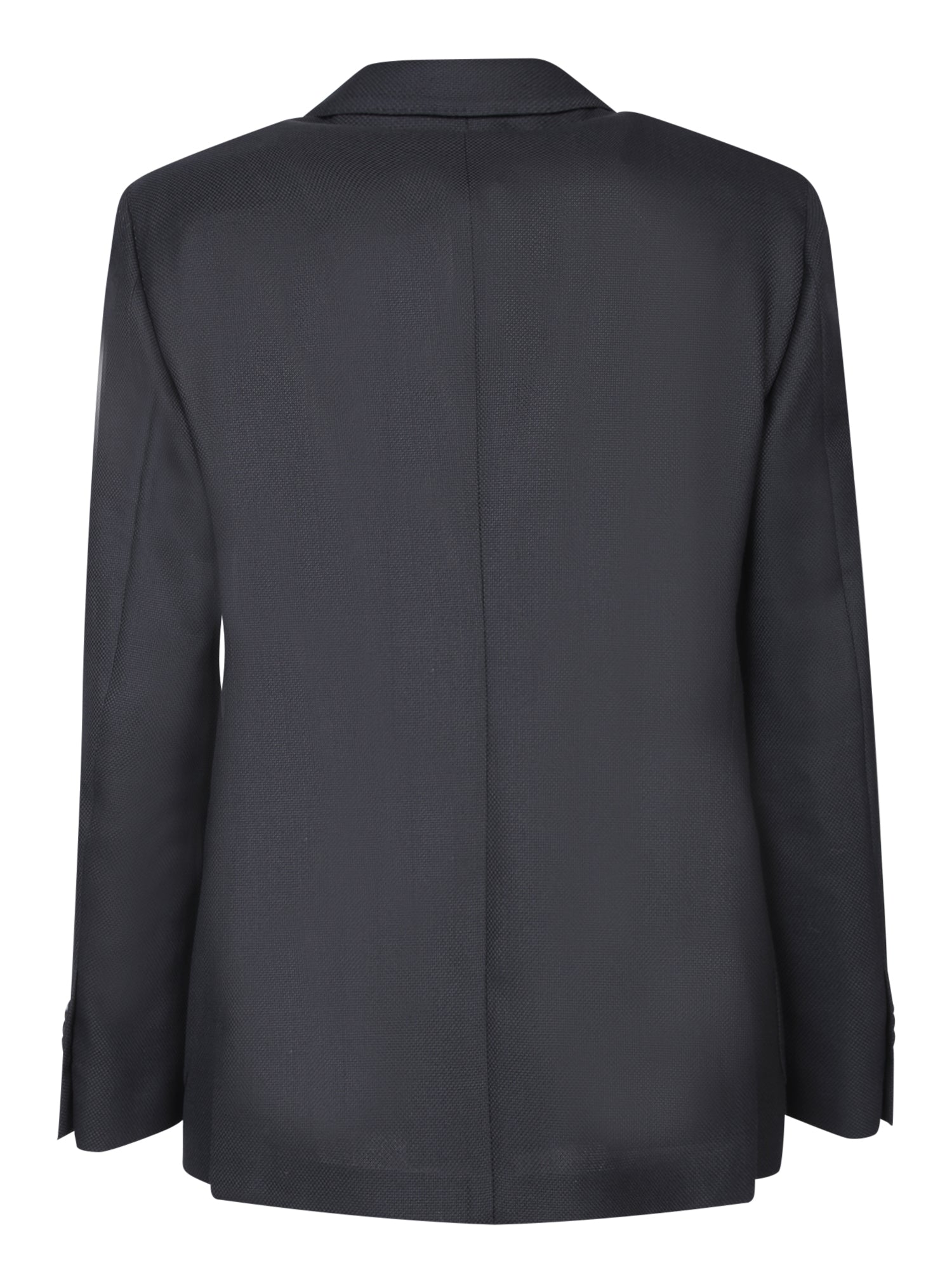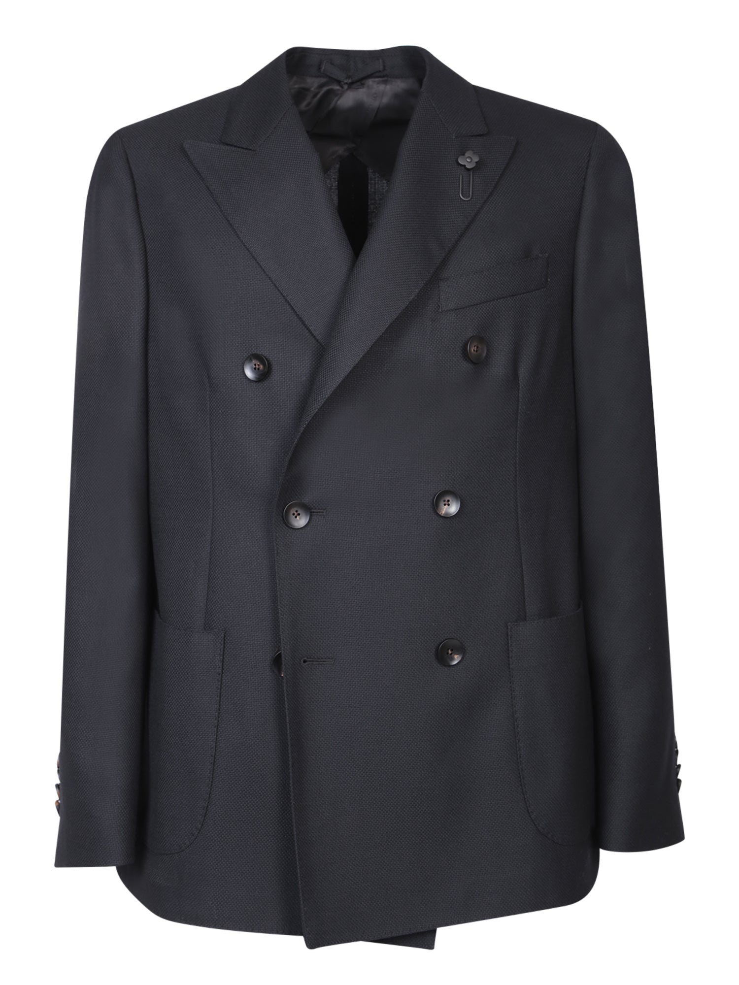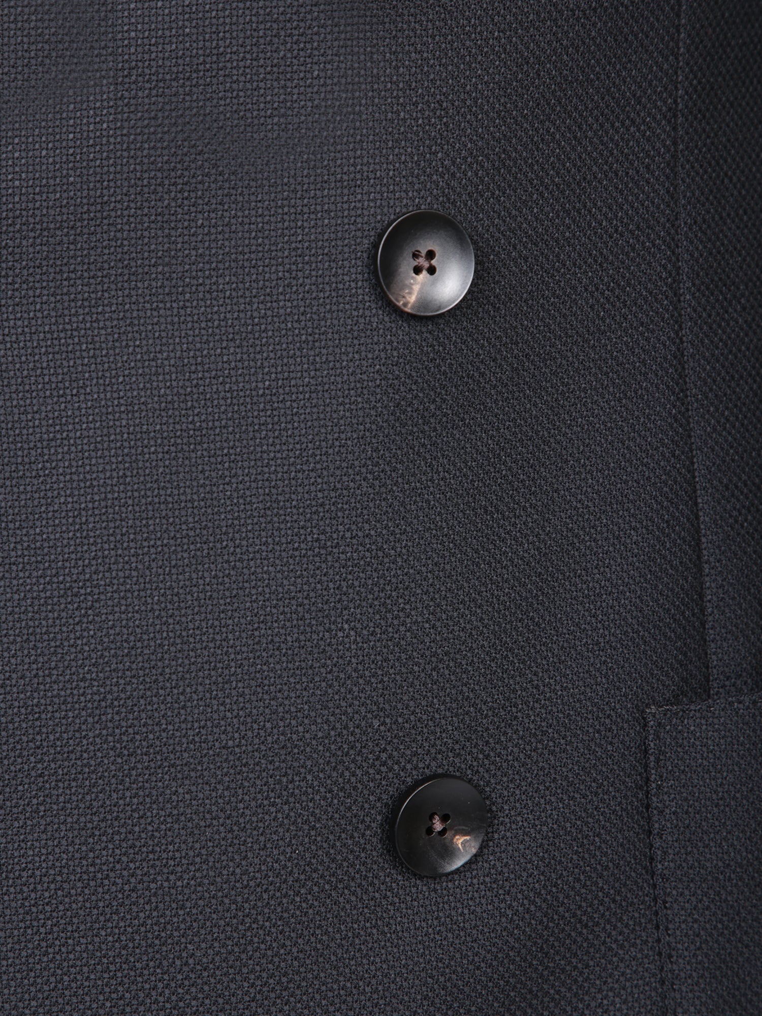 Double-breasted jacket crafted from wool fabric, featuring shiny black buttons, flap pockets, and a welt pocket on the chest.