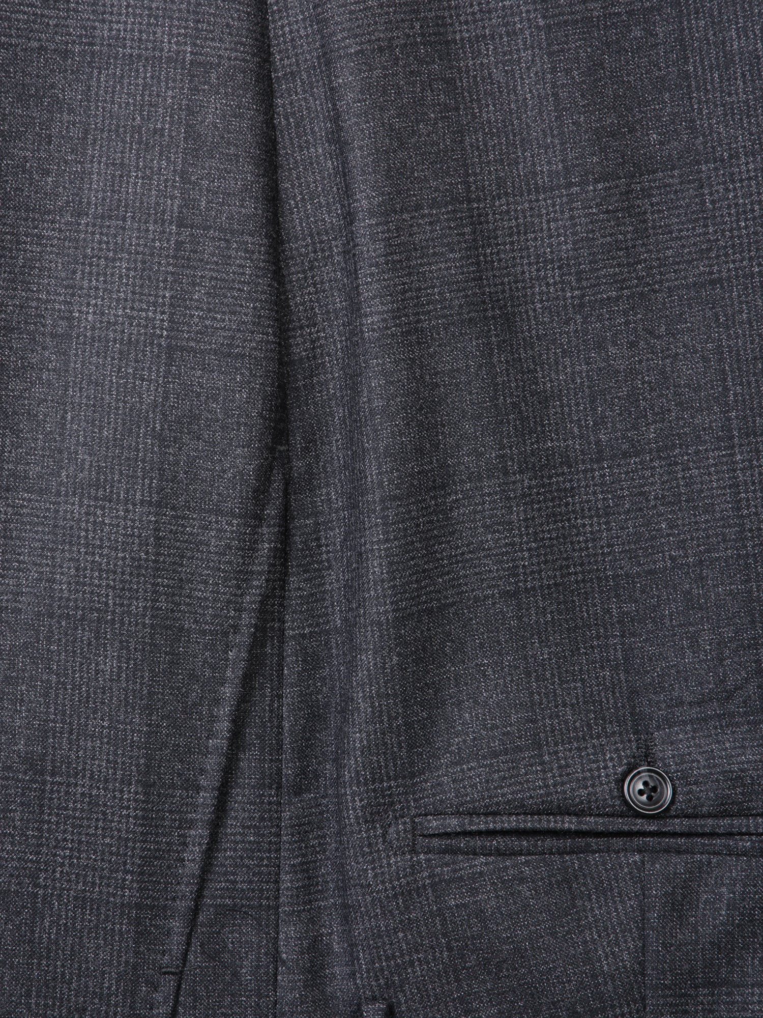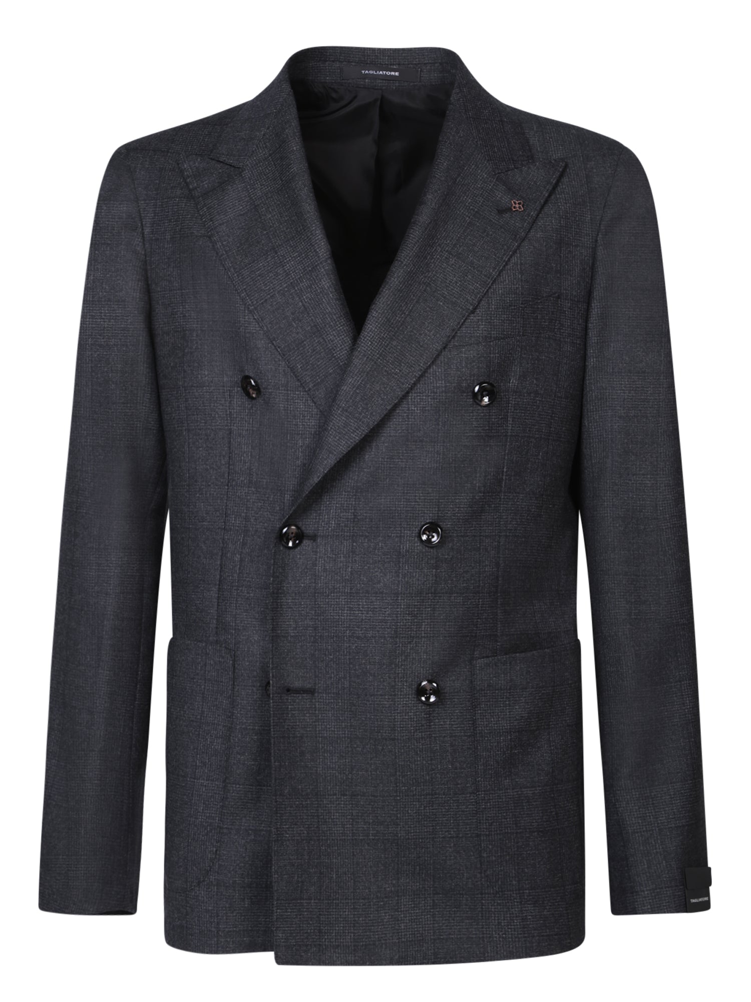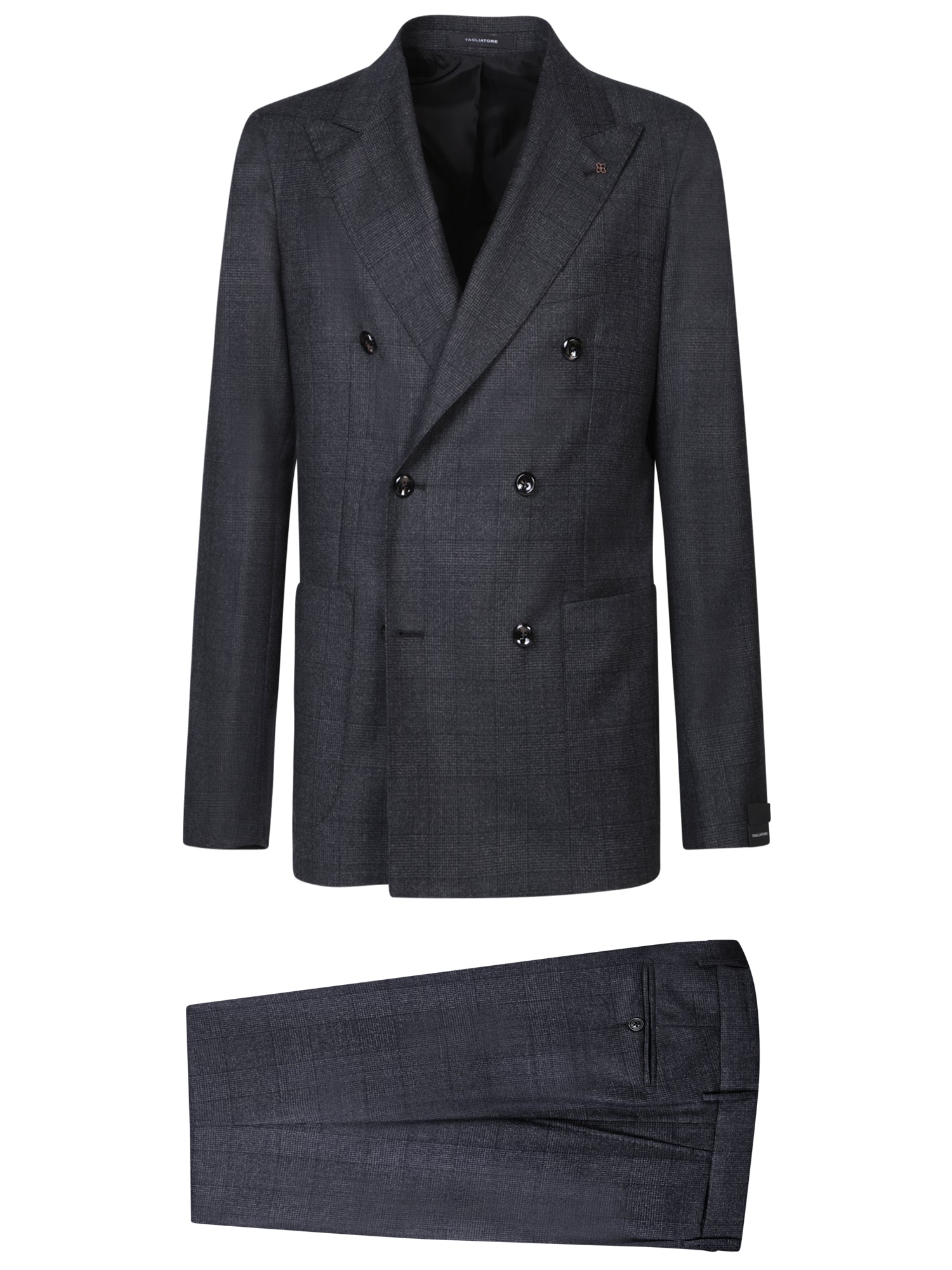 Double-breasted wool suit featuring a six-button design, classic lapels, and welt pockets.