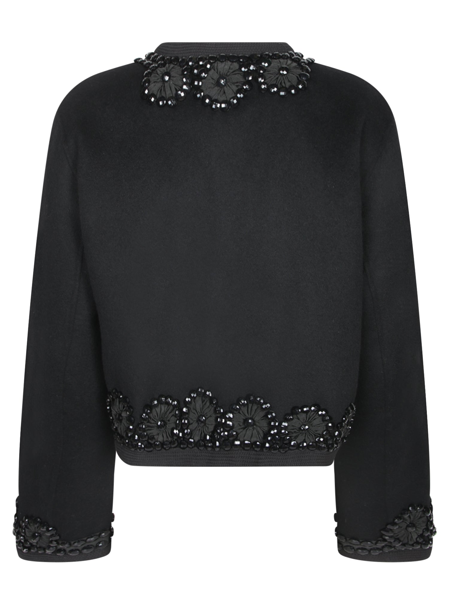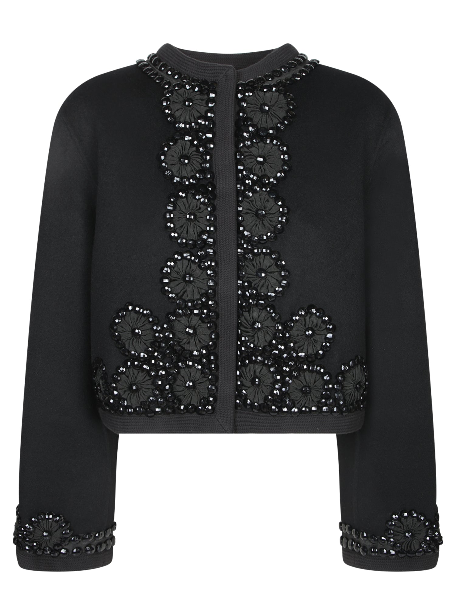 Jacket featuring raised floral embroidery, frontal zip closure, and ribbed fabric trims.