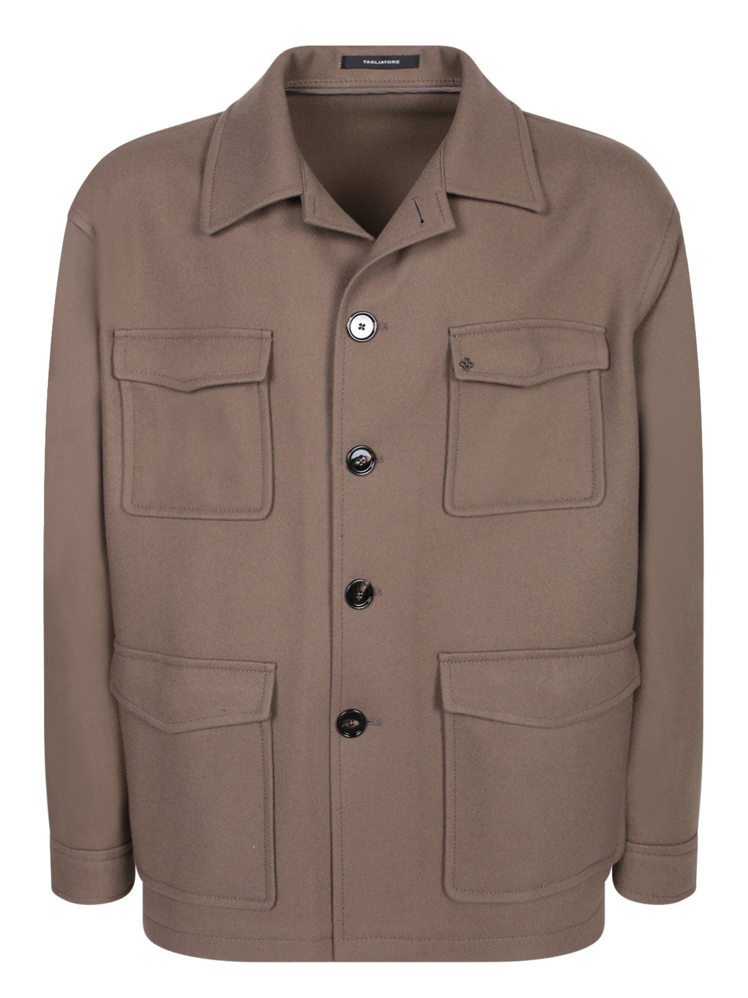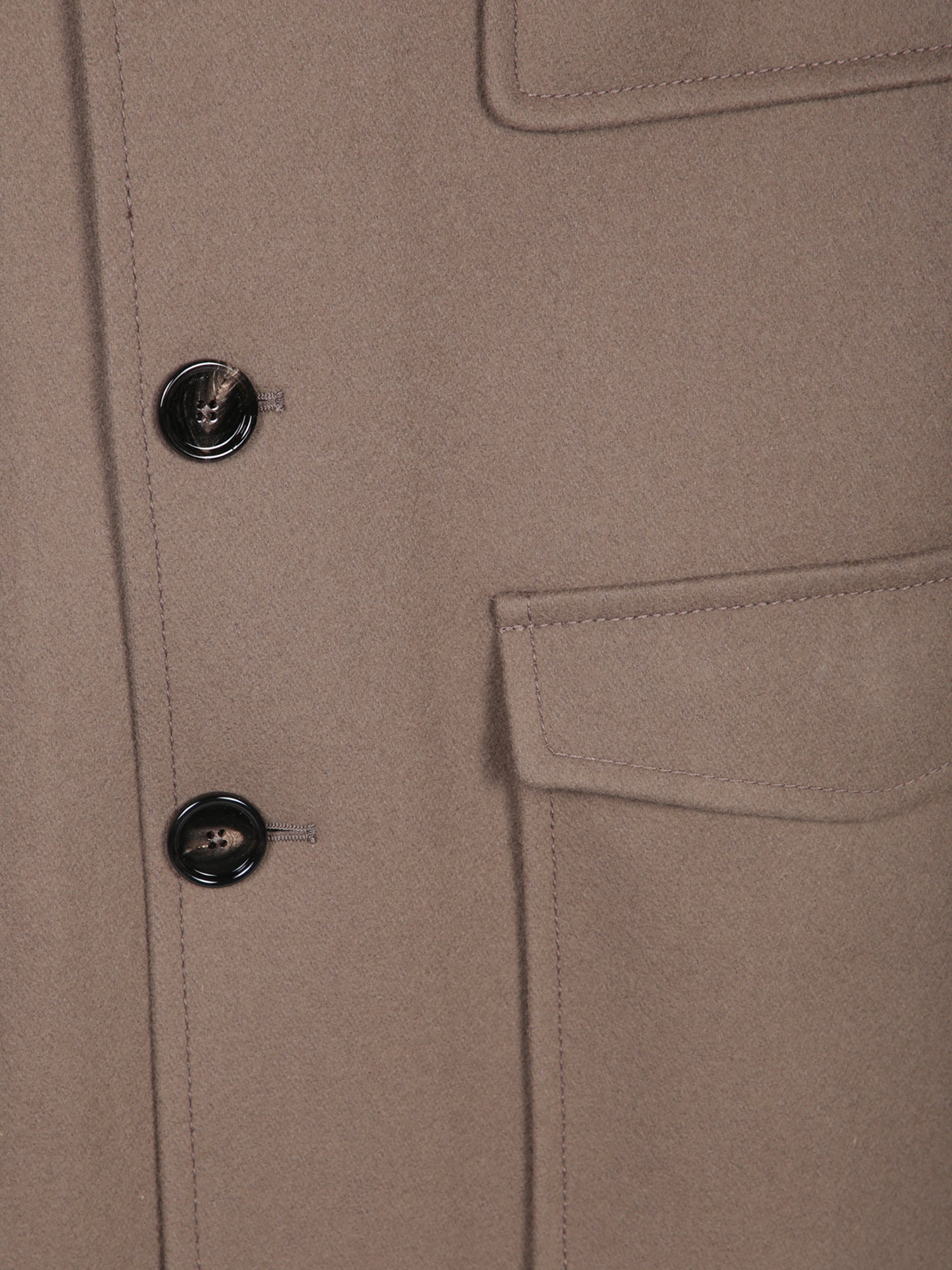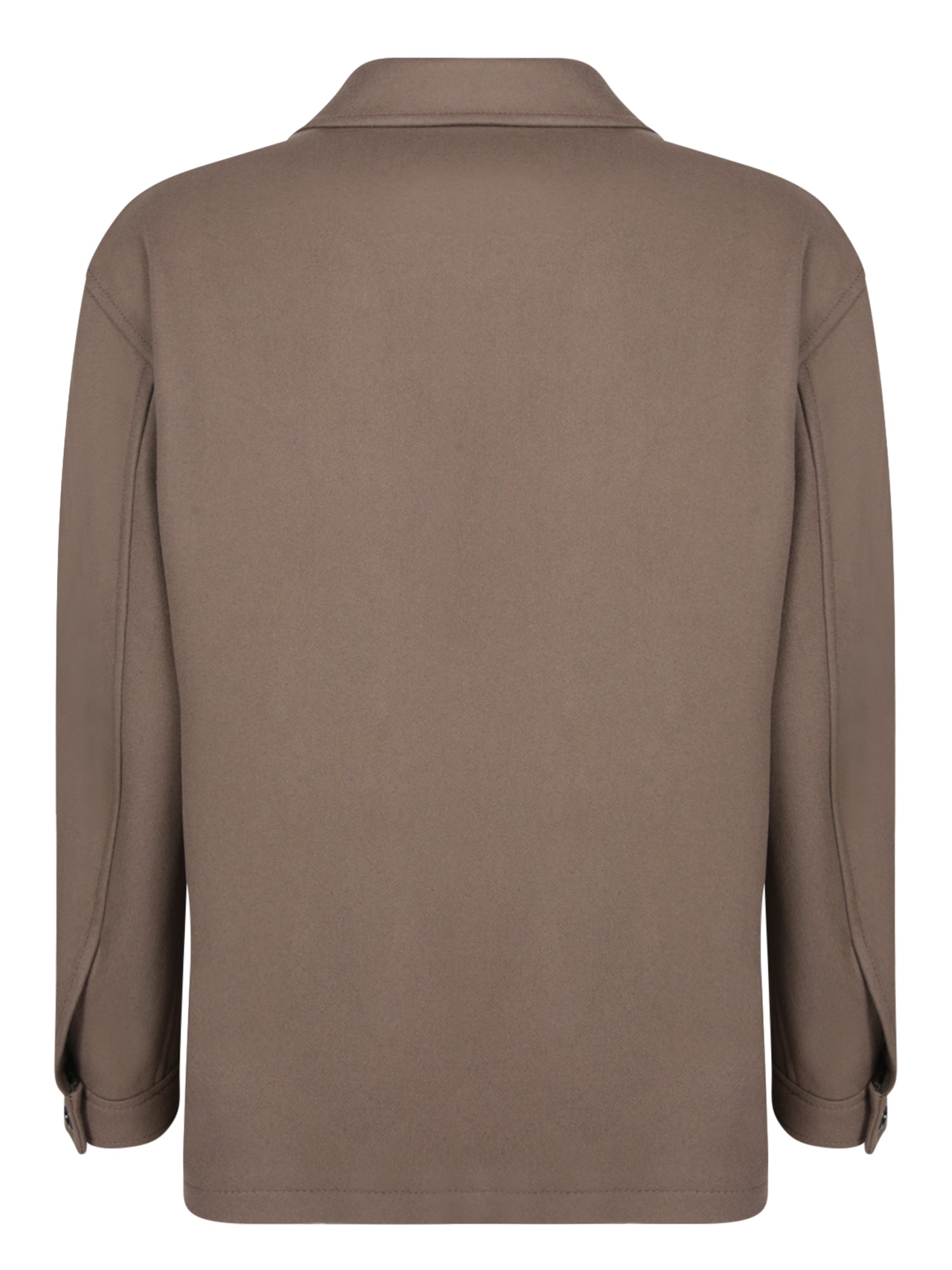 Dove grey wool overshirt featuring four front pockets, button closure, and a classic collar.