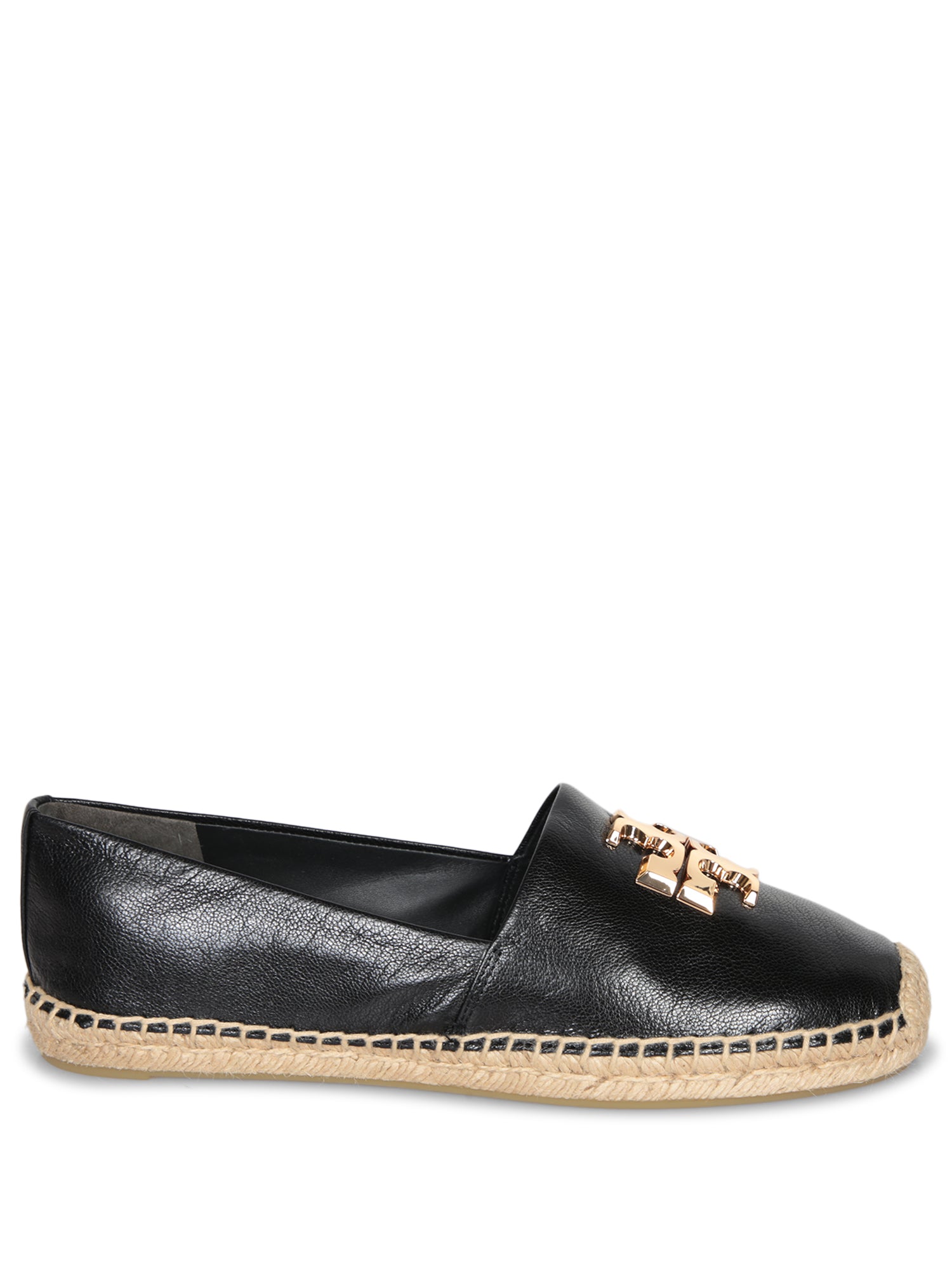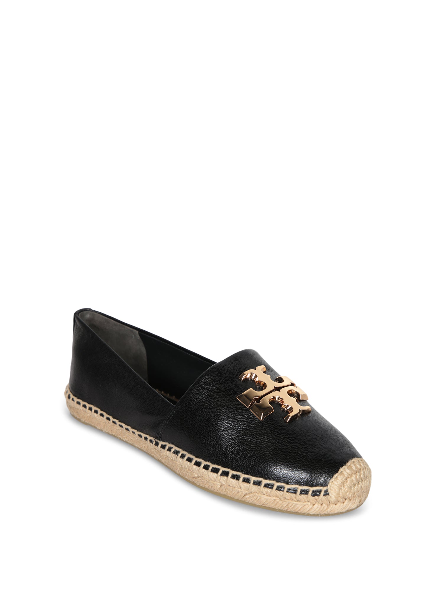 Black leather espadrilles with gold detailing. Prominent Tory Burch logo. Braided jute sole.