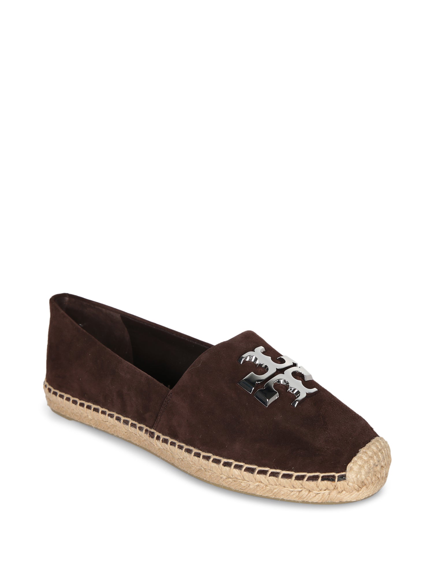 Brown suede upper. Golden metal logo detail. Braided rope sole.