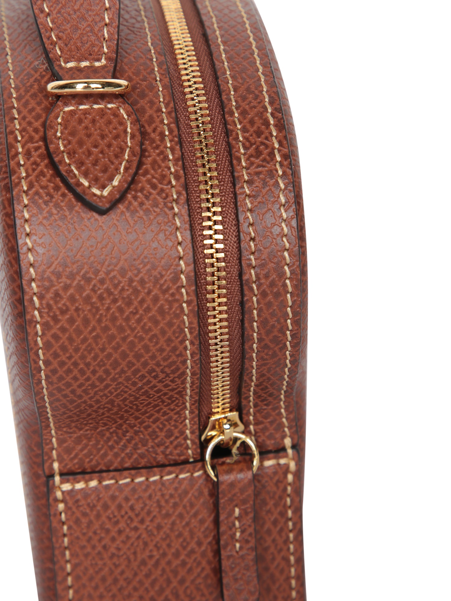 Textured leather structure. Adjustable and detachable shoulder strap. Top zip closure.