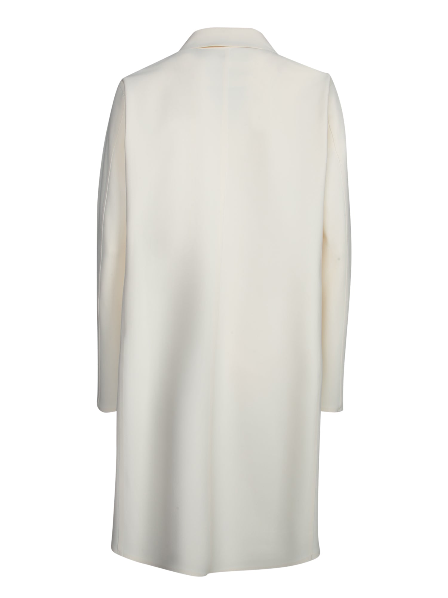 This elegant HERNO coat stands out with its smooth ivory fabric and clean lines. Featuring a button front closure and traditional collar, it's a sophisticated choice for a timeless addition to the winter wardrobe.