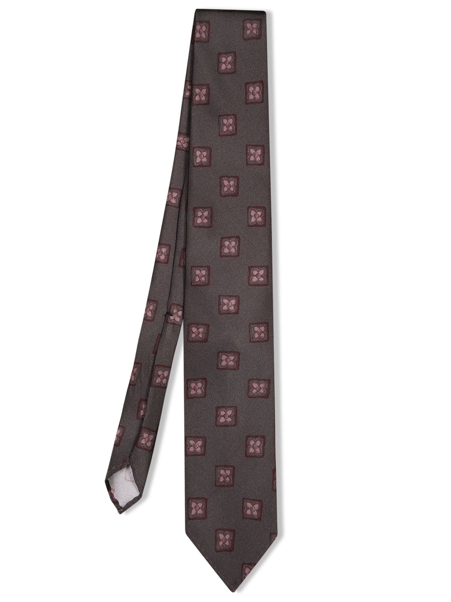 Silk tie with floral print. 8 cm width. Beige background with green details.
