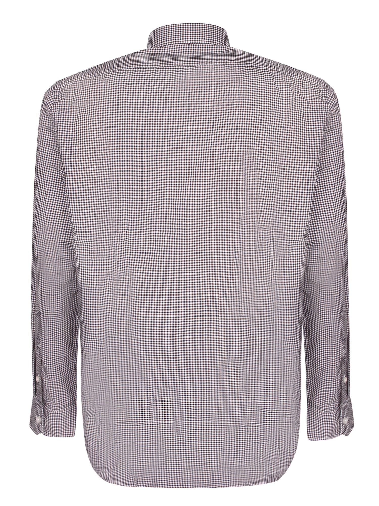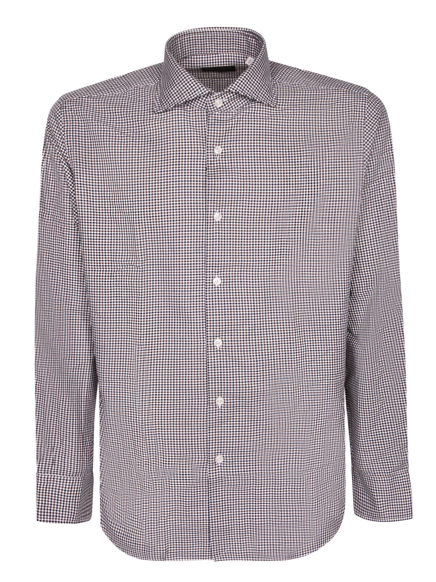 Long sleeve twill shirt. Black and white check pattern. Classic collar and button front closure.