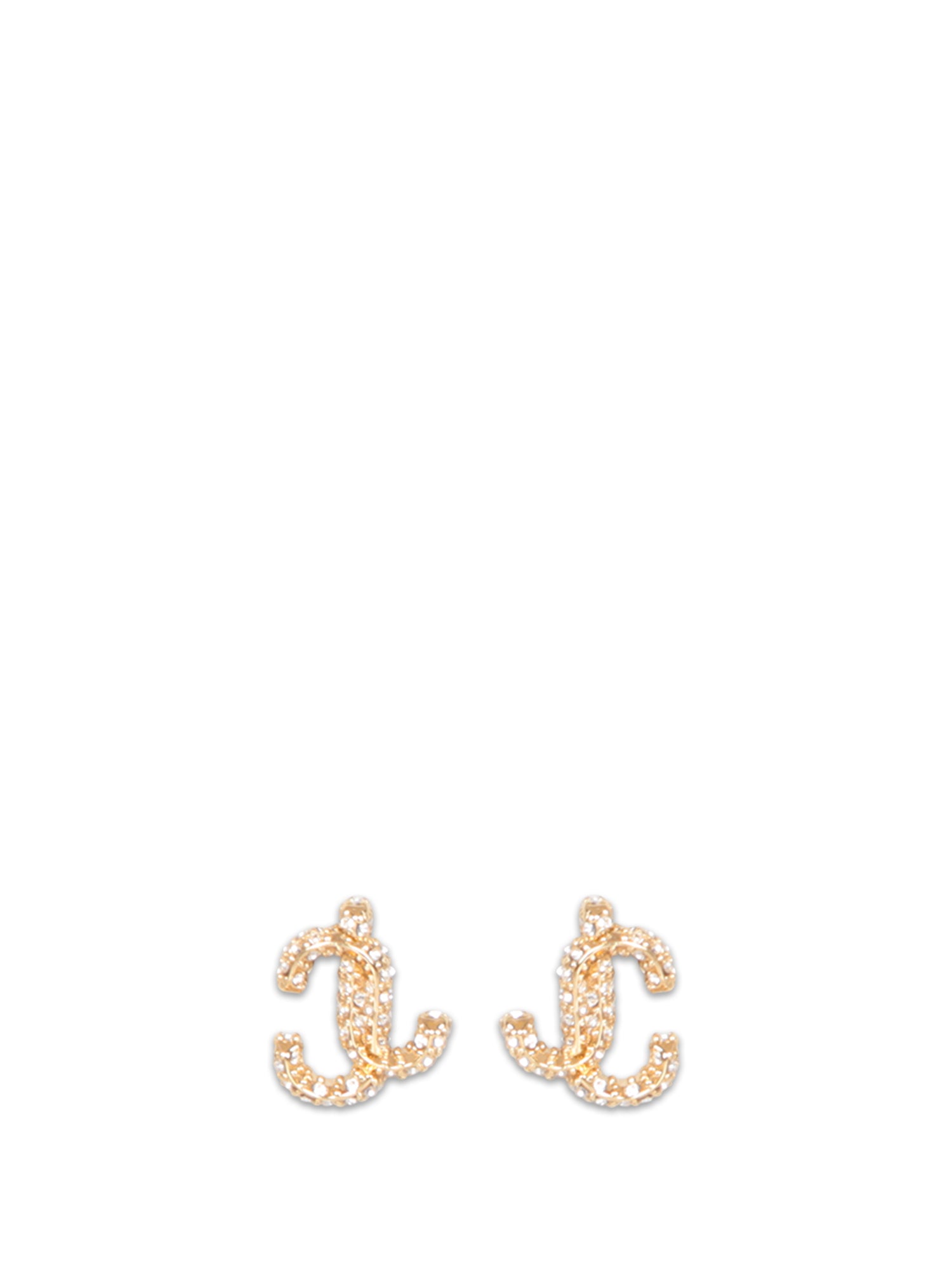 These elegant Jimmy Choo earrings, embellished with sparkling crystals and set in gold, feature the 'JC' emblem adding a distinctive touch of luxury.