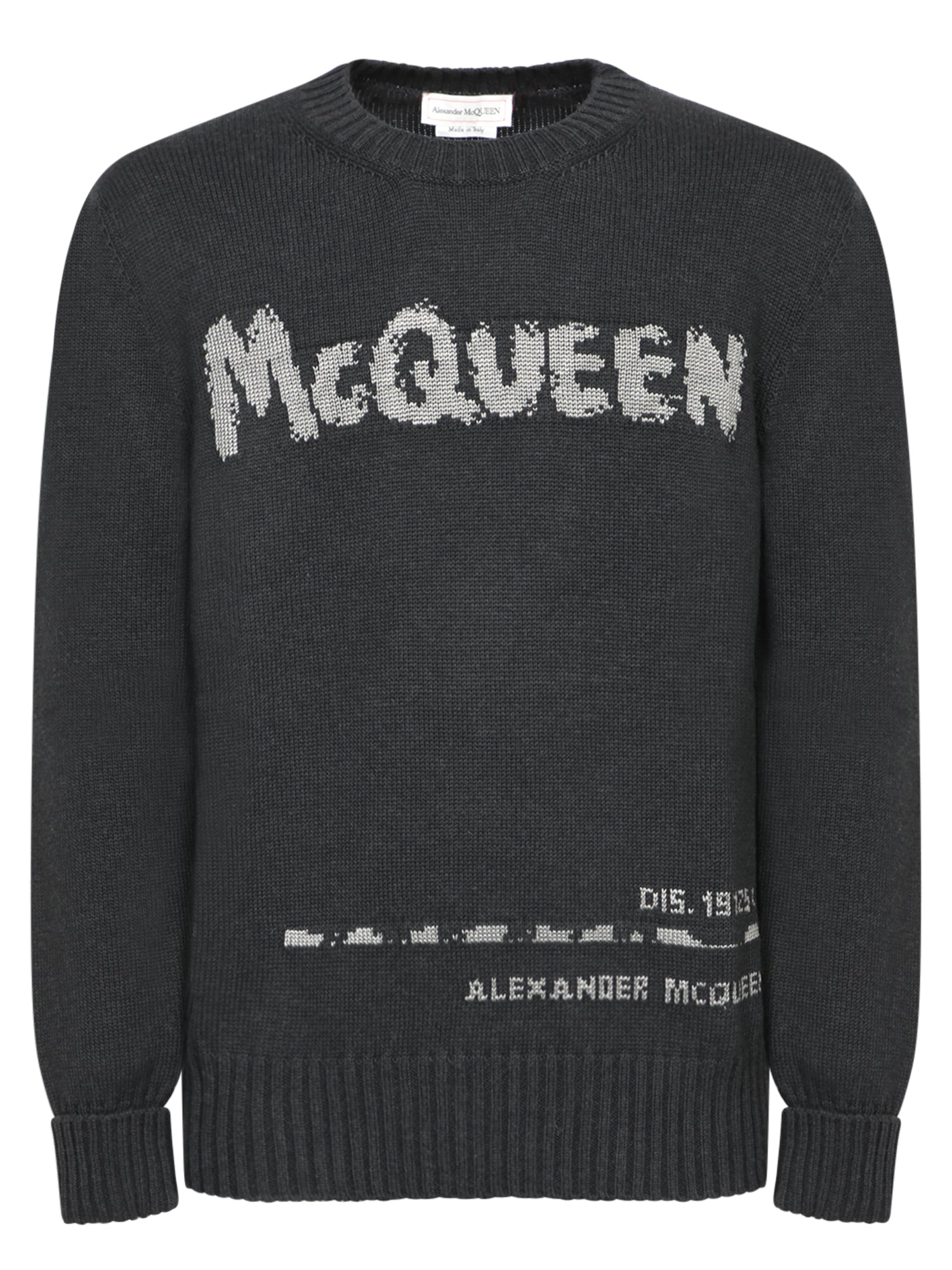 Showcase bold style with this Alexander McQueen sweater, featuring a graffiti-style 'McQueen' logo that adds an urban edge to the classic black knit design. Perfect for blending comfort with trend.
