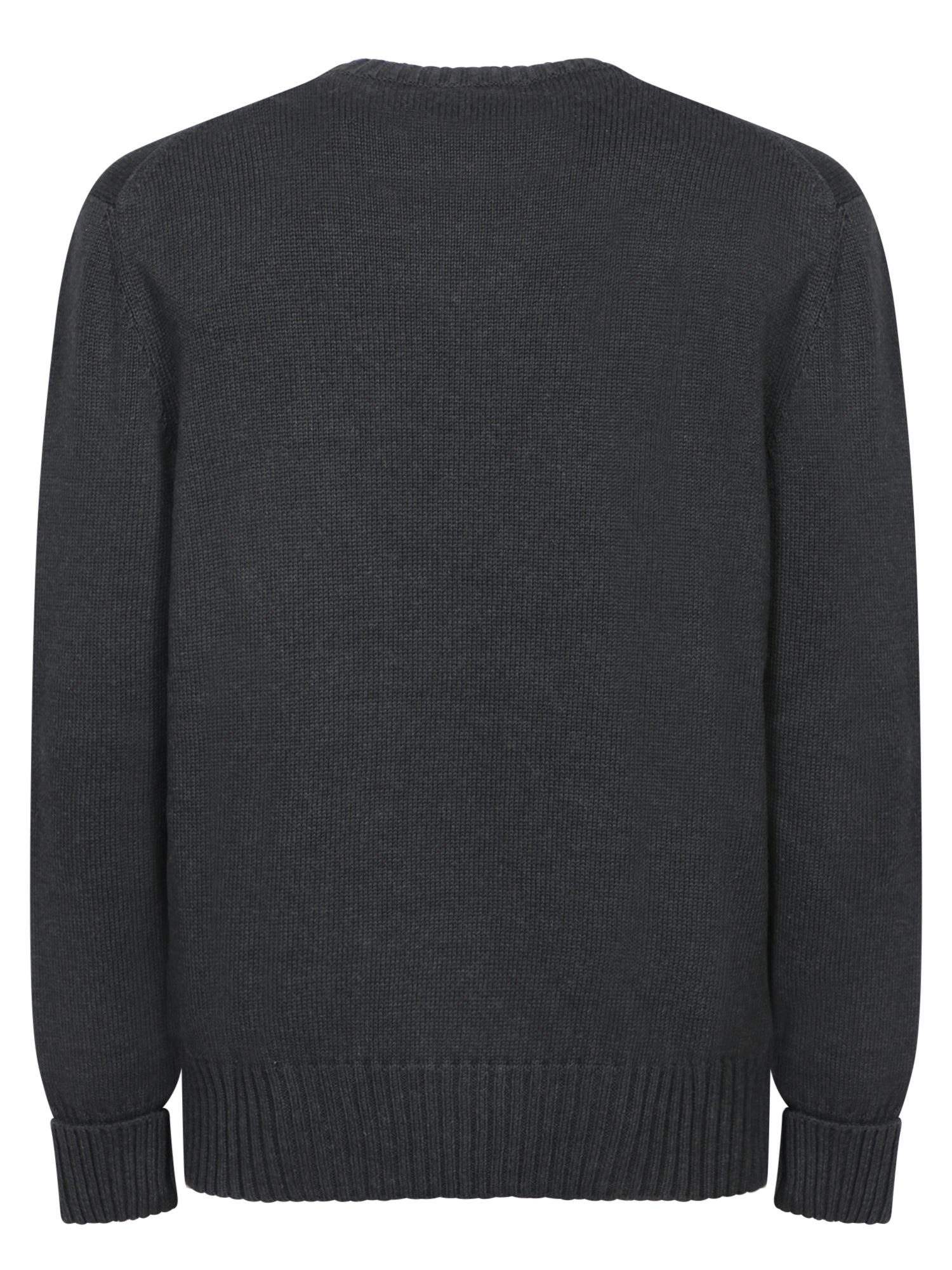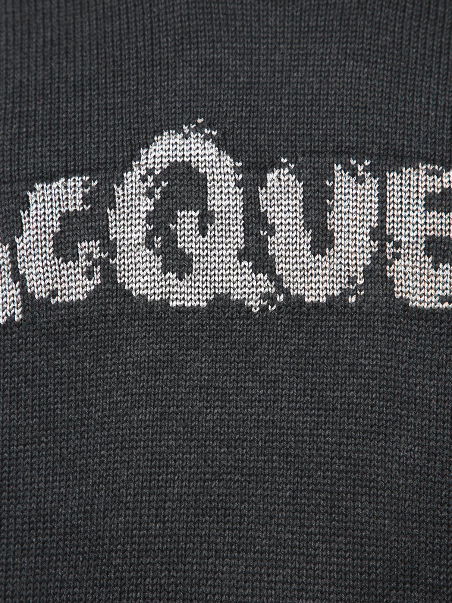 Fine knit round neck sweater. 'McQueen' graphic detail on the front. Ribbed finishes on neck, cuffs, and hem.