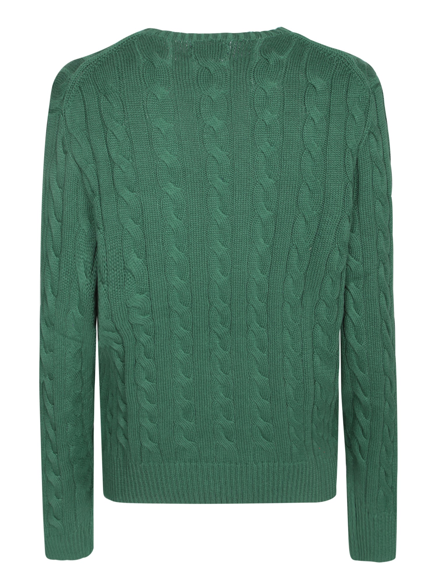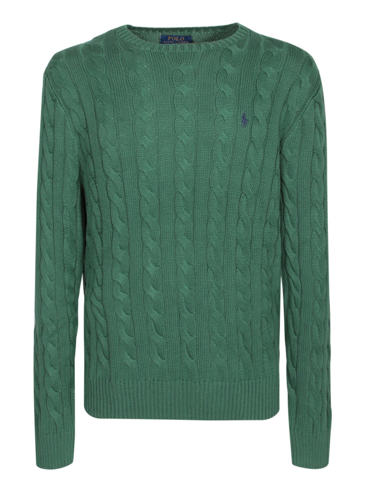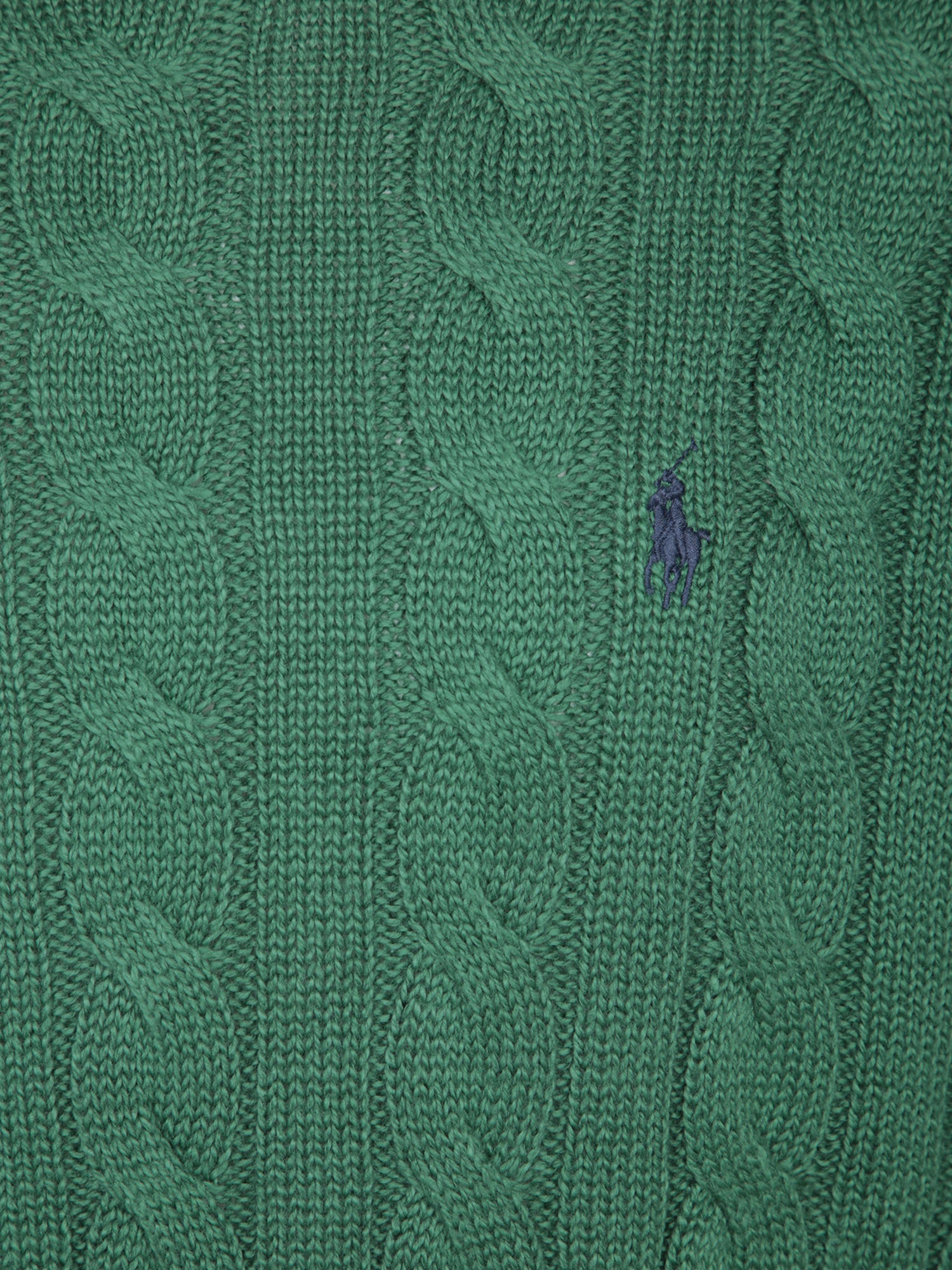 Long sleeve cable knit sweater. Sage green color with an embroidered logo detail on the chest.