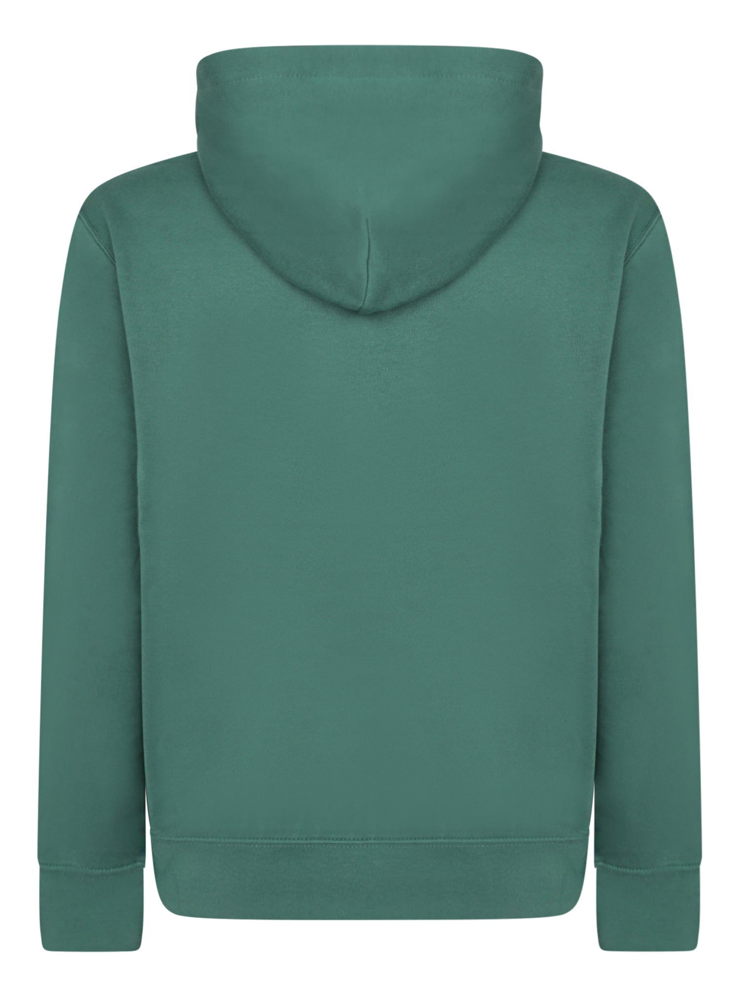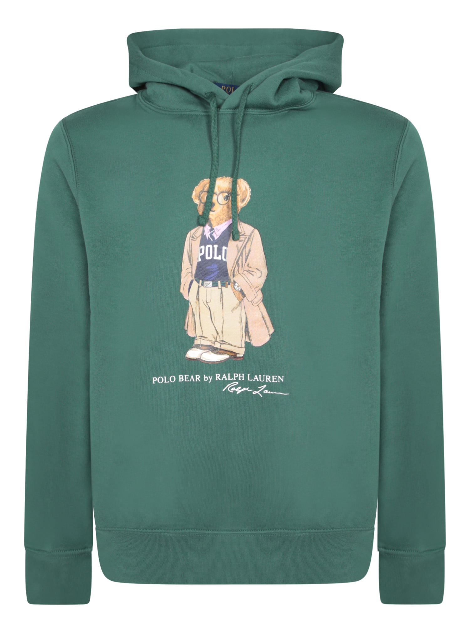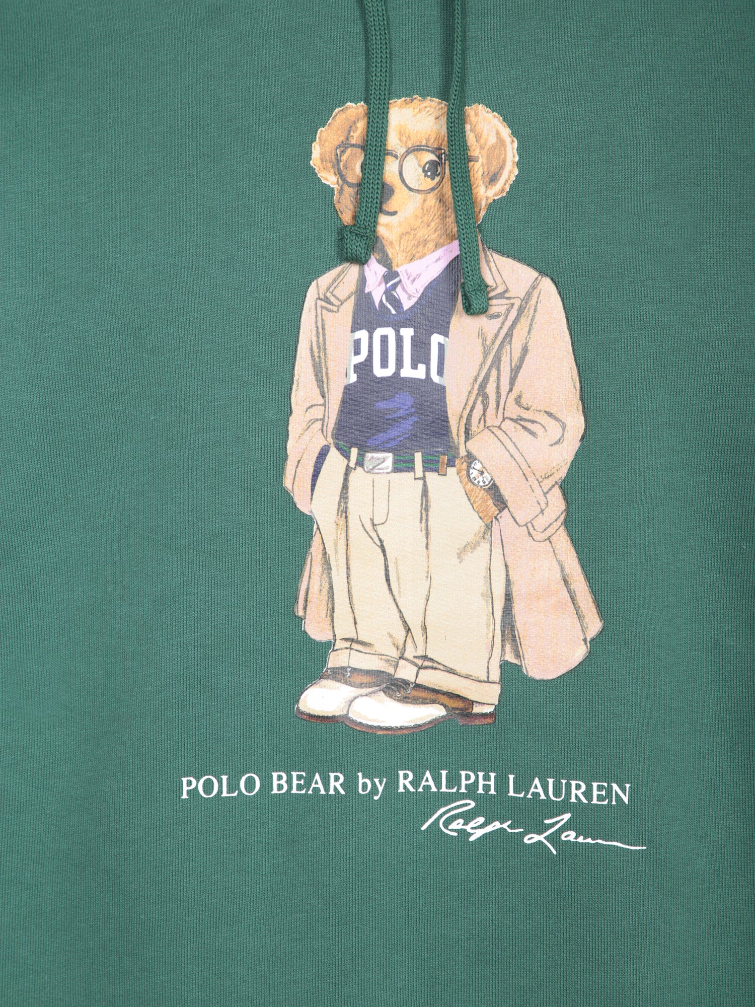 Solid color hoodie with long sleeves, kangaroo pocket. Features a graphic print of the Polo Bear on the front.