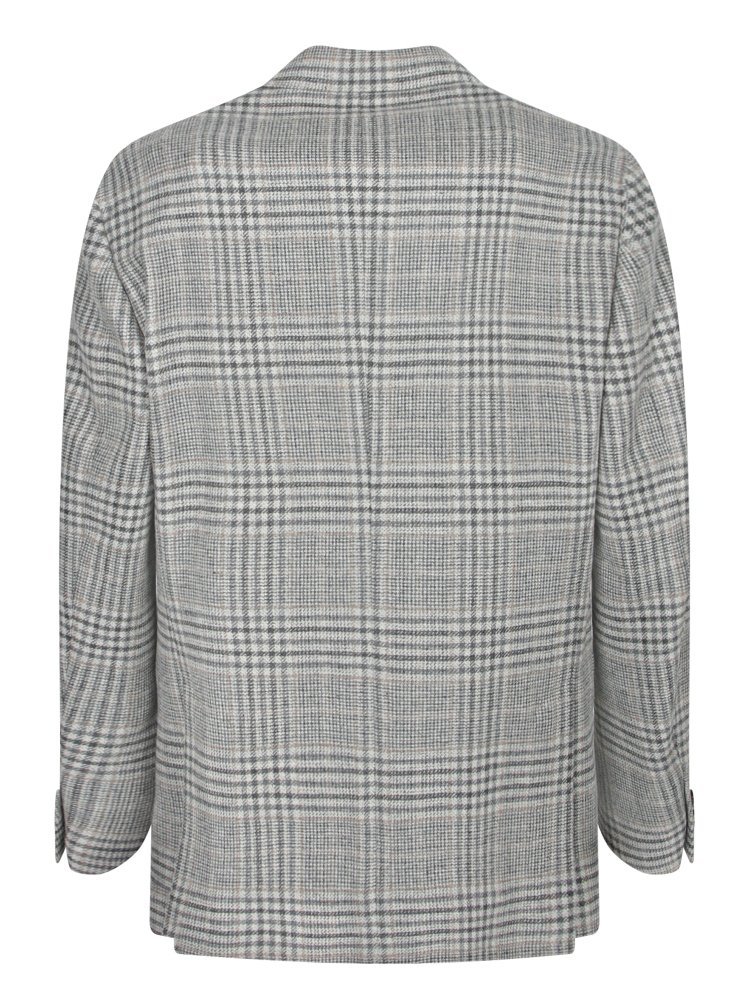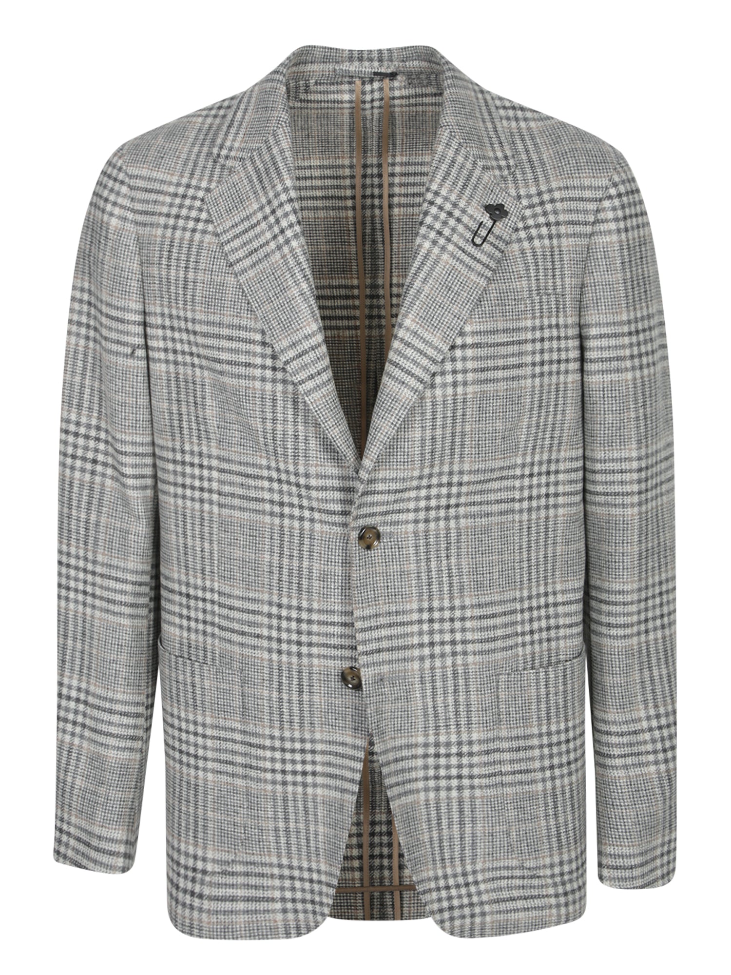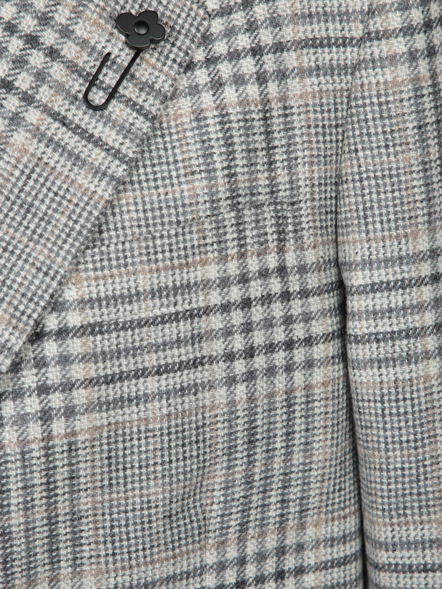 Double-breasted jacket with checkered fabric. Featuring classic lapels, button closure. Flap pockets and a decorative pin on the lapel.