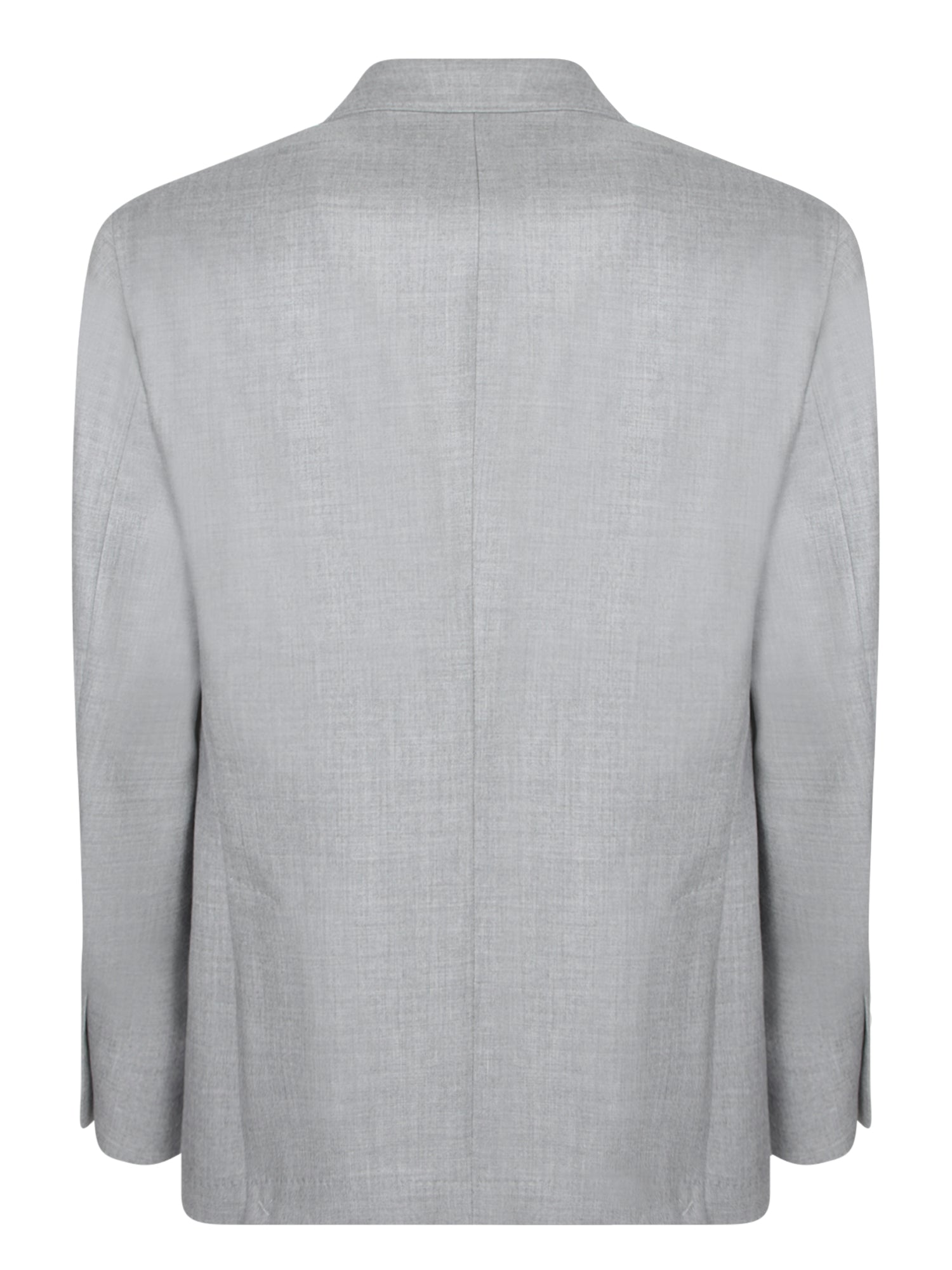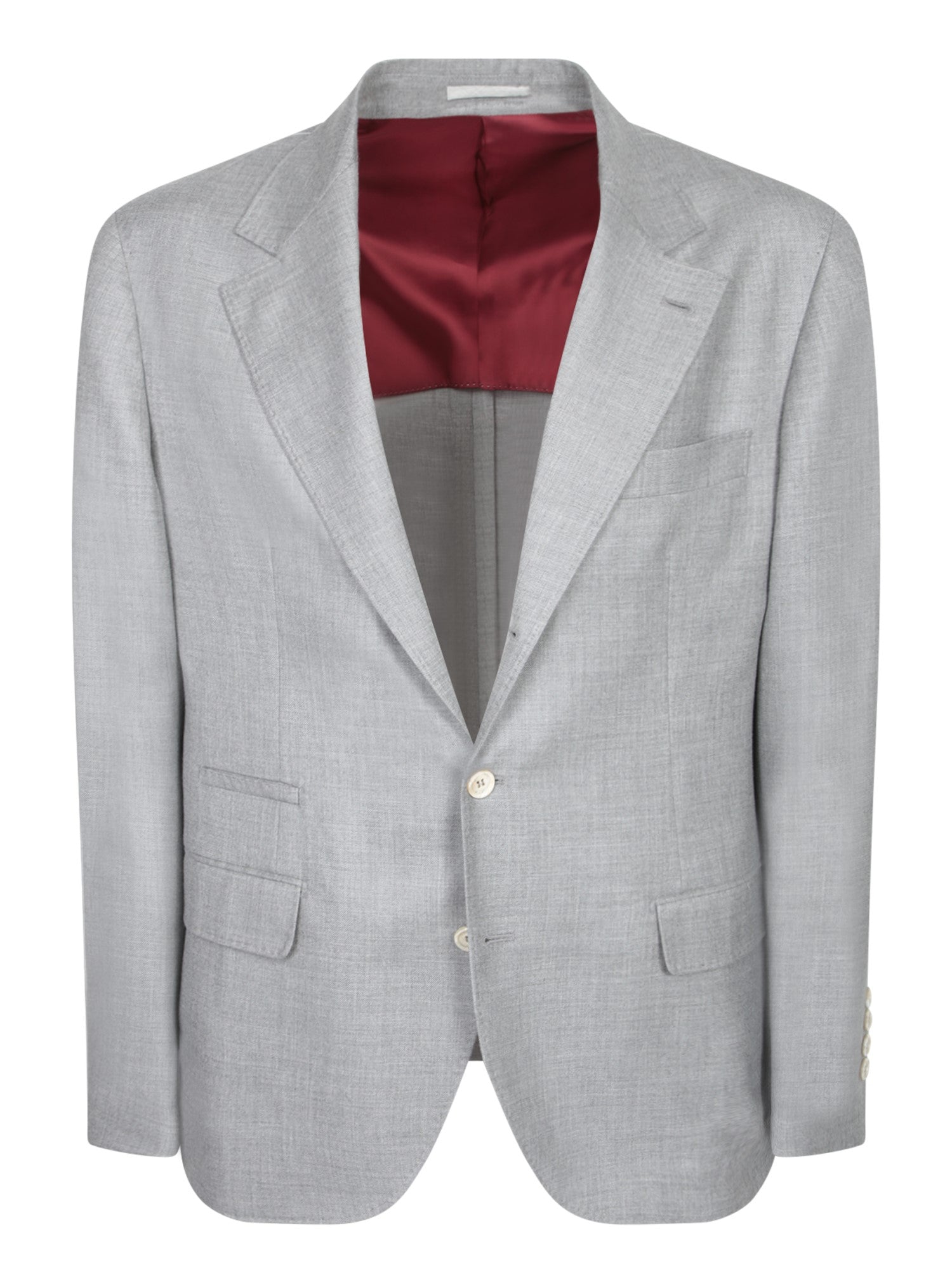 Elegant grey cashmere jacket. Classic design with two front buttons and red inner lining.