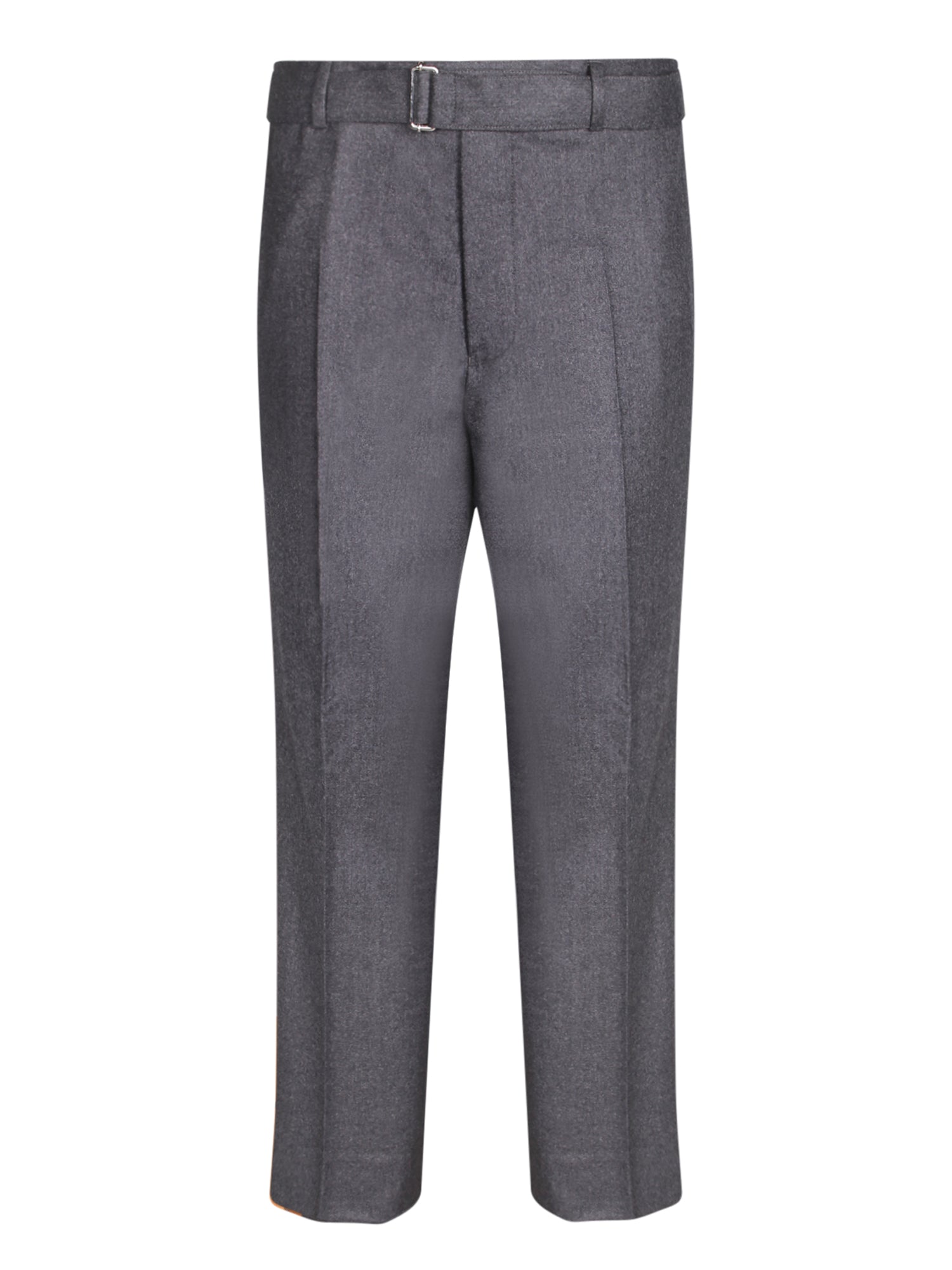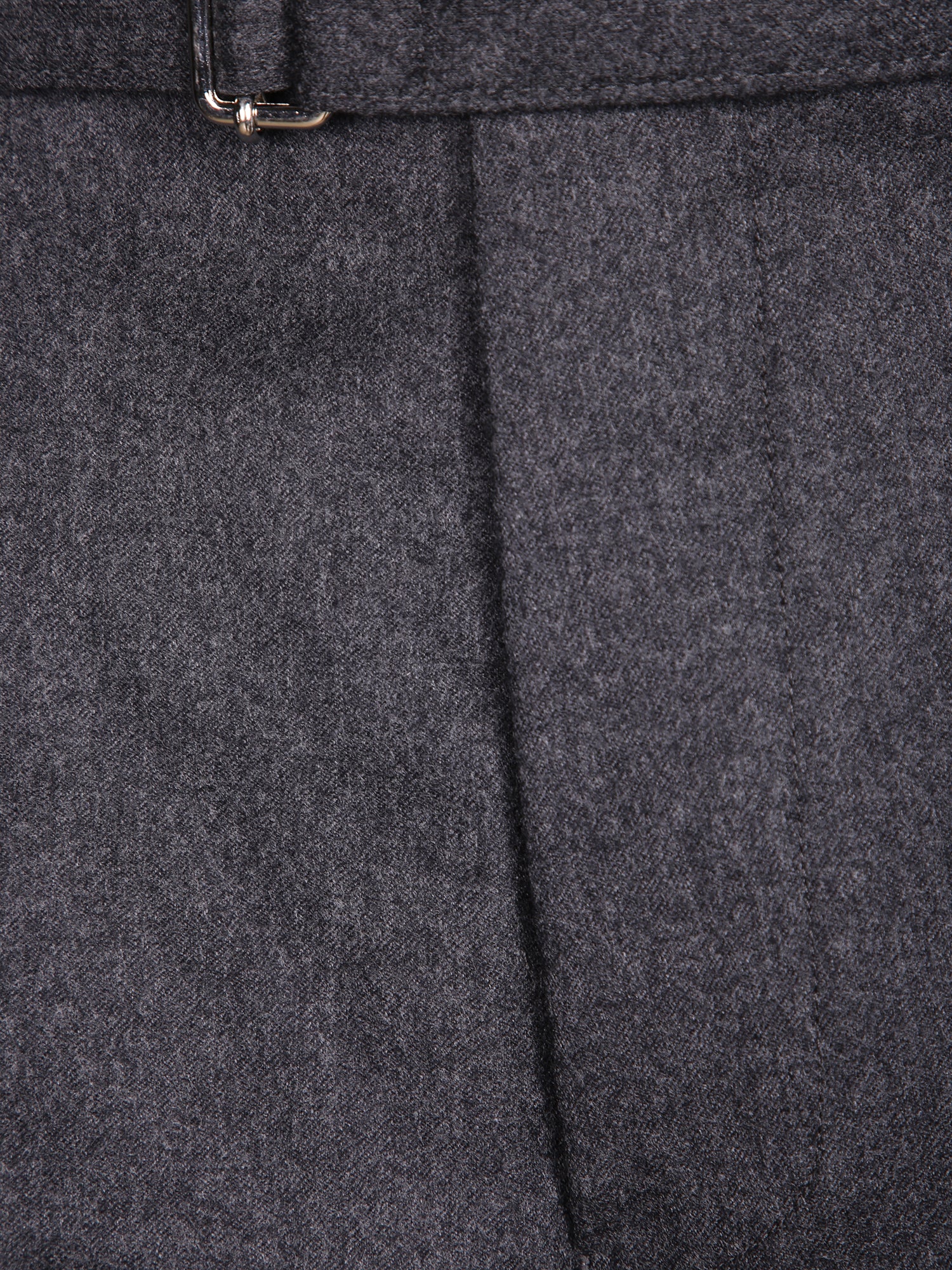Adjustable waist with buckle. Slanted side pockets. Front pleats.