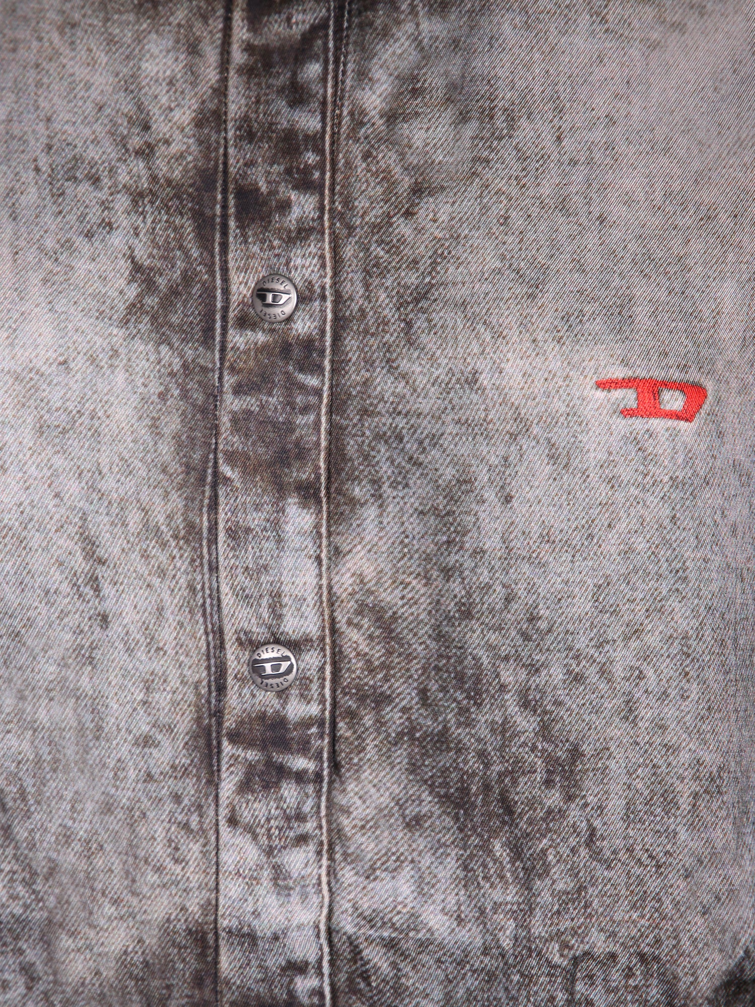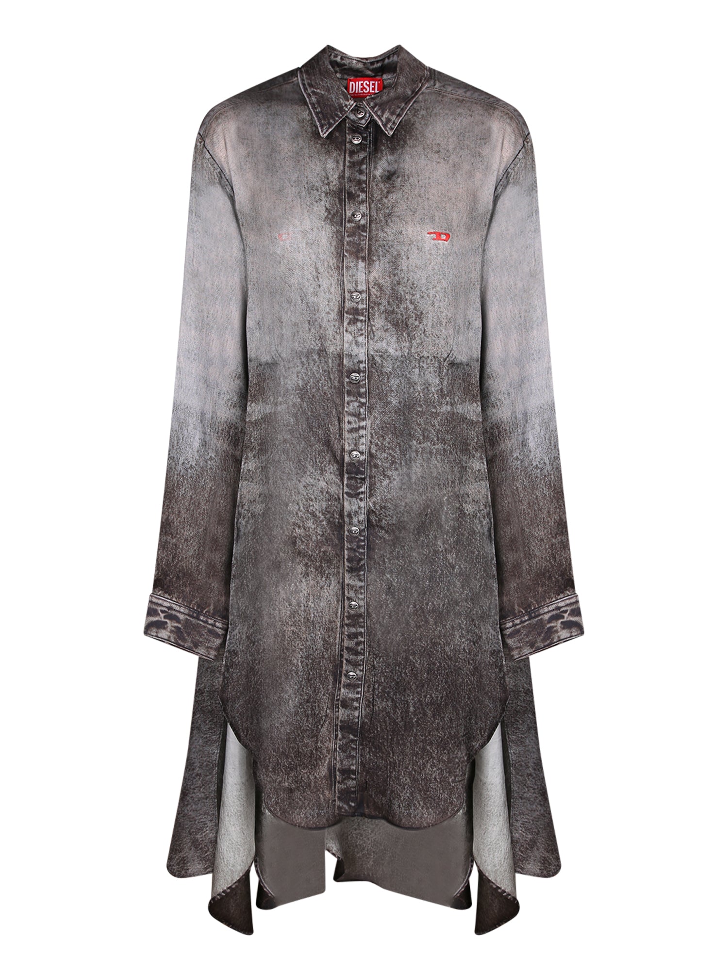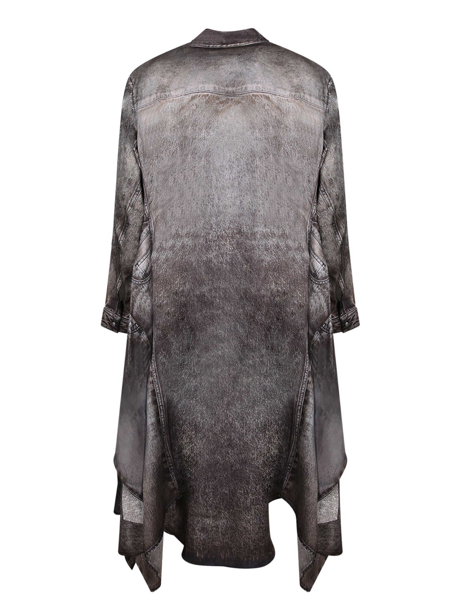 Aged-effect midi denim dress with a pointed collar, front button closure, and long sleeves with buttoned cuffs.