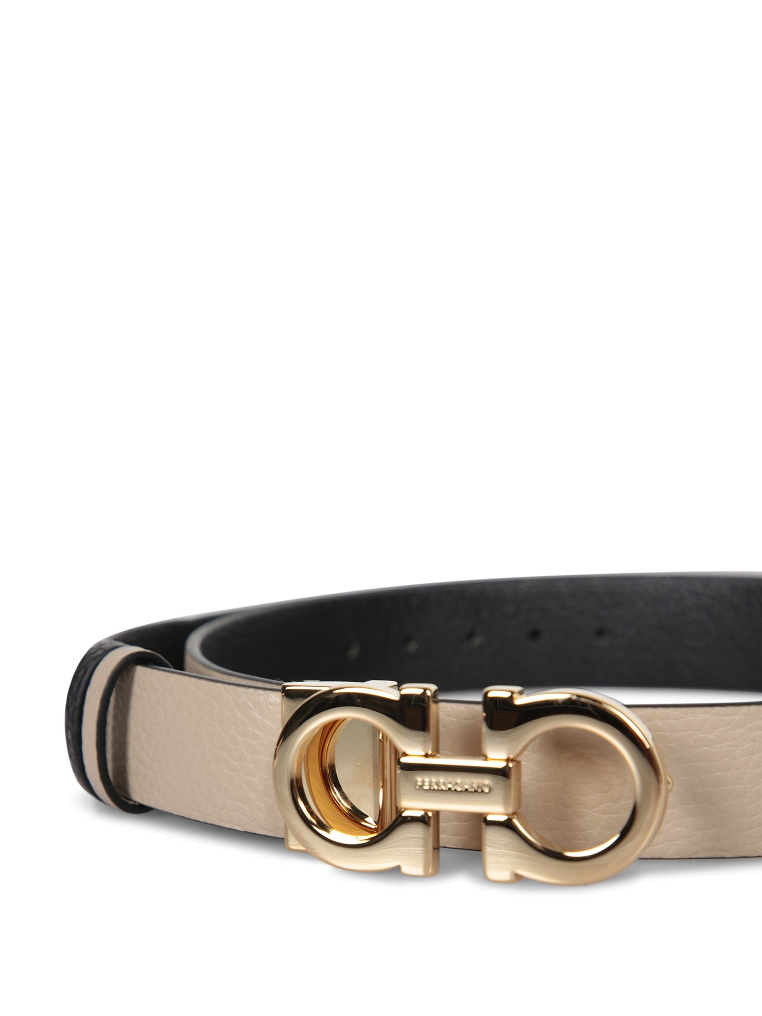 Designed to add a touch of elegance to your outfits, this Ferragamo belt is crafted in high-quality leather with a two-tone beige and black finish. The iconic gold-tone Gancini buckle adds a distinctive detail.