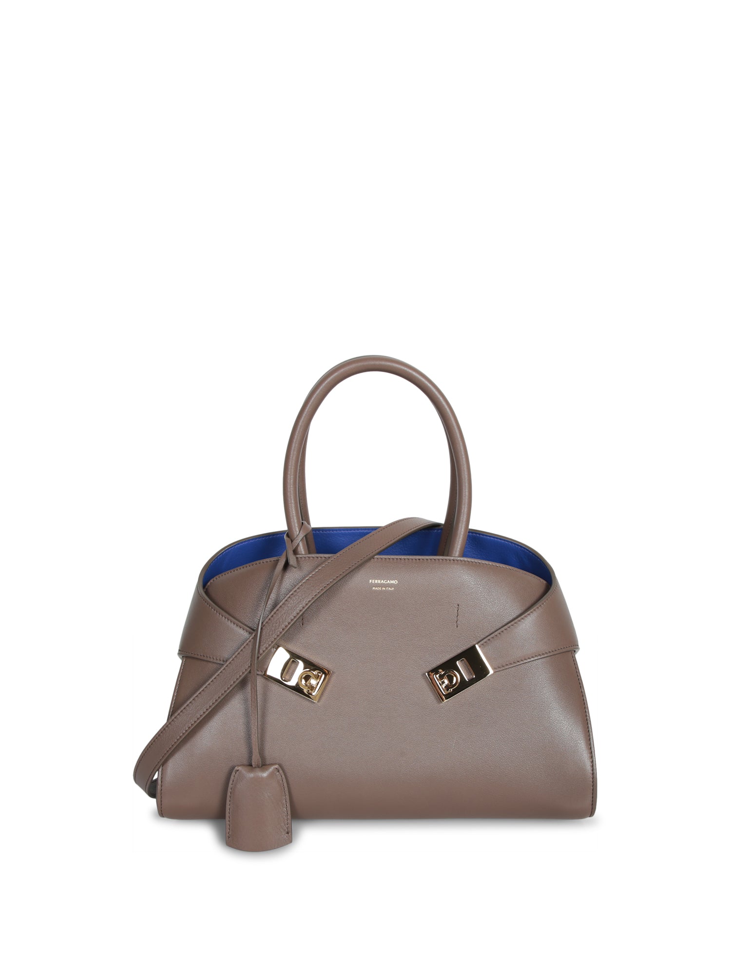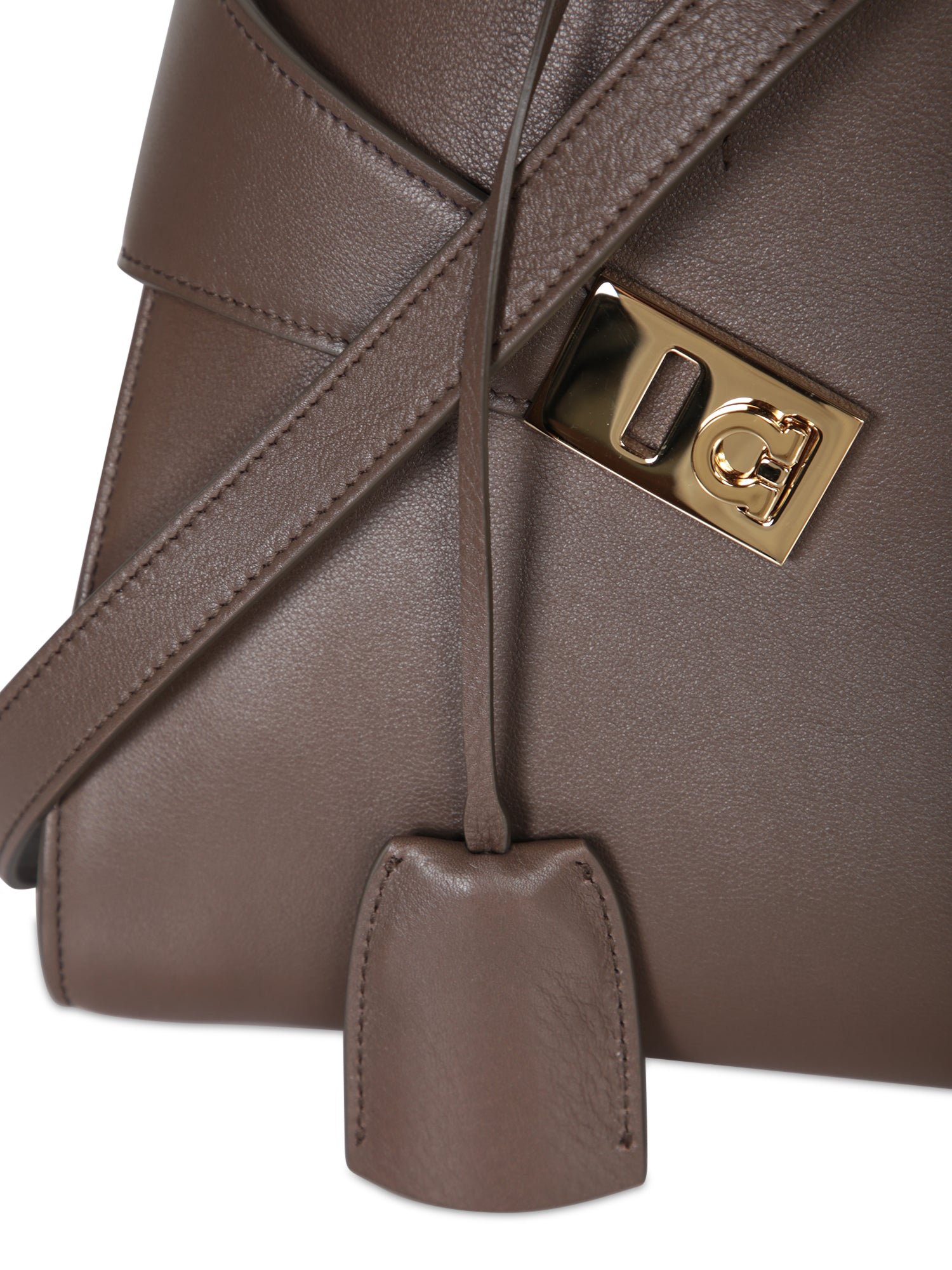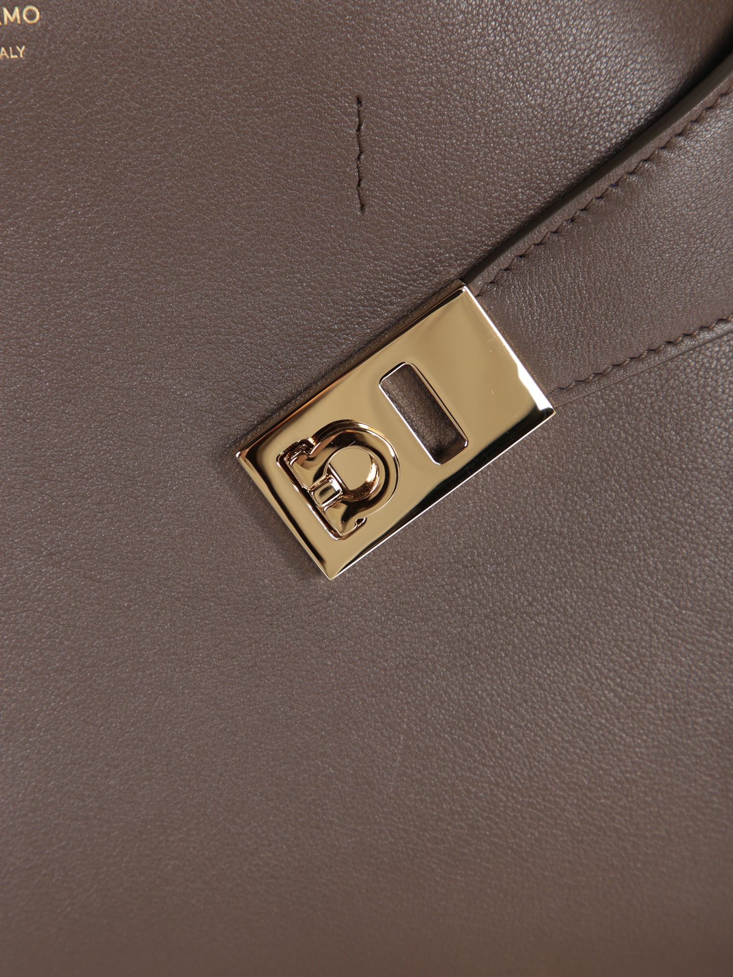 A refined interpretation of functional elegance, this Ferragamo bag stands out for its soft silhouette and neutral hue, enhanced by metallic details that add a luxurious touch.