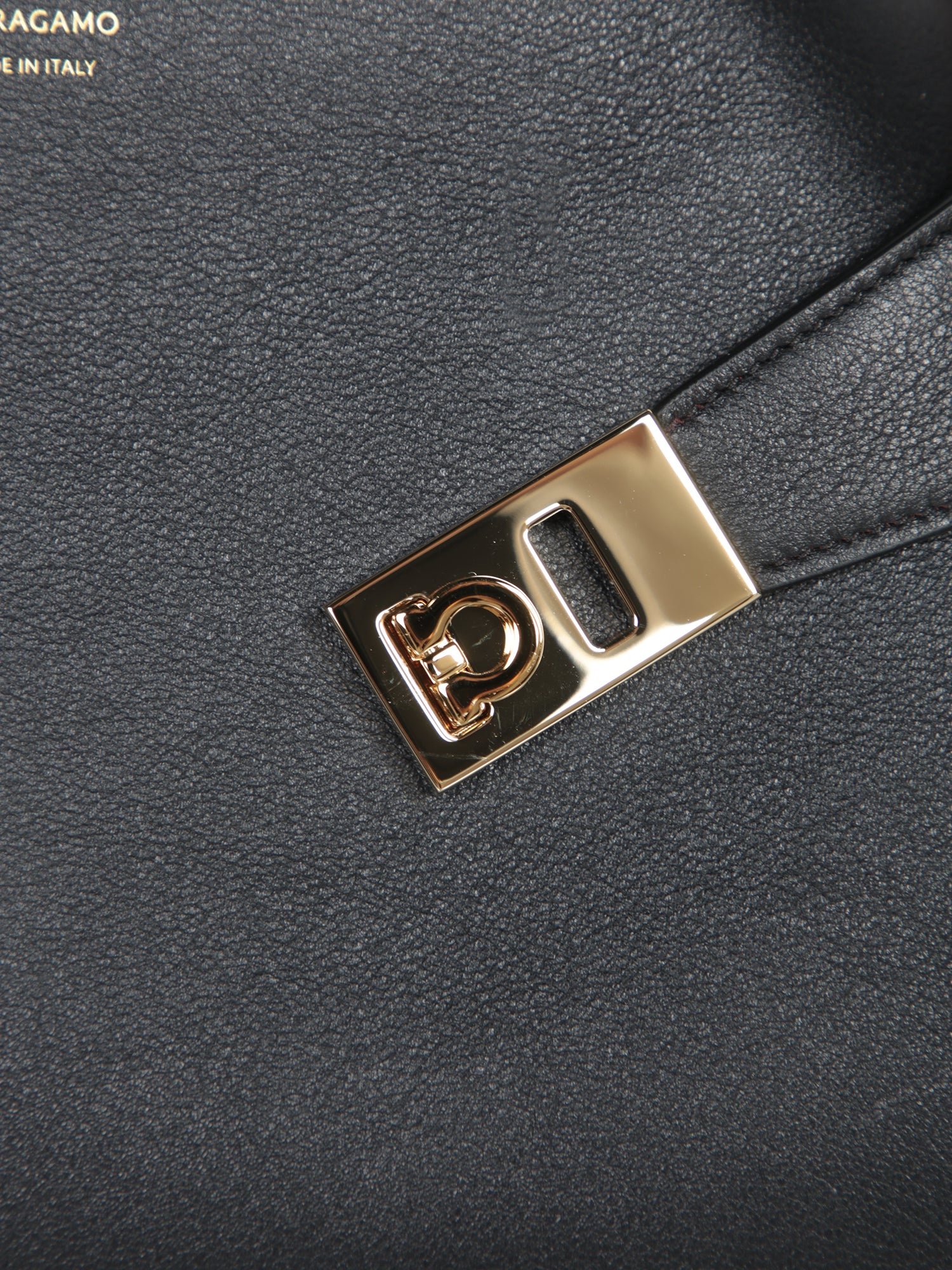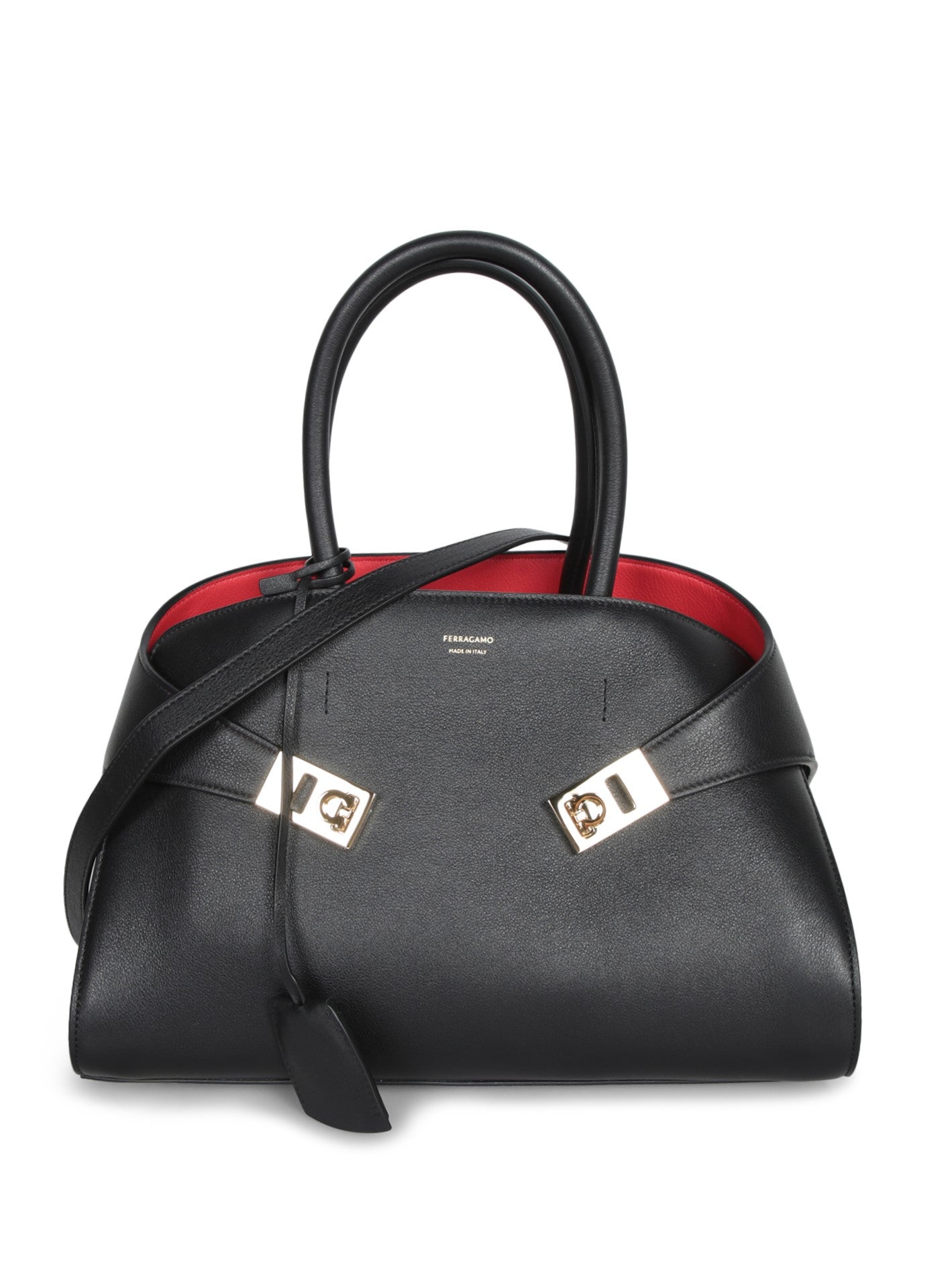 Elegance and functionality merge in Ferragamo's Hug Soft S bag. Featuring a sophisticated design with golden metal details and spacious, vividly contrasting red interiors.