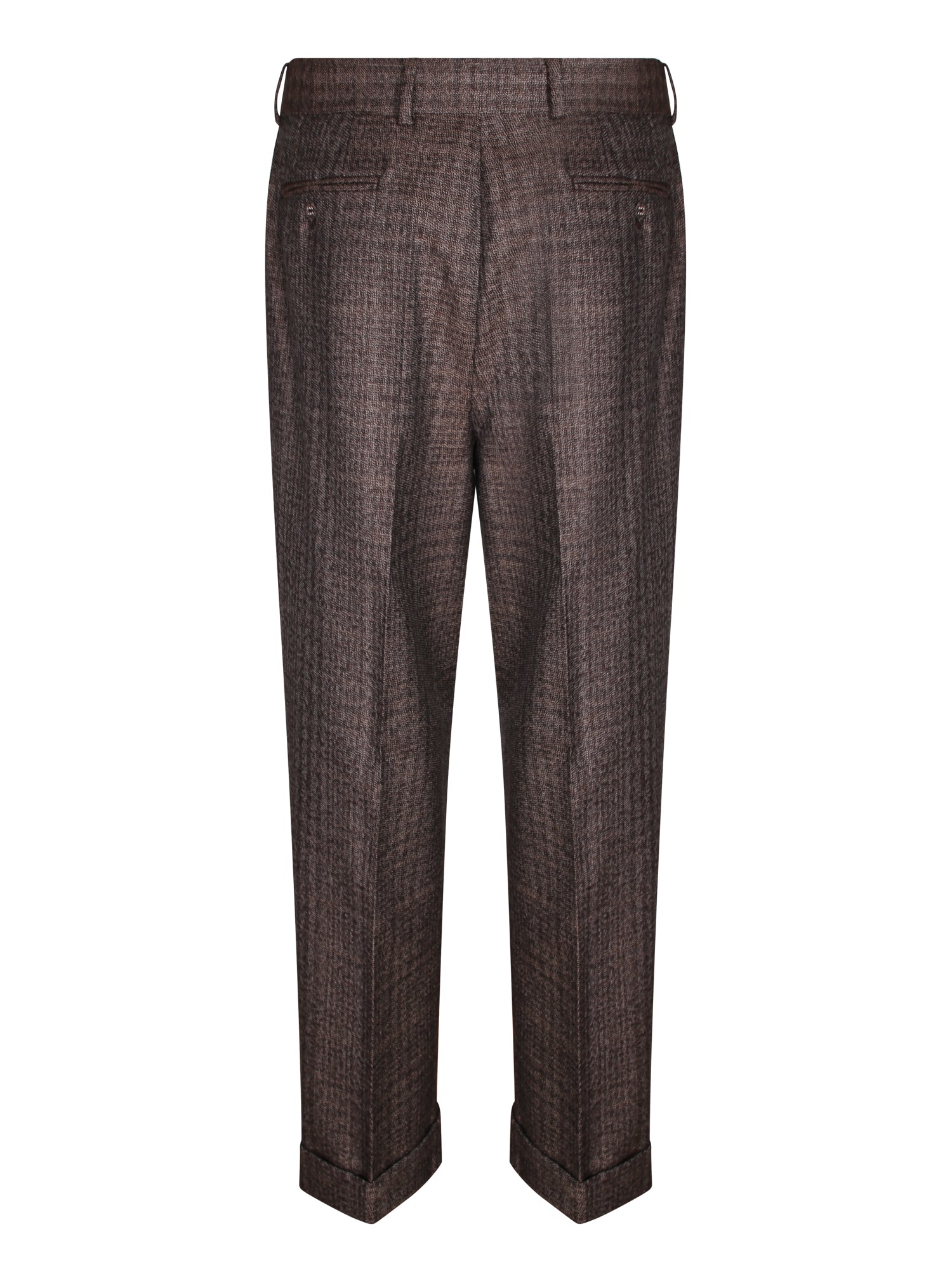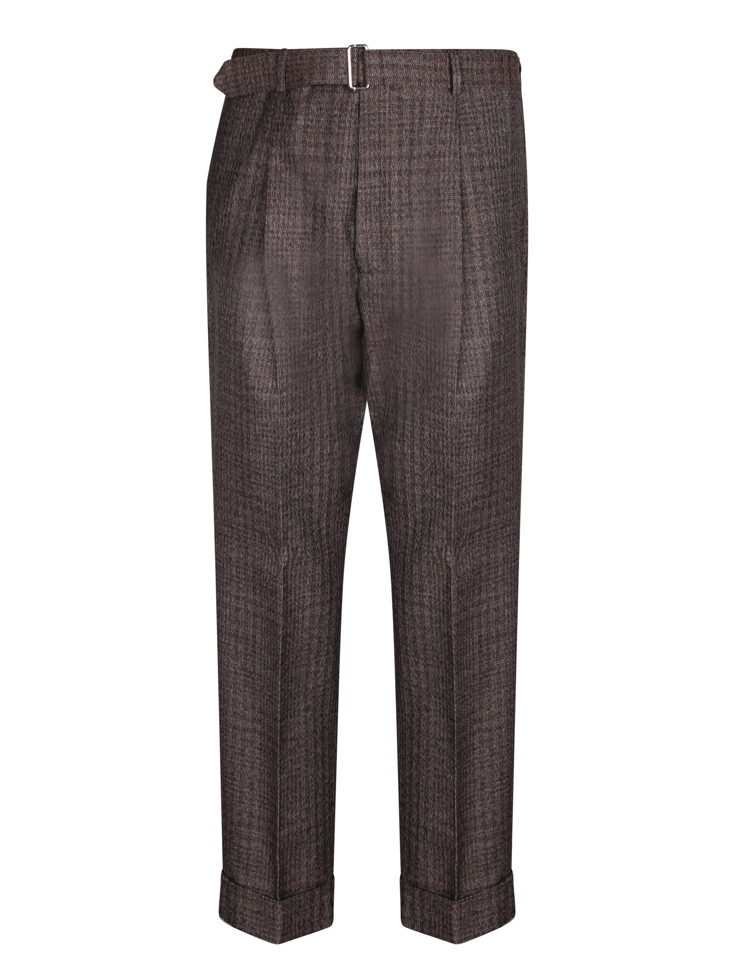 Checkered trousers with included adjustable belt. High-waisted model with front zip and button closure. Side and back pockets.