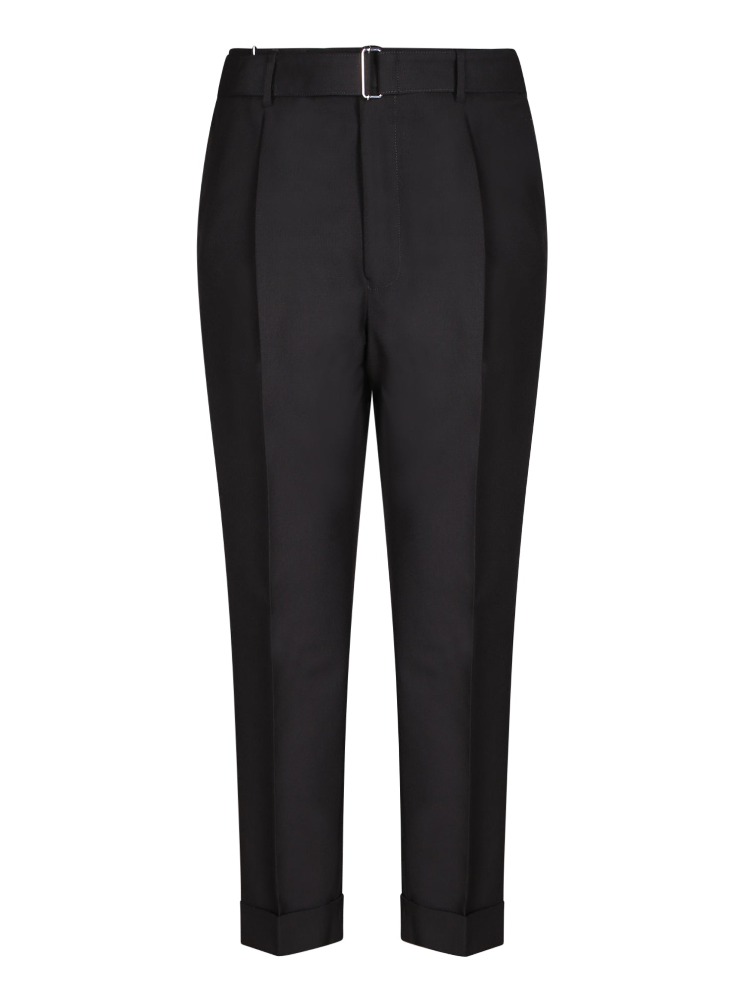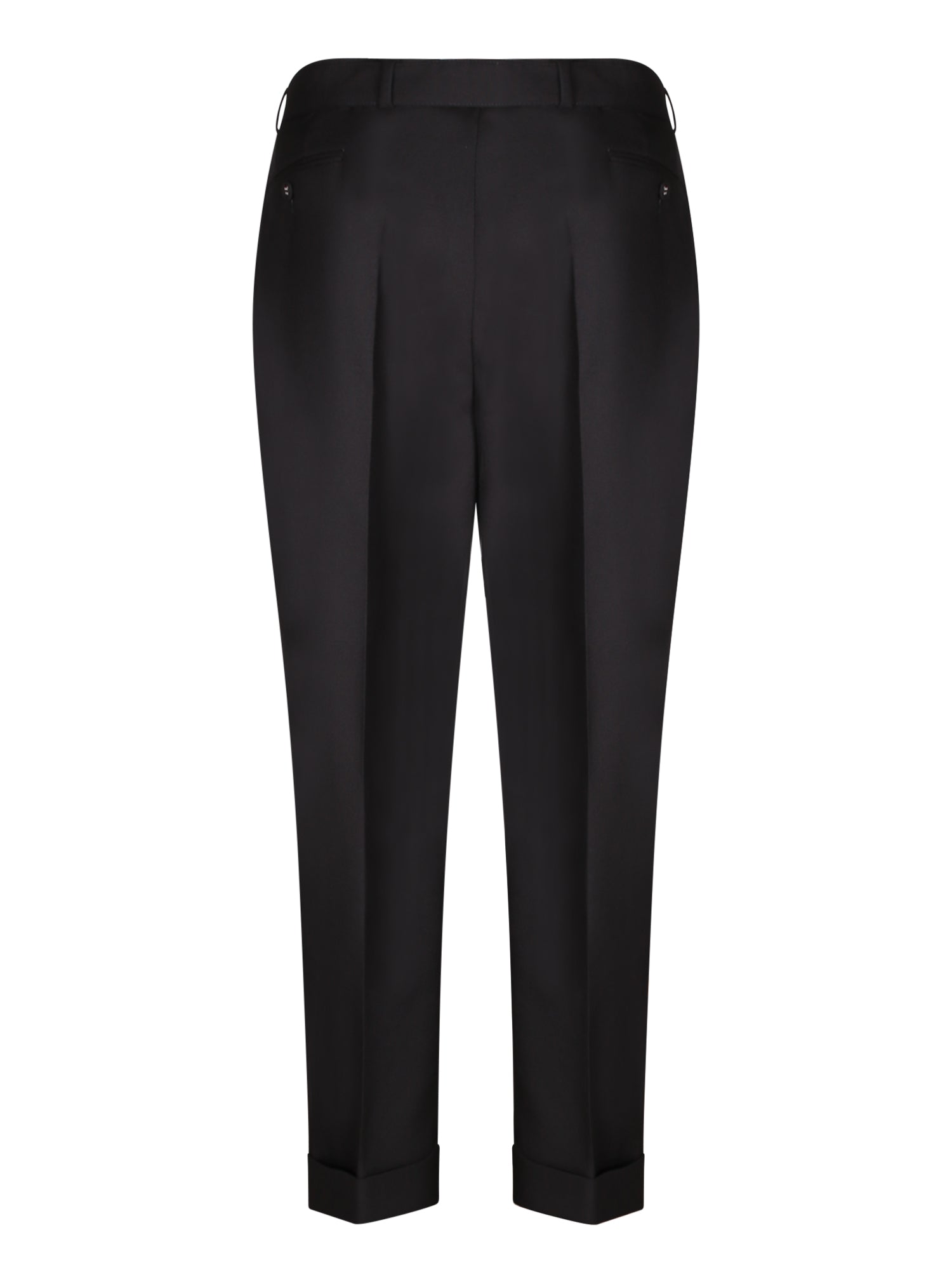 Three-ply wool trousers. Tailored design with pleats. Zip and button closure.