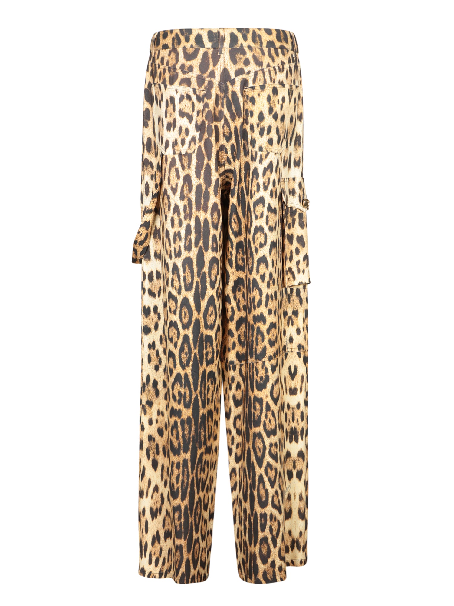 High-waisted pants with leopard print. Cargo model with multiple pockets. Zip and button closure.