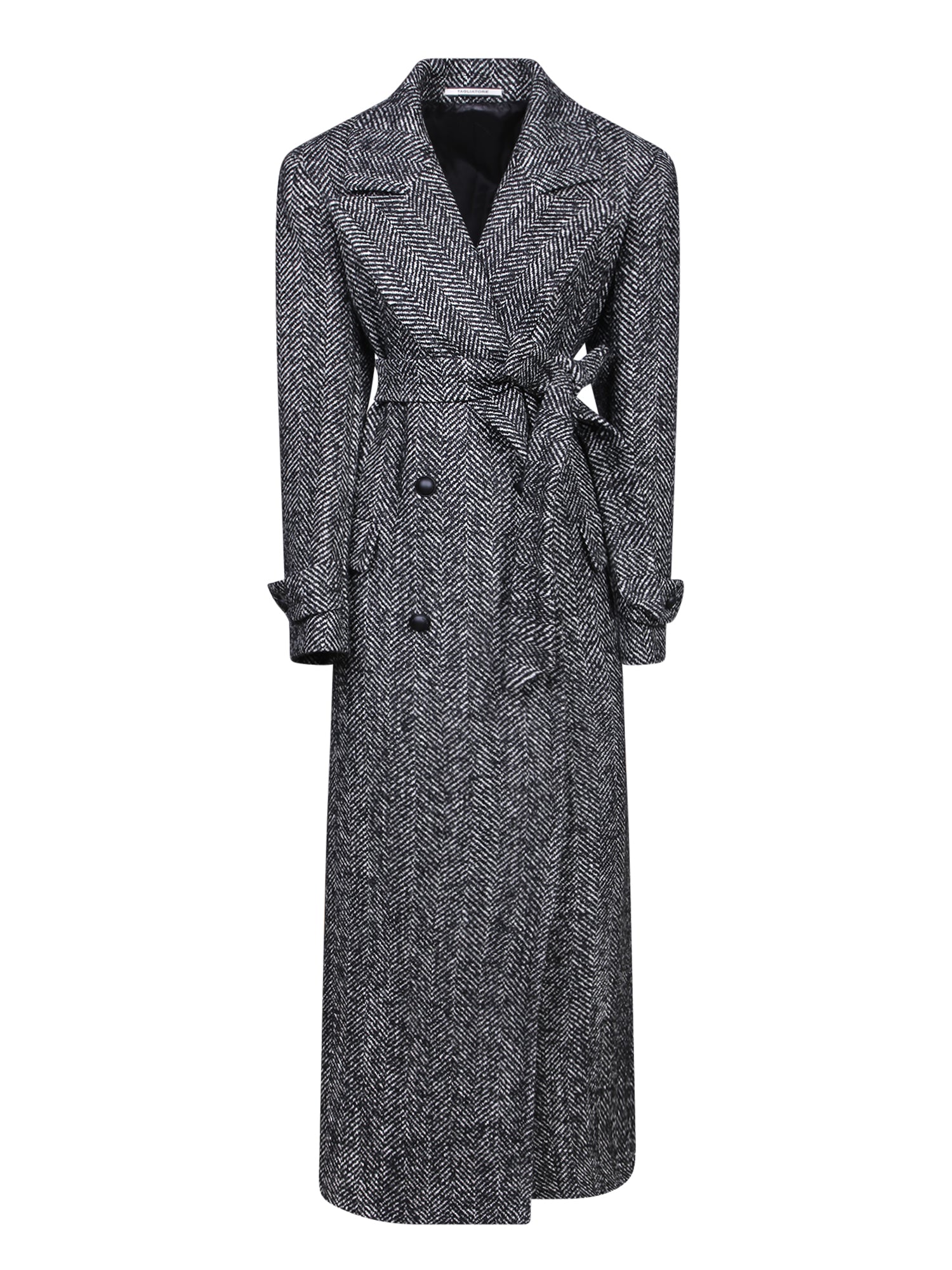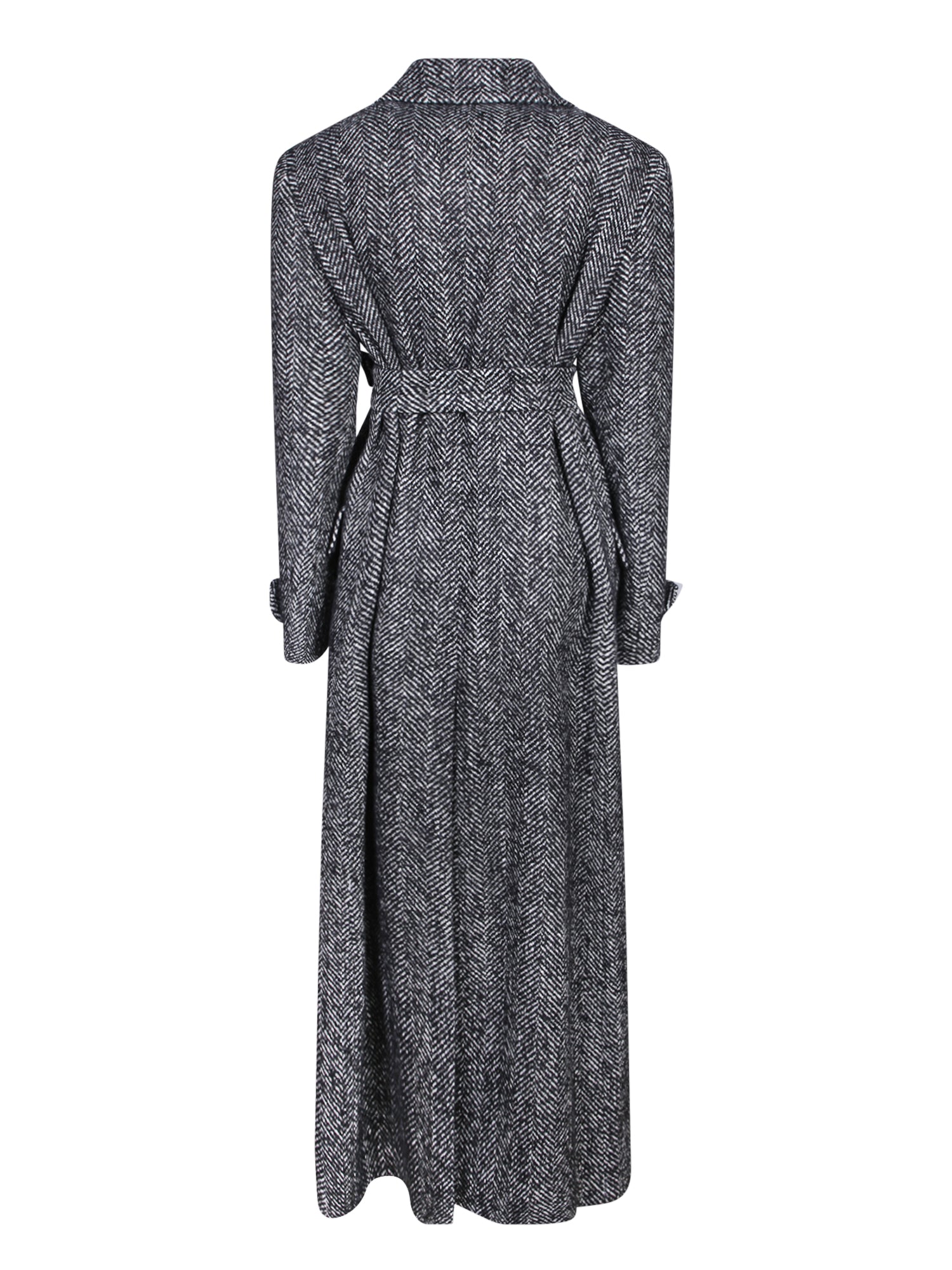 Double-breasted coat with belt. Classic lapel collar. Herringbone pattern.