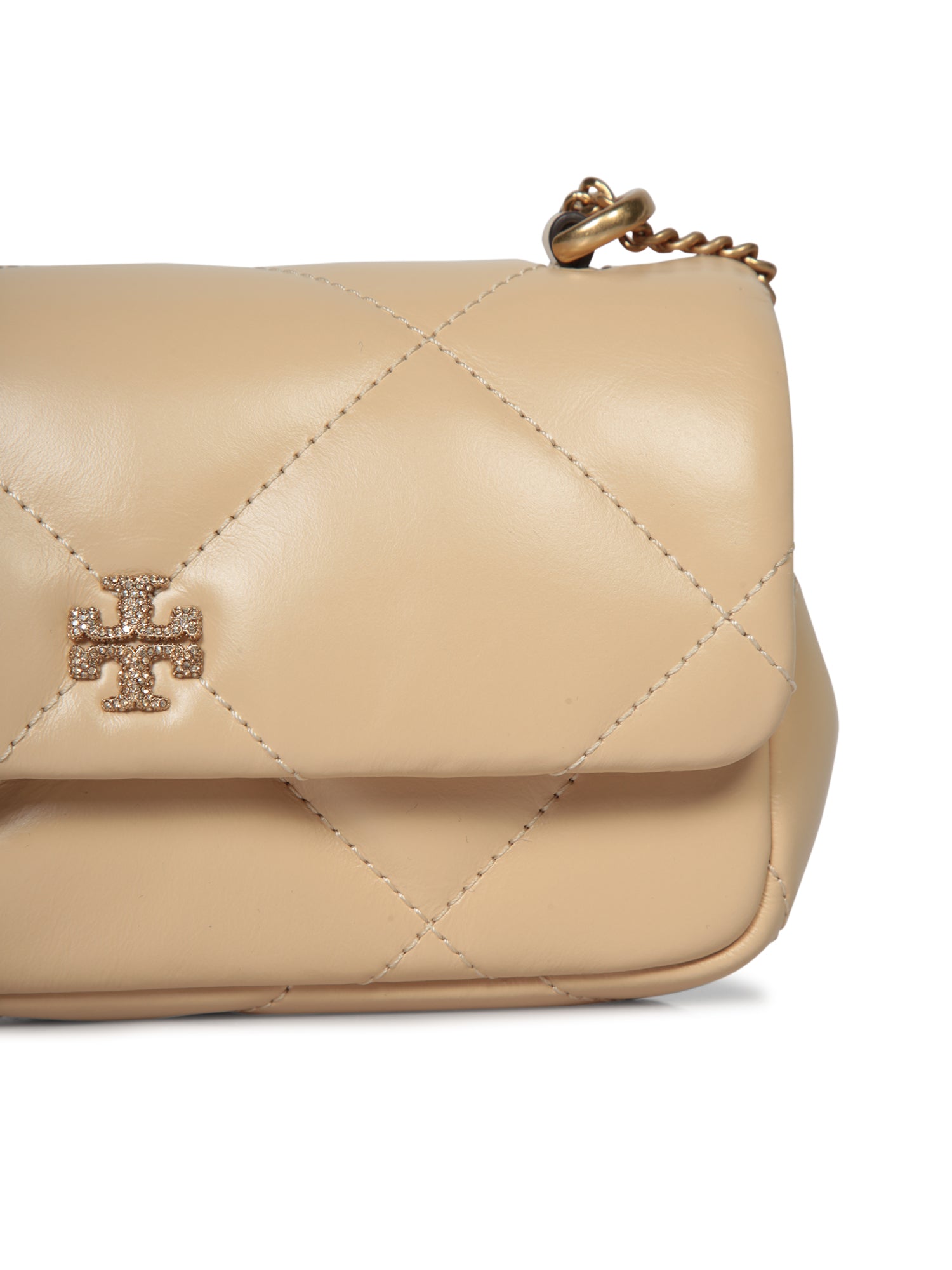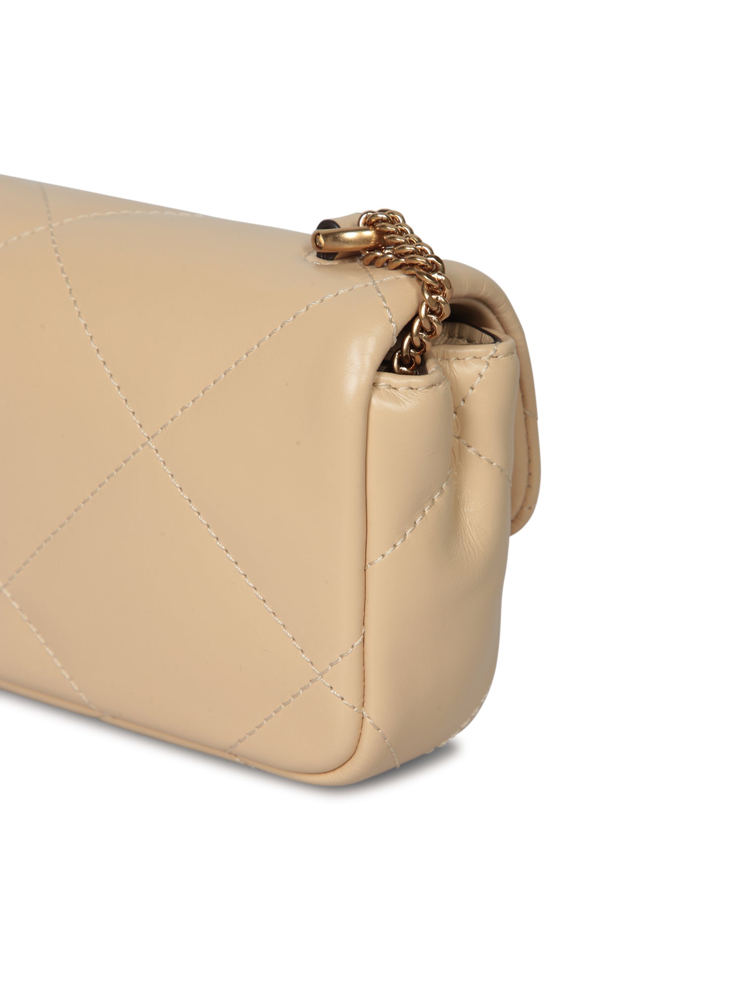 Tory Burch's Kira Diamond Mini in vanilla shade, with its elegant and distinct design, features a gold chain strap and sophisticated quilted craftsmanship.