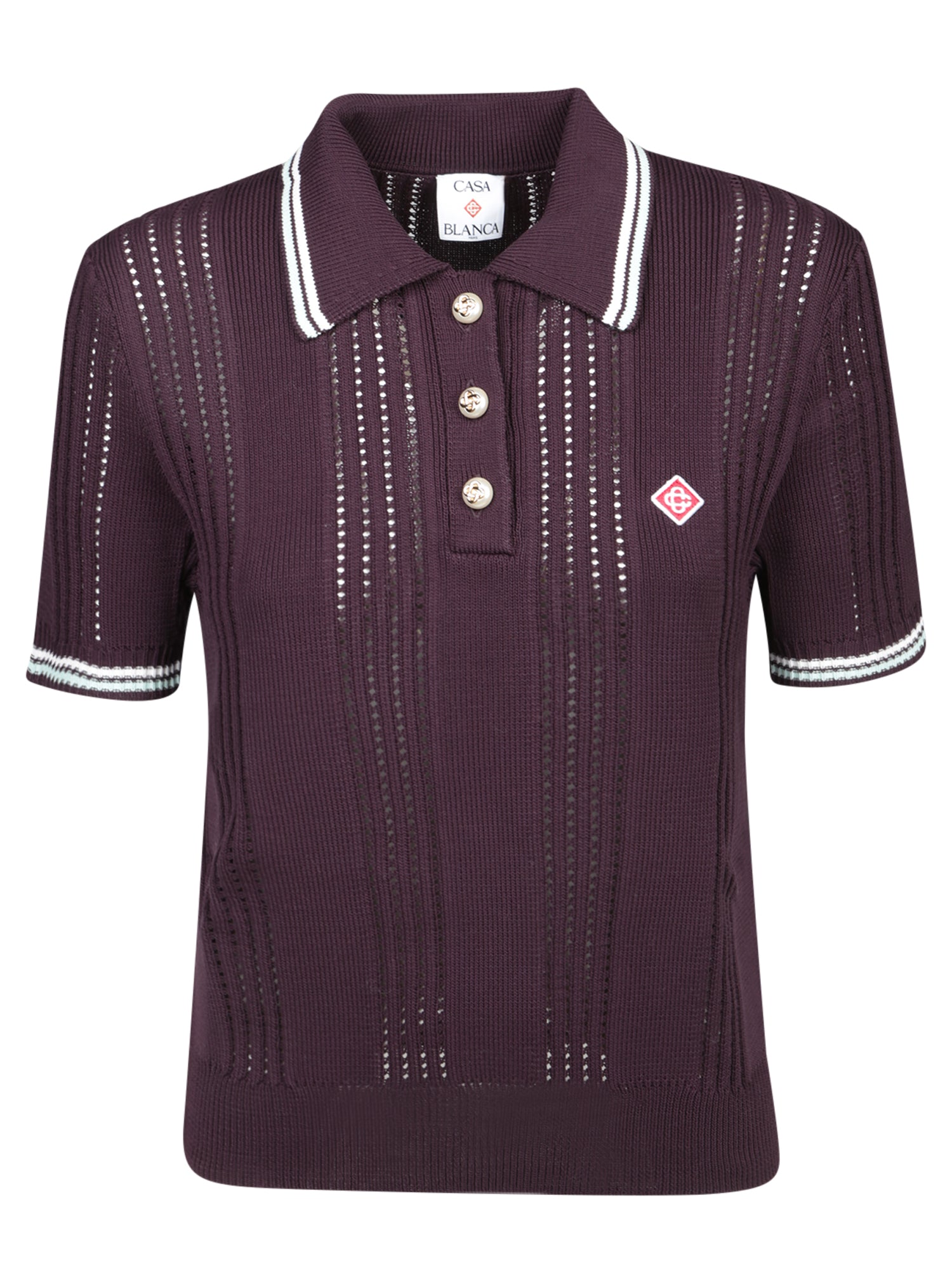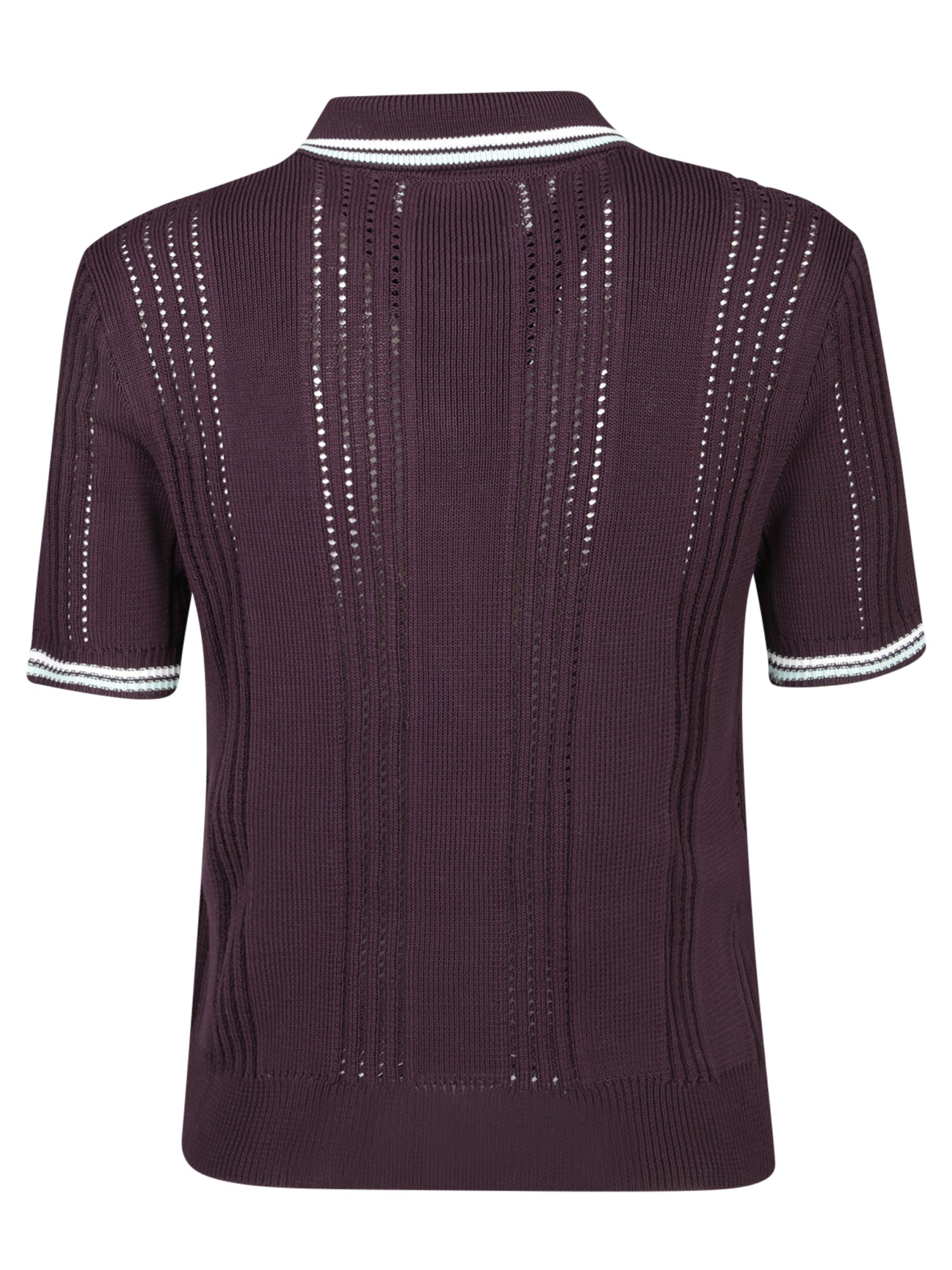 Short-sleeve knit polo. White contrast collar and sleeve edges. Front closure with three buttons.