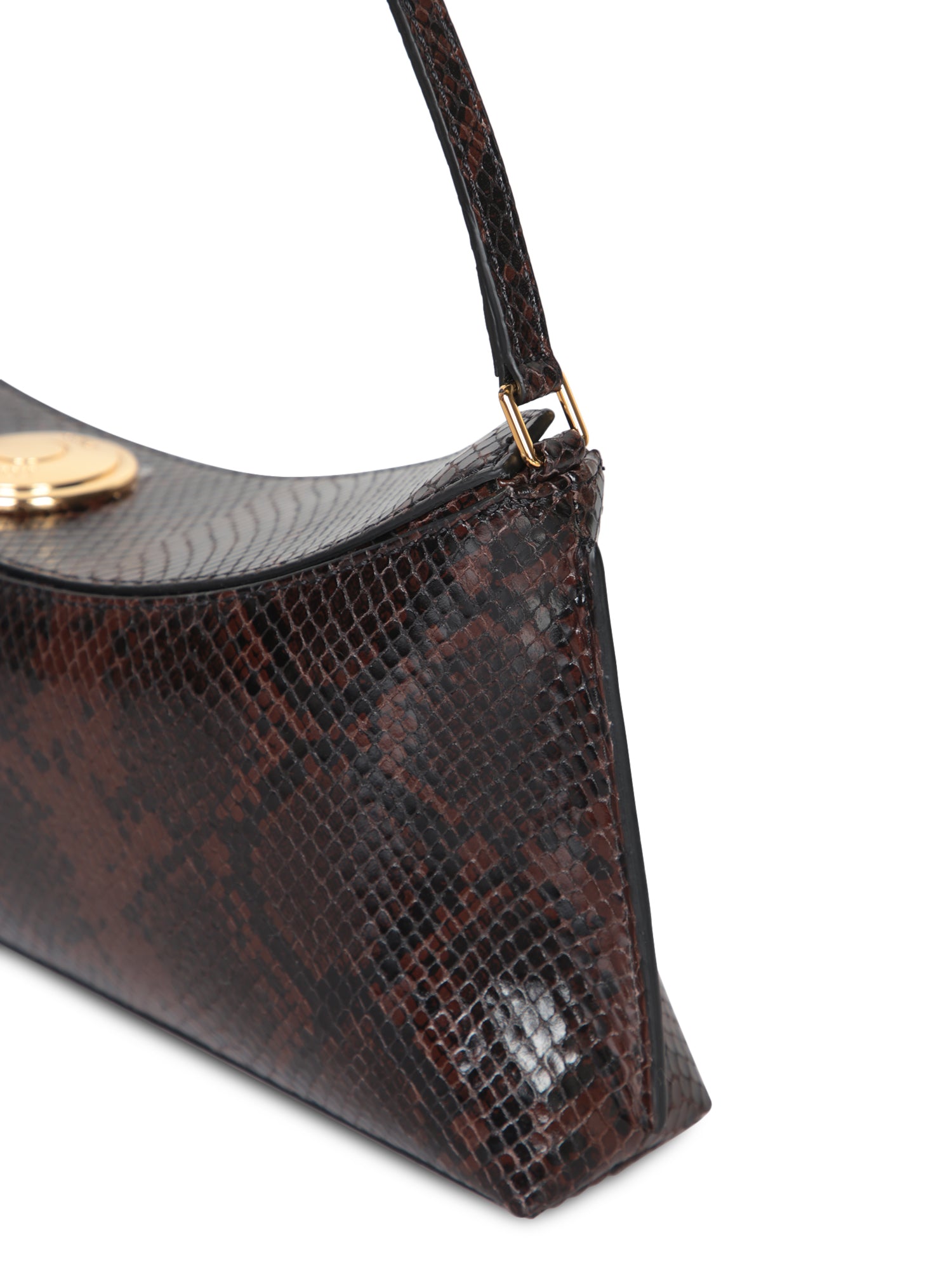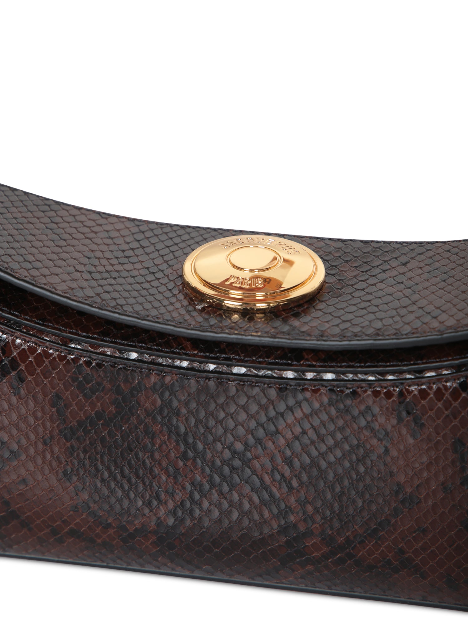 Snake print design. Golden snap button closure. Adjustable single strap.