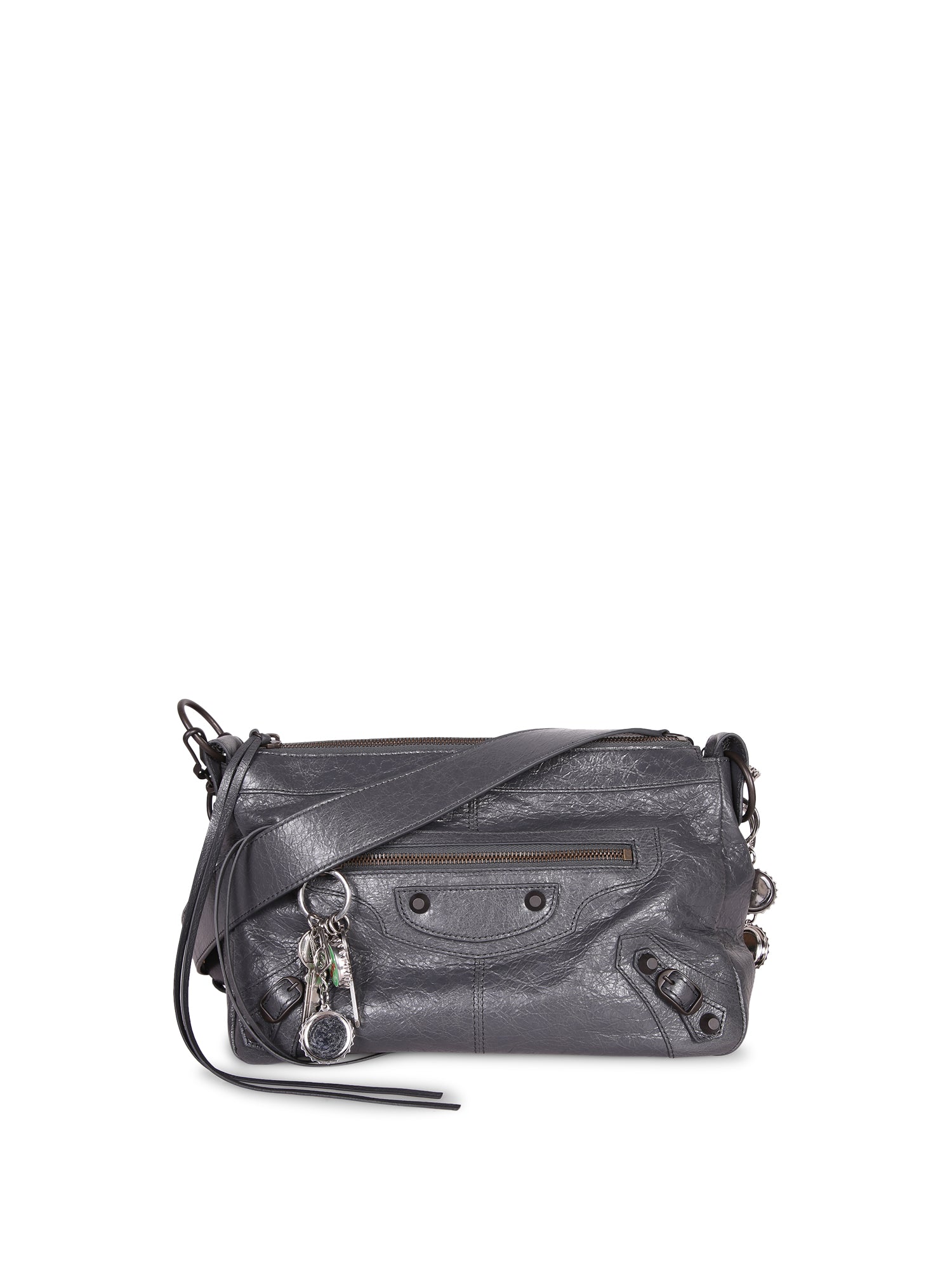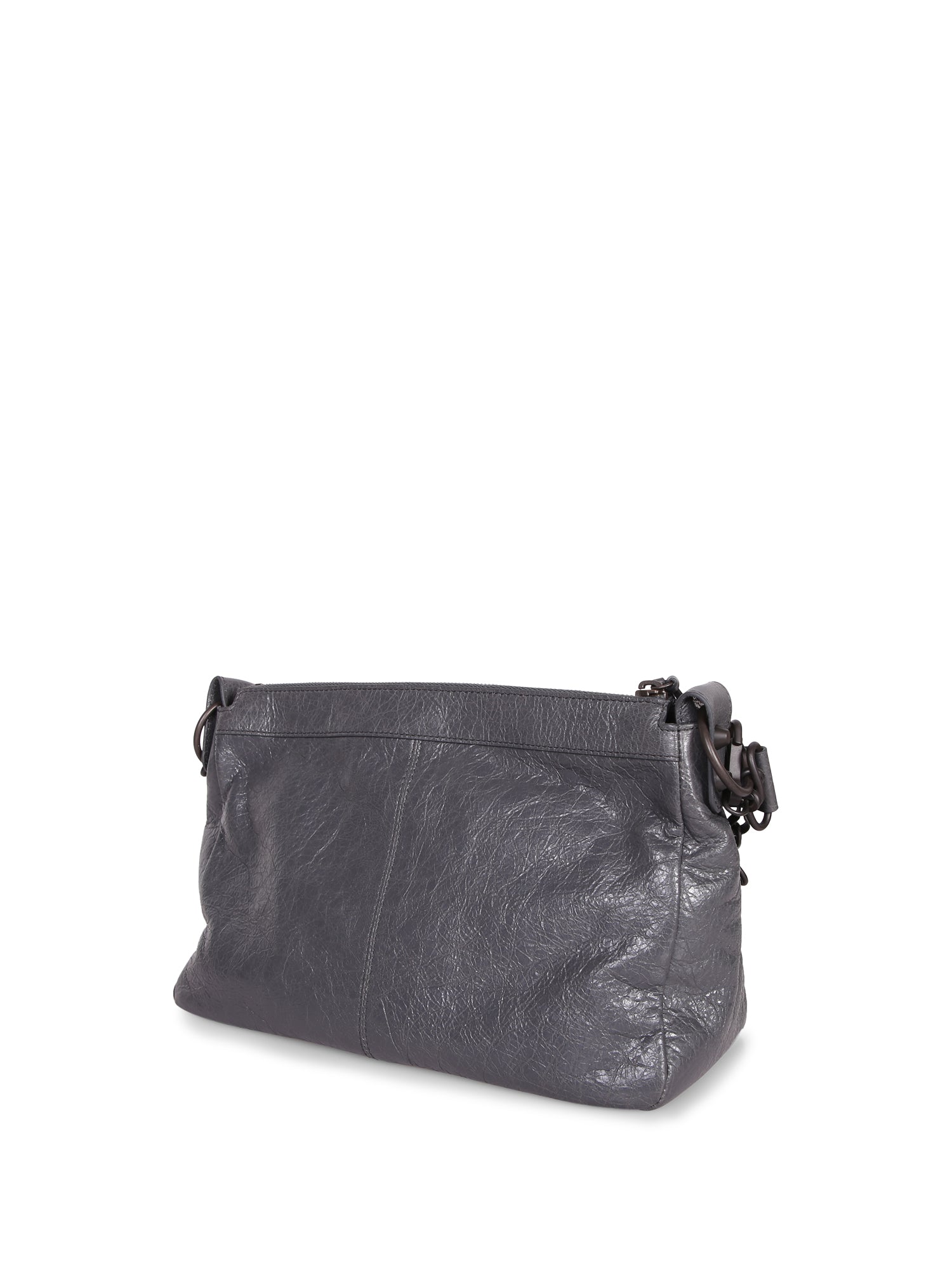 Gradient gray leather. Silver-tone hardware. Adjustable and removable shoulder strap.