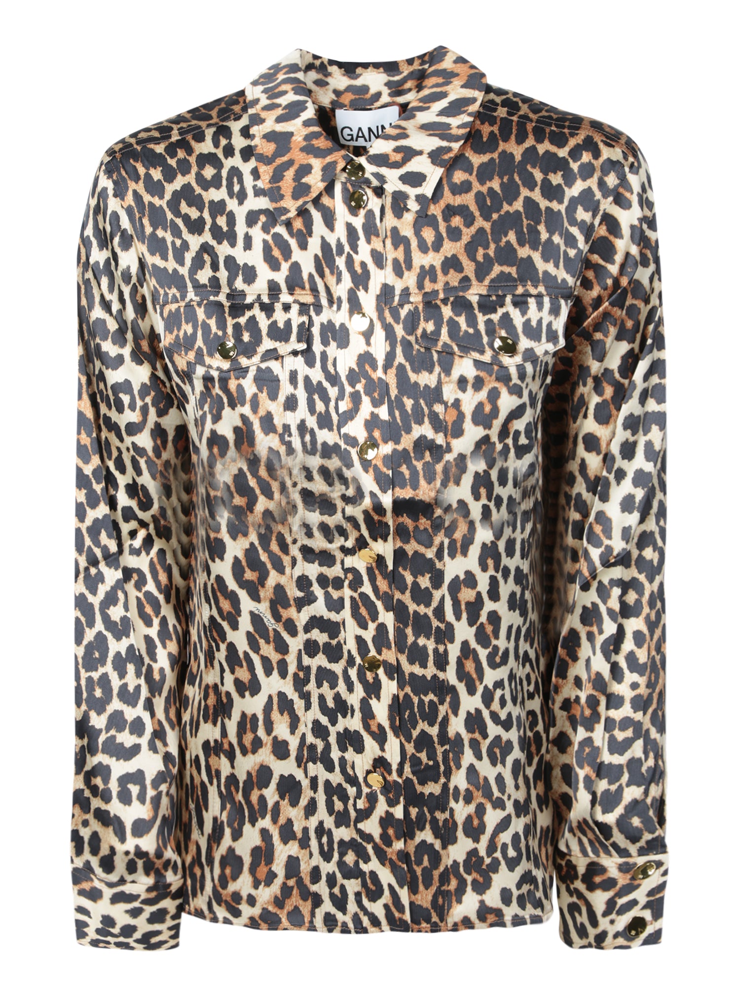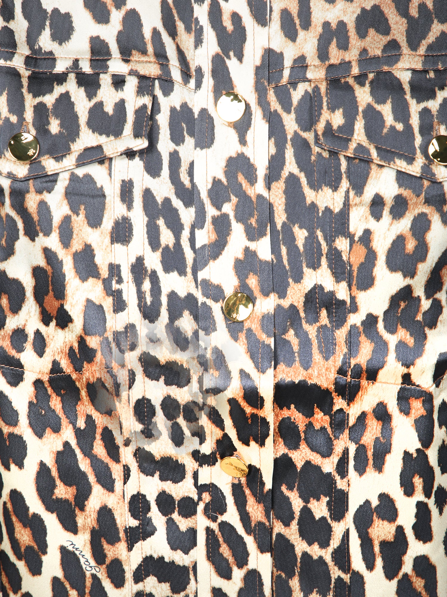 Discover casual elegance with this GANNI satin shirt, embellished with a bold leopard motif and golden buttons that lend a classy touch.