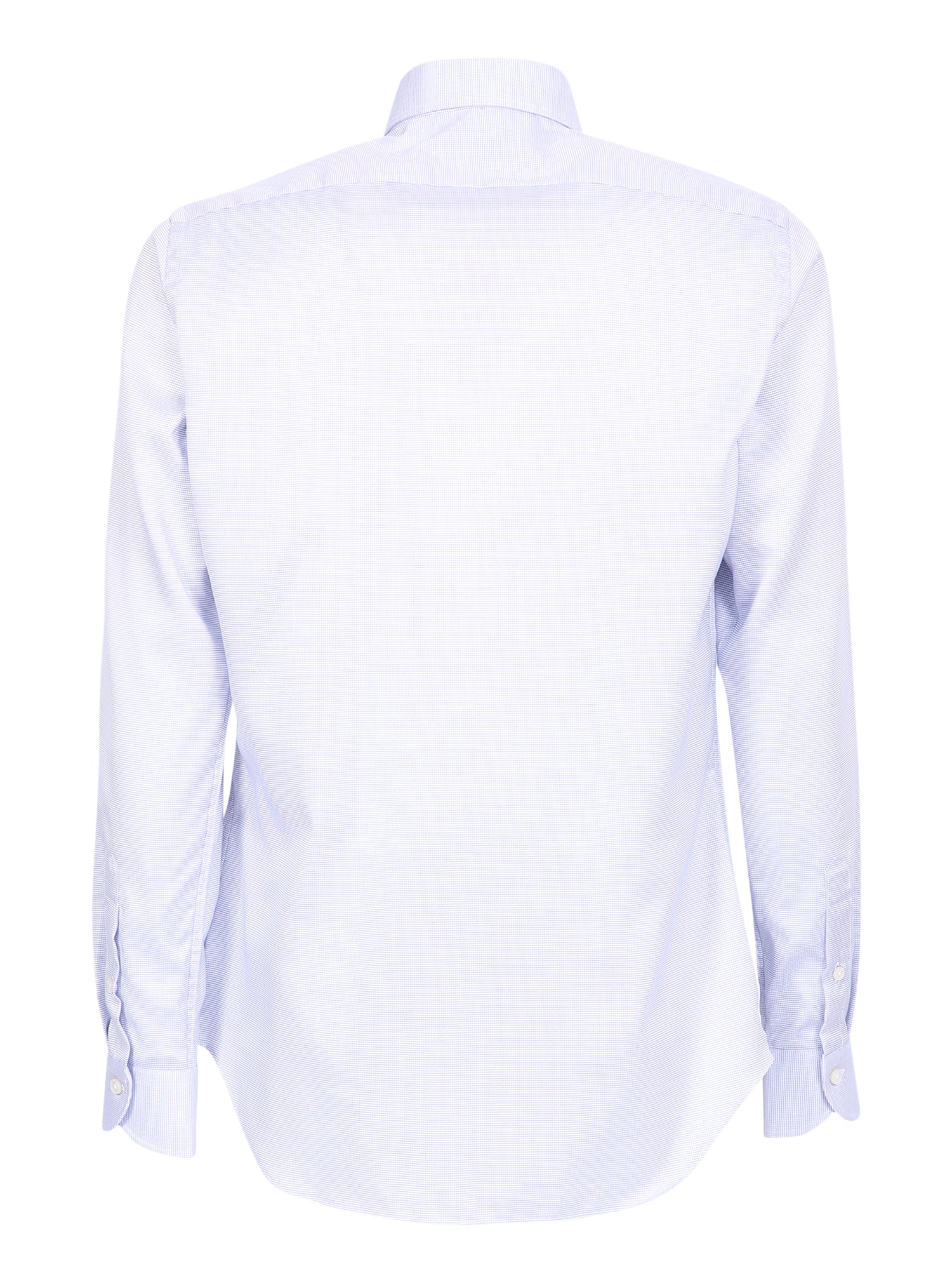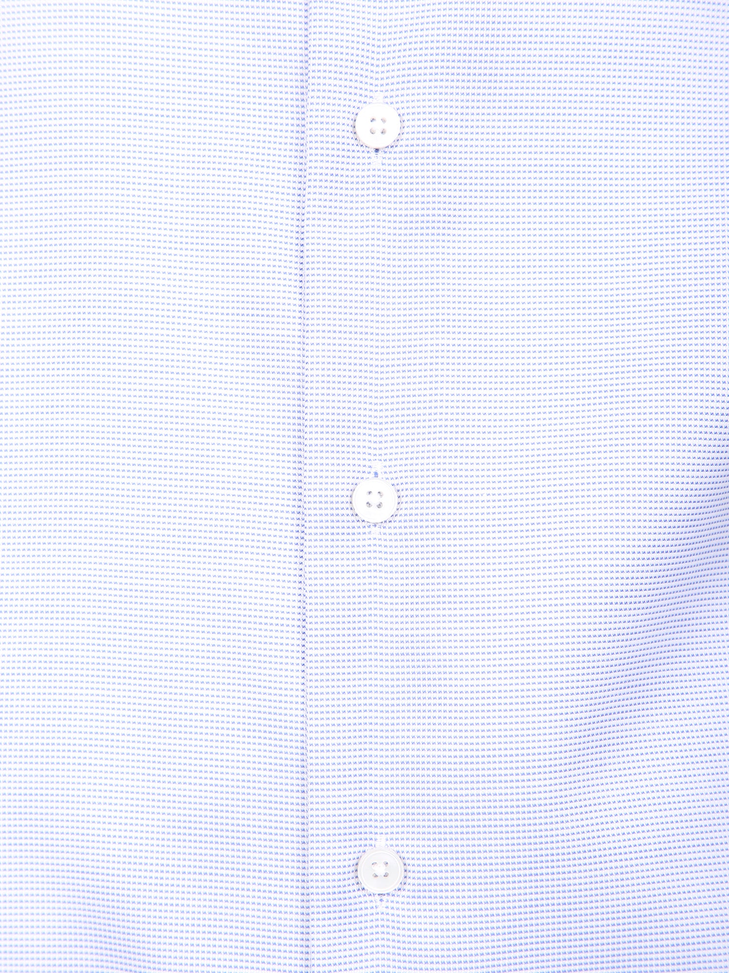 Classic collar. Front button fastening. Long sleeves. Buttoned cuffs. Micro-pattern print. Curved hem. Color: light blue/ white