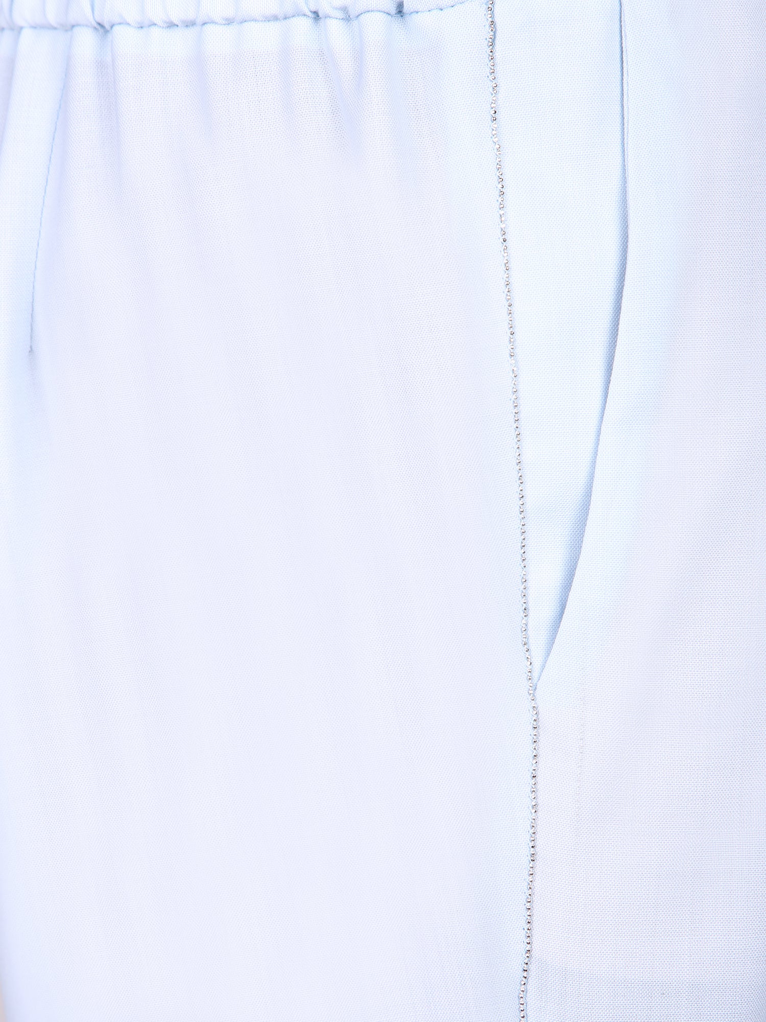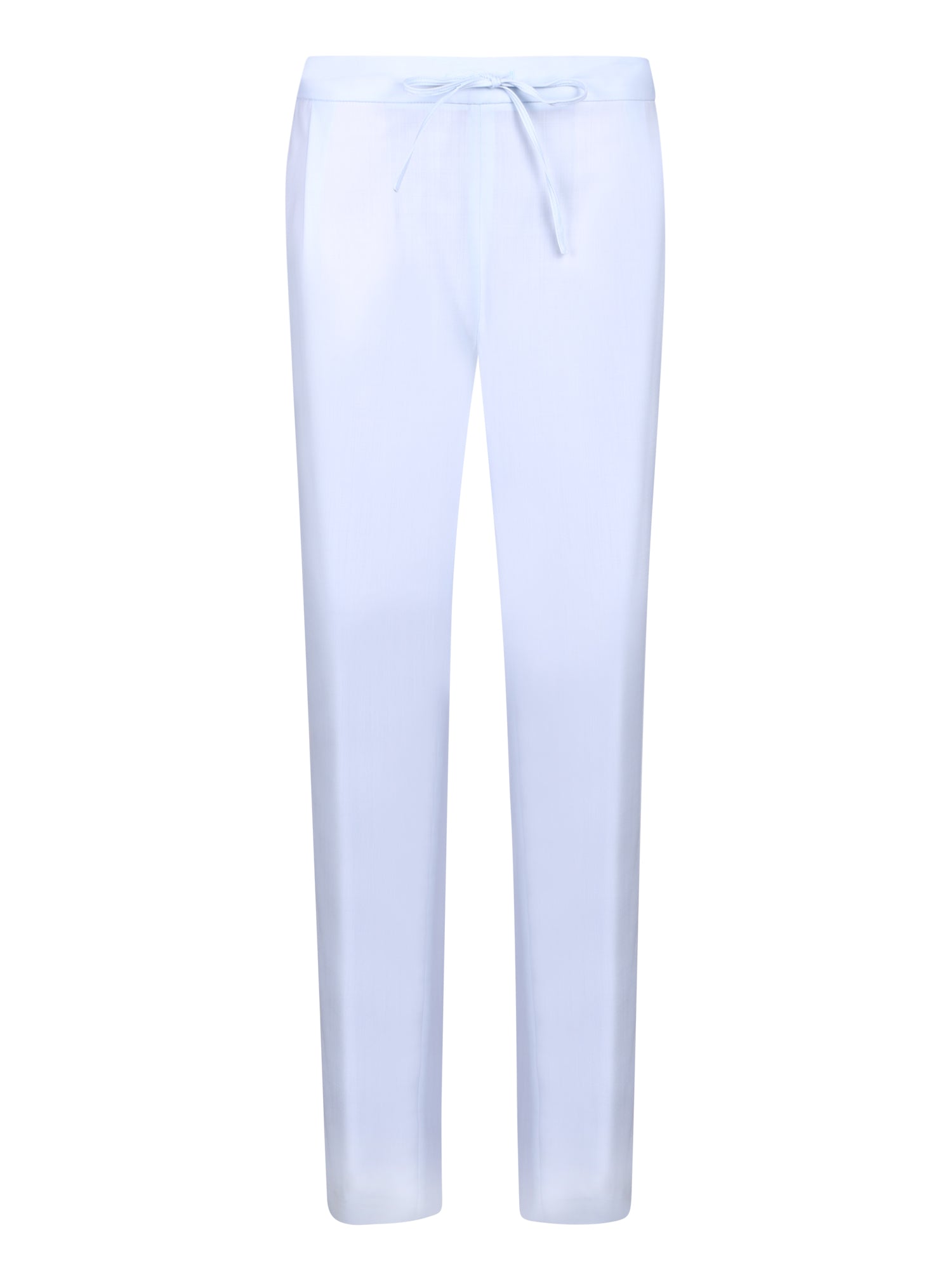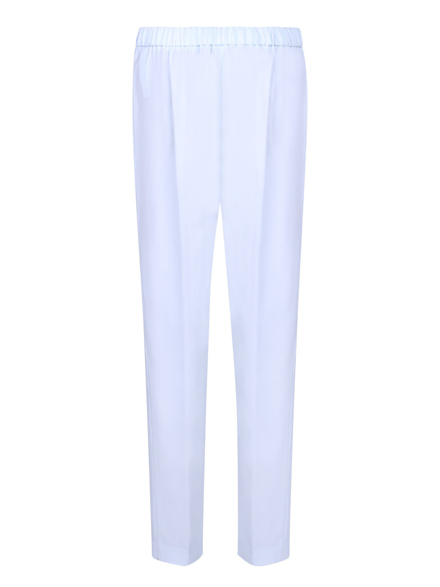 Stretch fabric trousers. Elastic waistband with drawstrings. Slim fit cut.