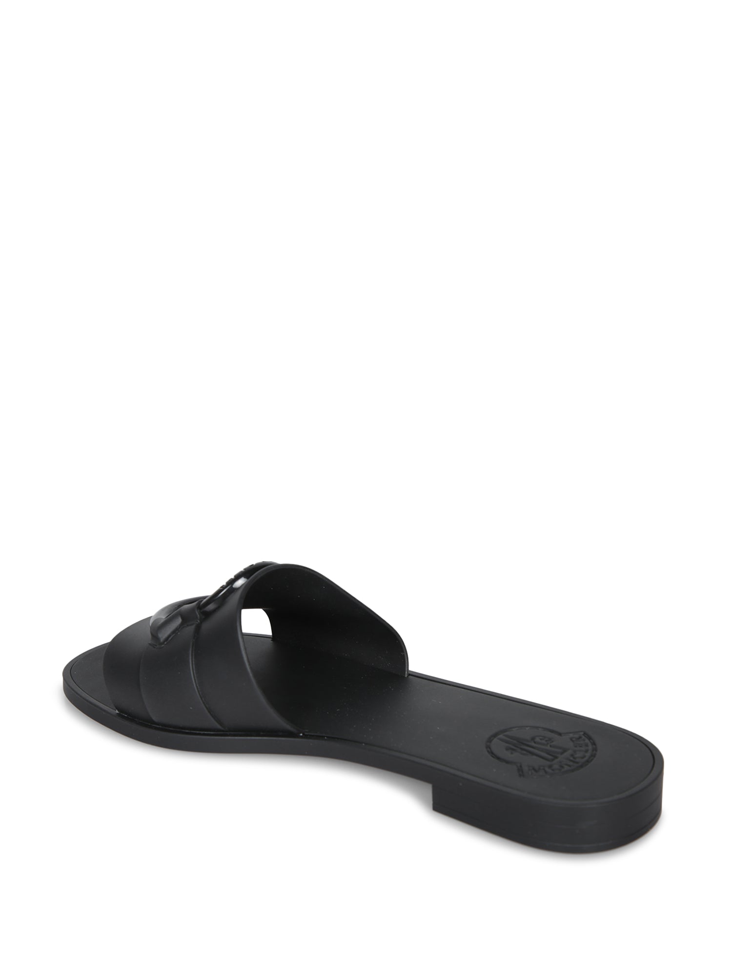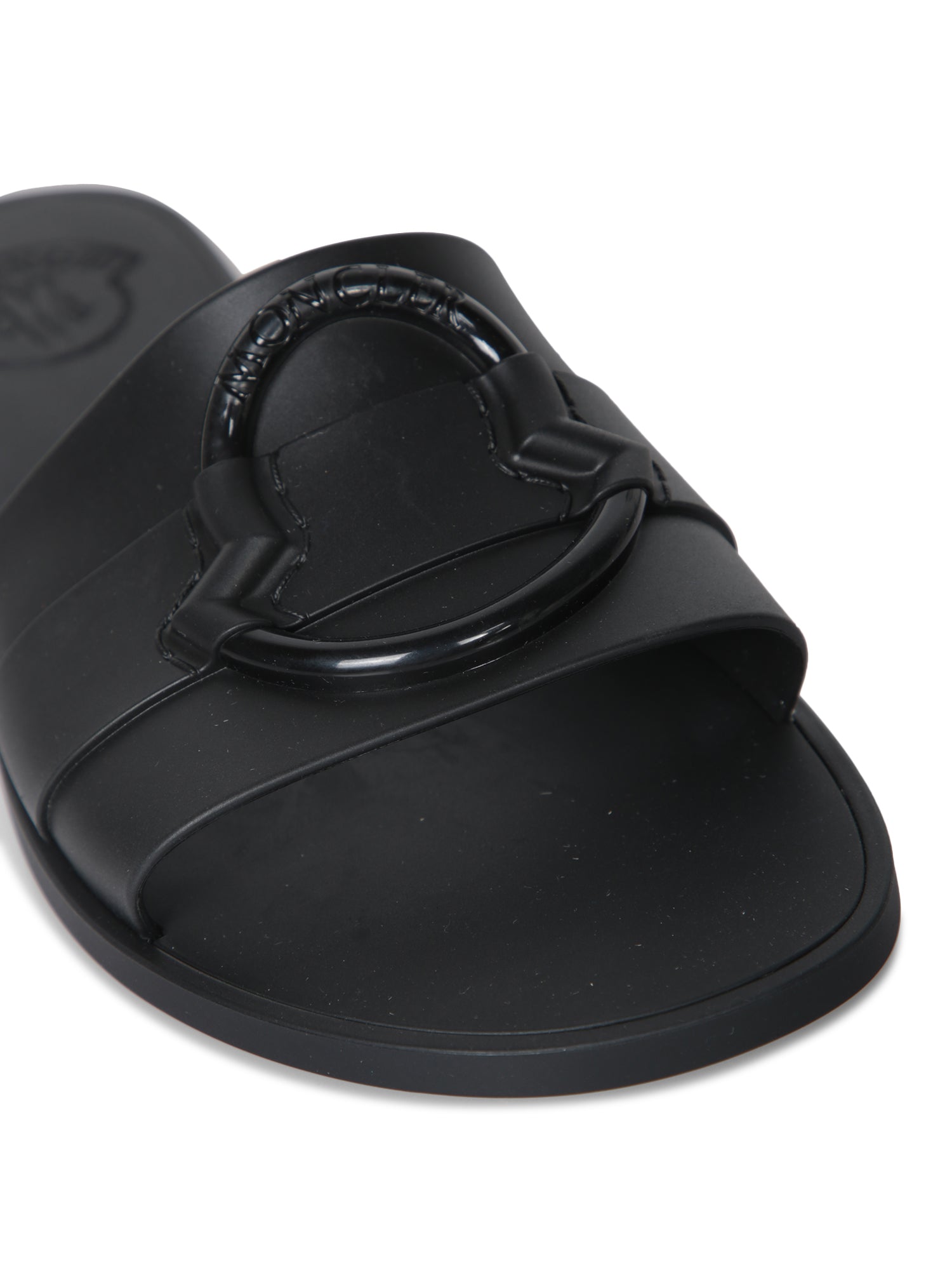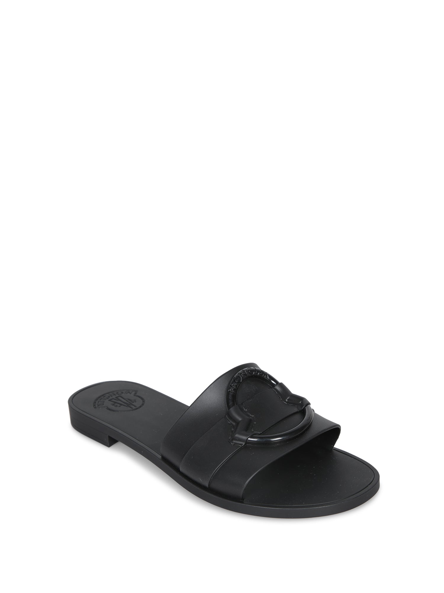 Black rubber slide sandals. Features a wide strap with an engraved Moncler logo.
